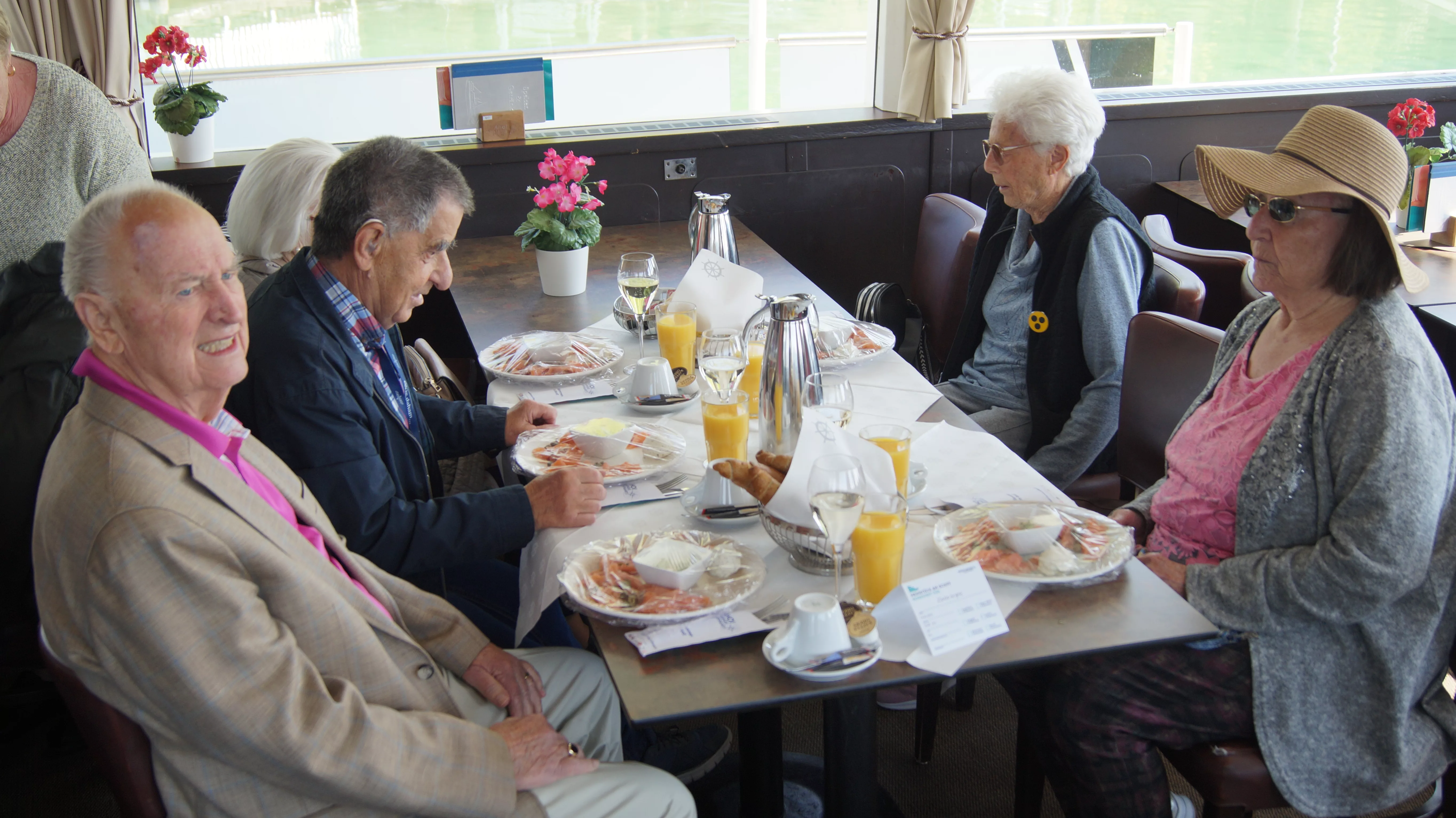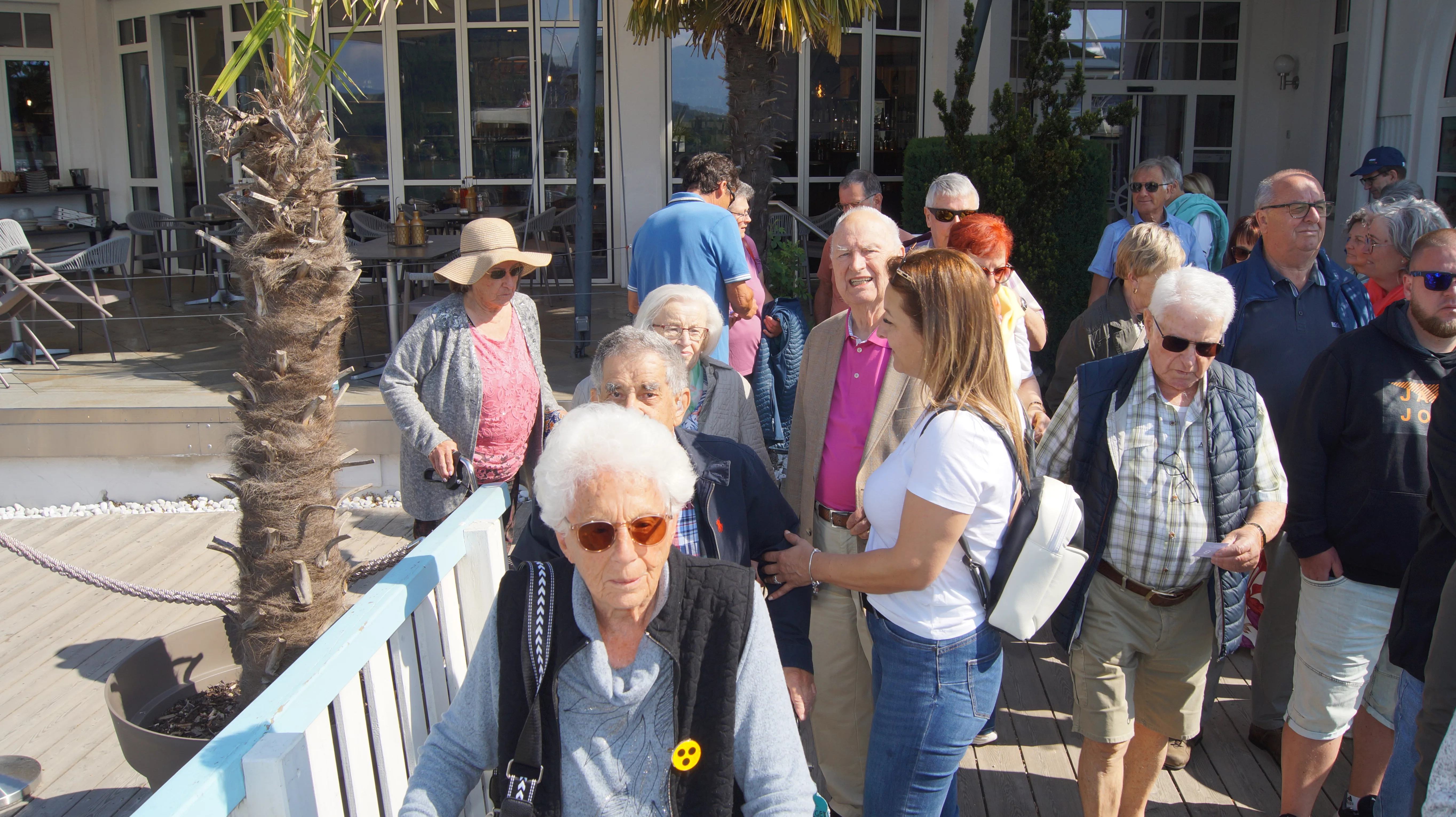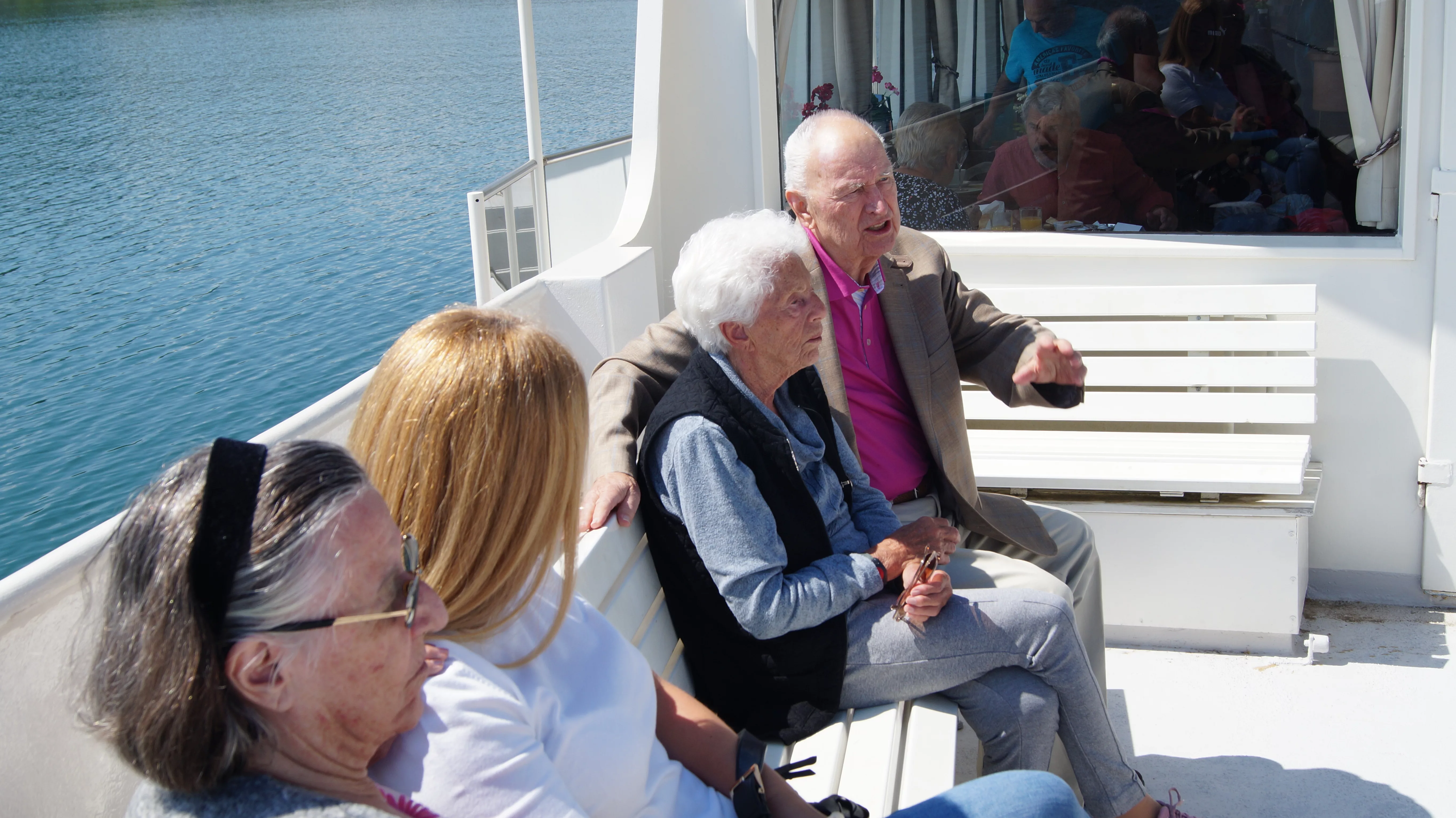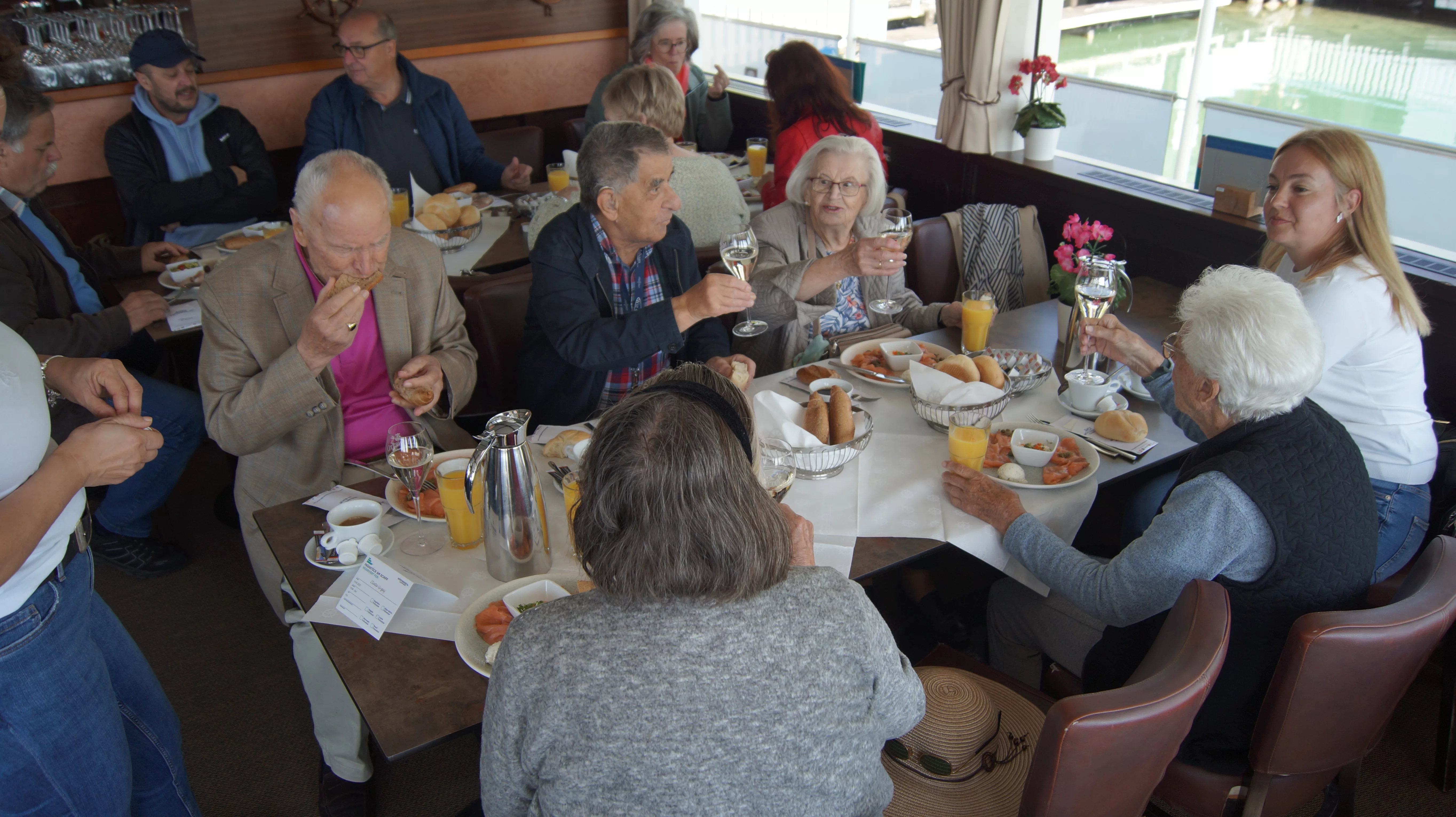 Während der Fahrt genossen unsere Bewohner ein wunderbares Frühstück mit Lachs und Sekt. Es wurden viele Erinnerungen geteilt – beispielsweise, wie die Orte früher aussahen, was man dort erlebt hat und wie sehr sich alles im Laufe der Jahre verändert hat.