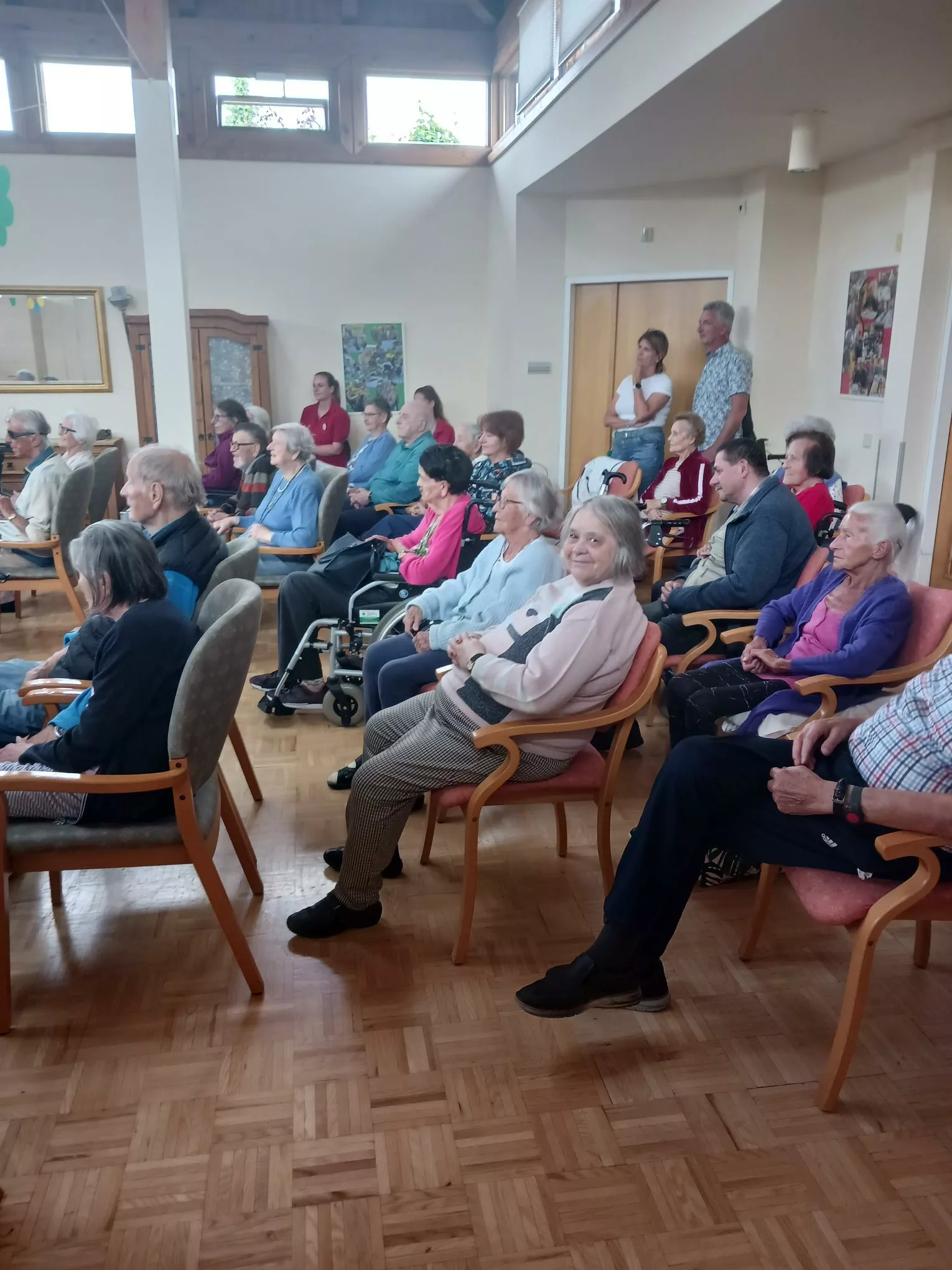 Begrüßt wurden die Bewohnerinnen und Bewohner, ihre Angehörigen sowie die Künstler von unserem Eigentümer und Geschäftsführer Herr KommR Otto Scheiflinger und von unserer Heimleiterin Frau Tanzer Sandra. In seiner Eröffnungsrede sprach Herr Scheiflinger von der Entstehungsidee dieses Konzerts, die gemeinsam mit Herrn Richi Die Bernardo entstand. Nicht alle Bewohner haben die Möglichkeit, kulturelle Veranstaltungen außerhalb unseres Hauses zu besuchen, genau aus diesem Grund wurde dieses Konzert zu uns geholt, um Freude und Teilhabe zu ermöglichen.