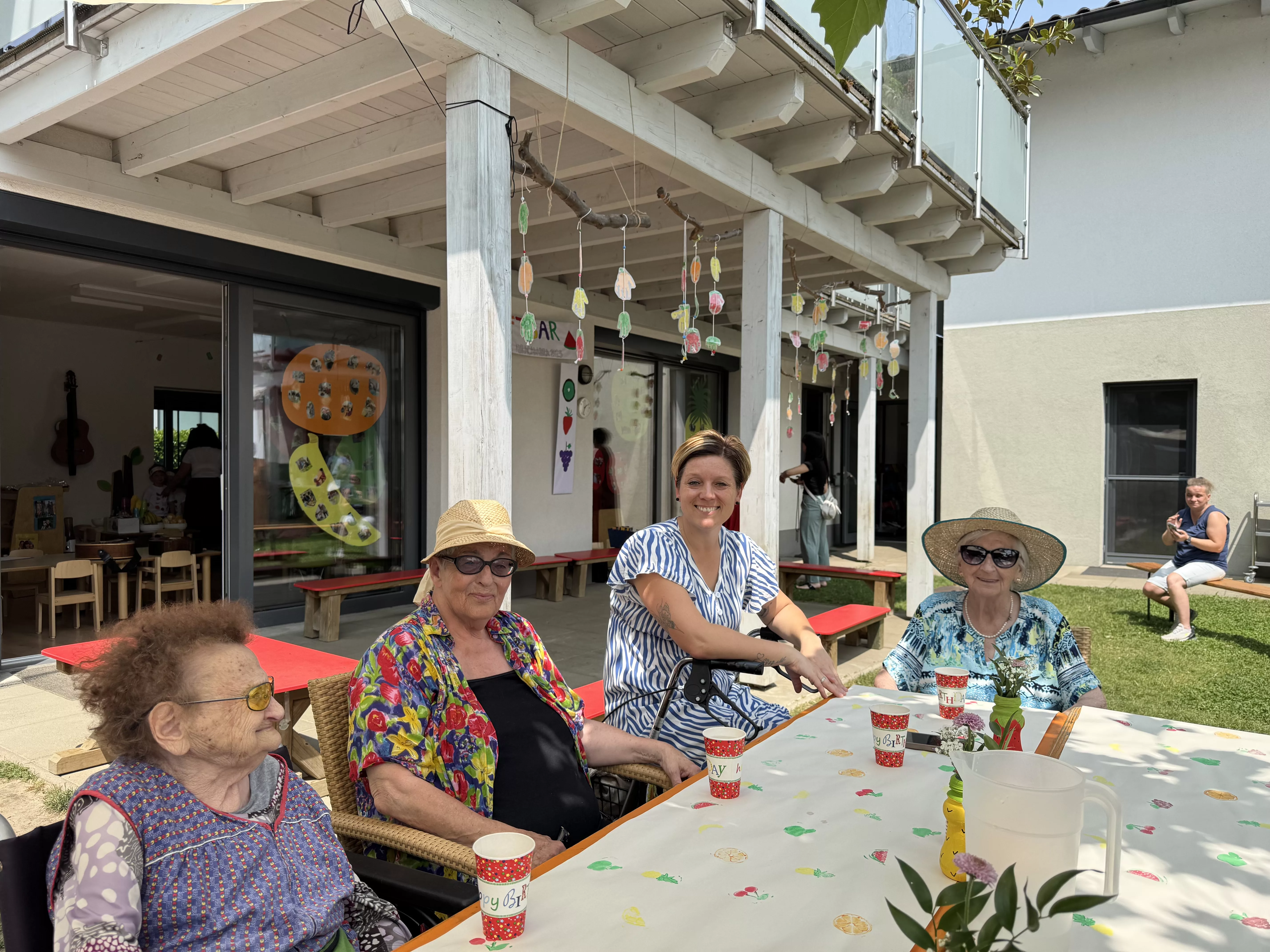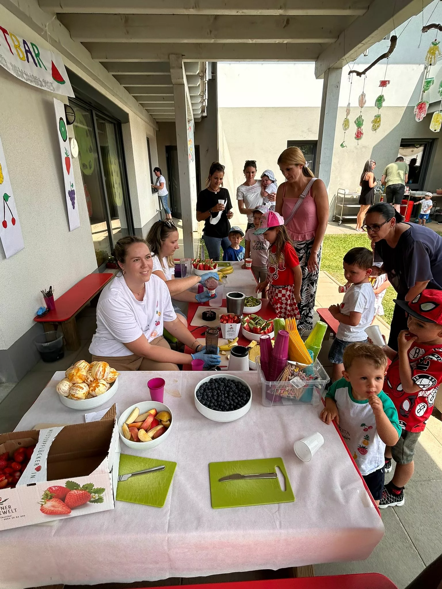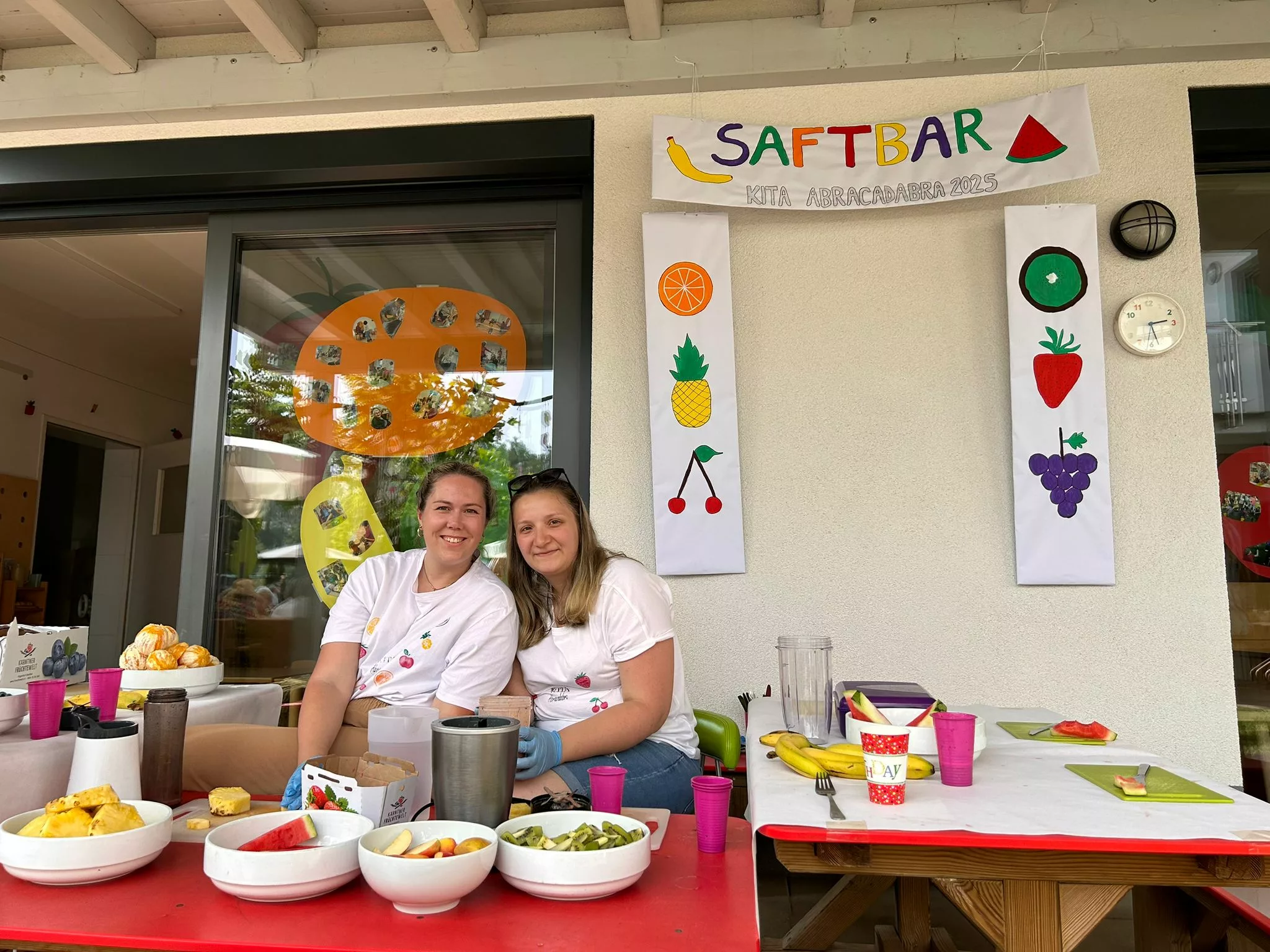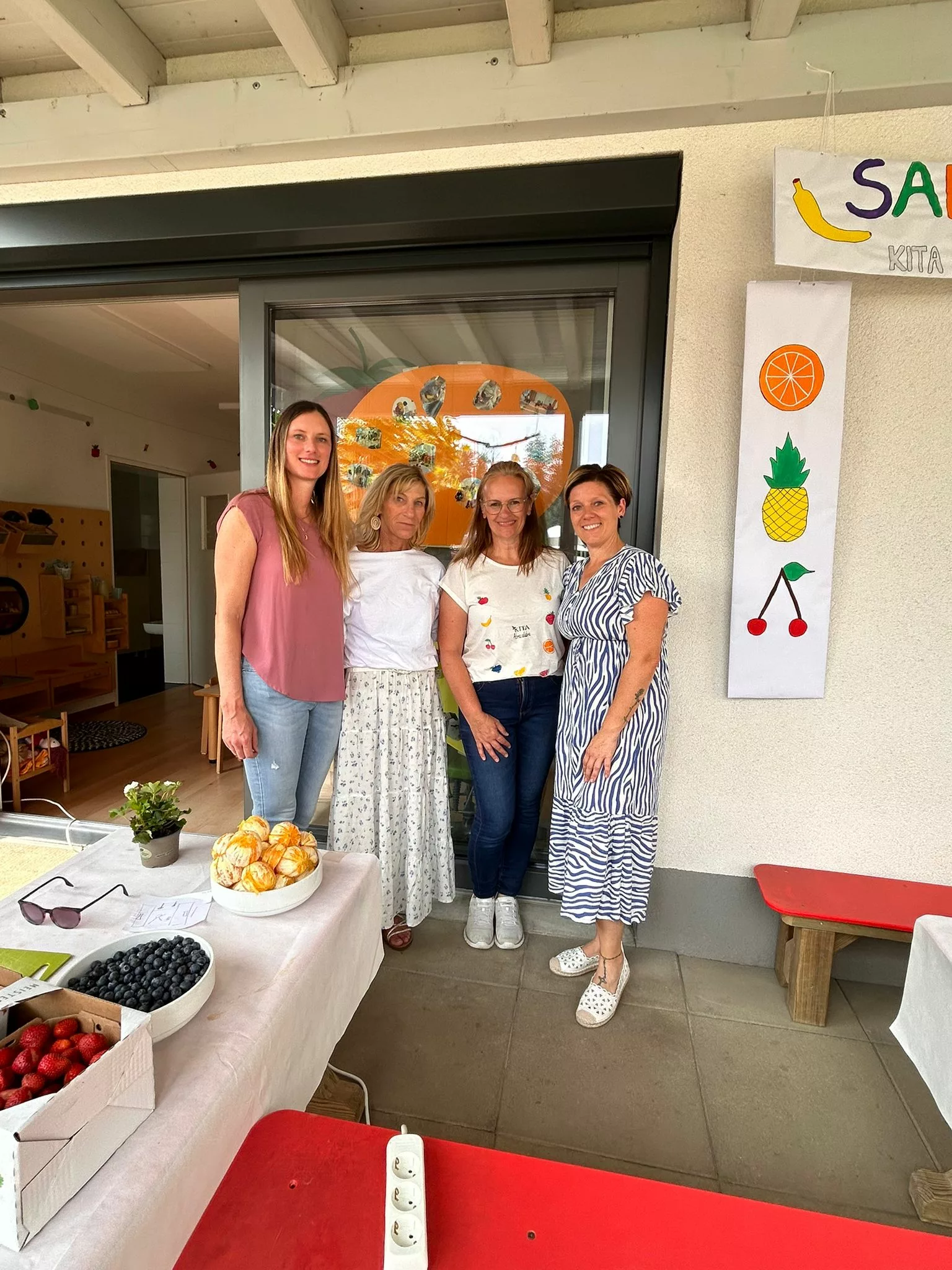 Schon bei unserer Ankunft wurden wir herzlich empfangen. Für uns war ein liebevoll dekorierter Tisch vorbereitet, geschmückt ganz im Motto des Tages: „Tutti Frutti“. Überall fanden sich gestempelte Früchte, auf der Tischdecke, in kleinen Schachteln, die in den Bäumen hingen, und in vielen kleinen Details, die den Tag bunt und fröhlich machten.