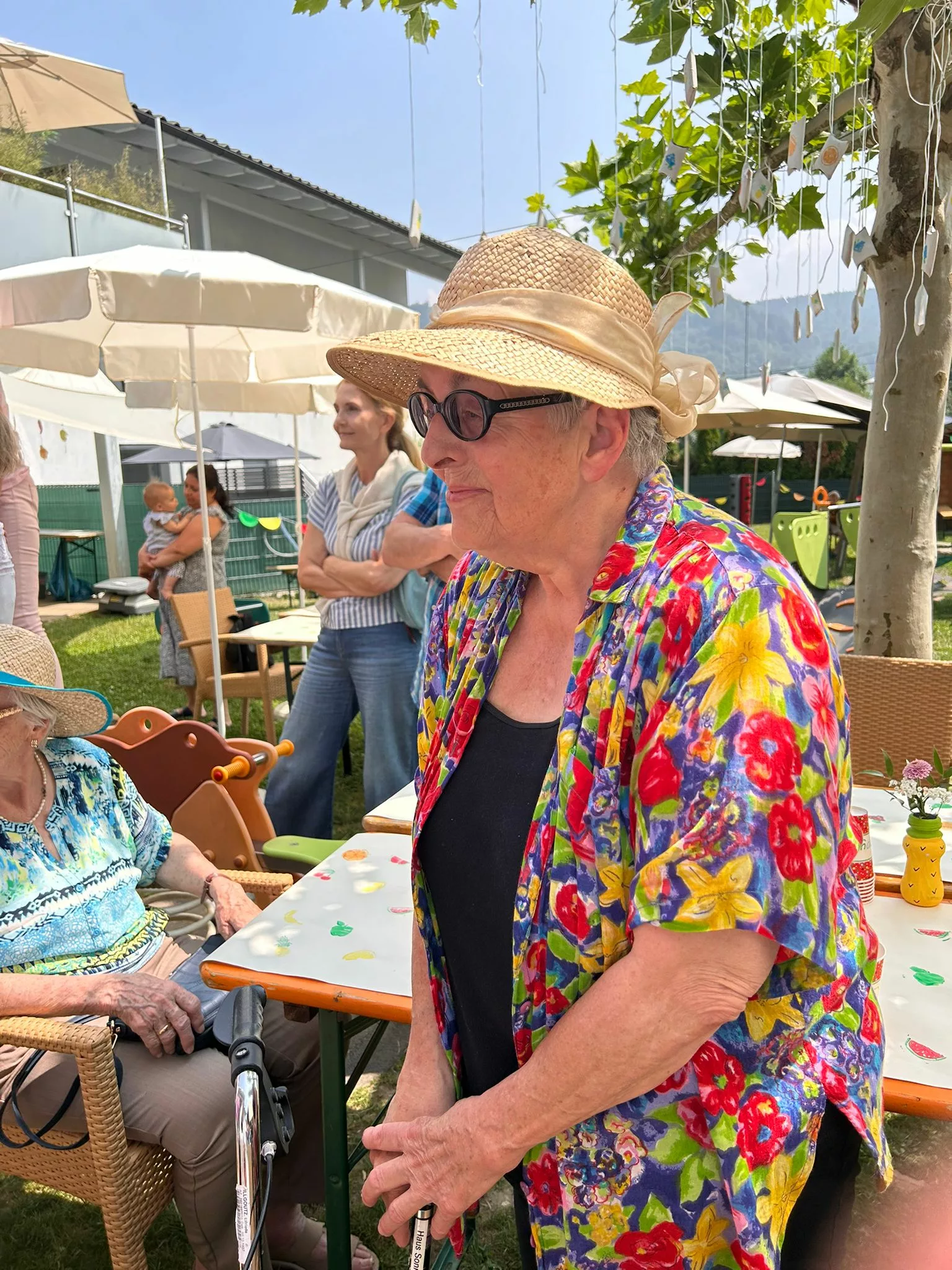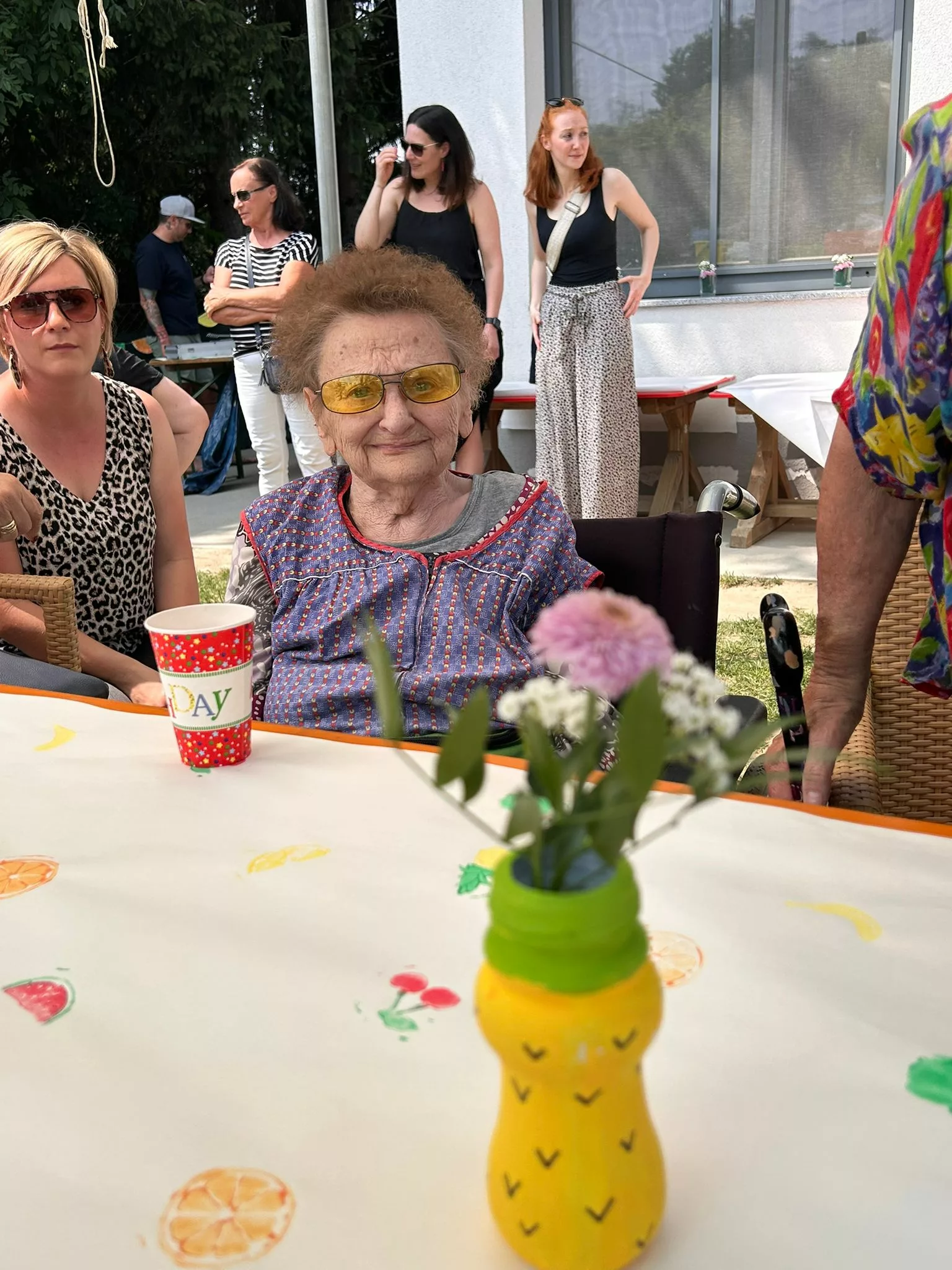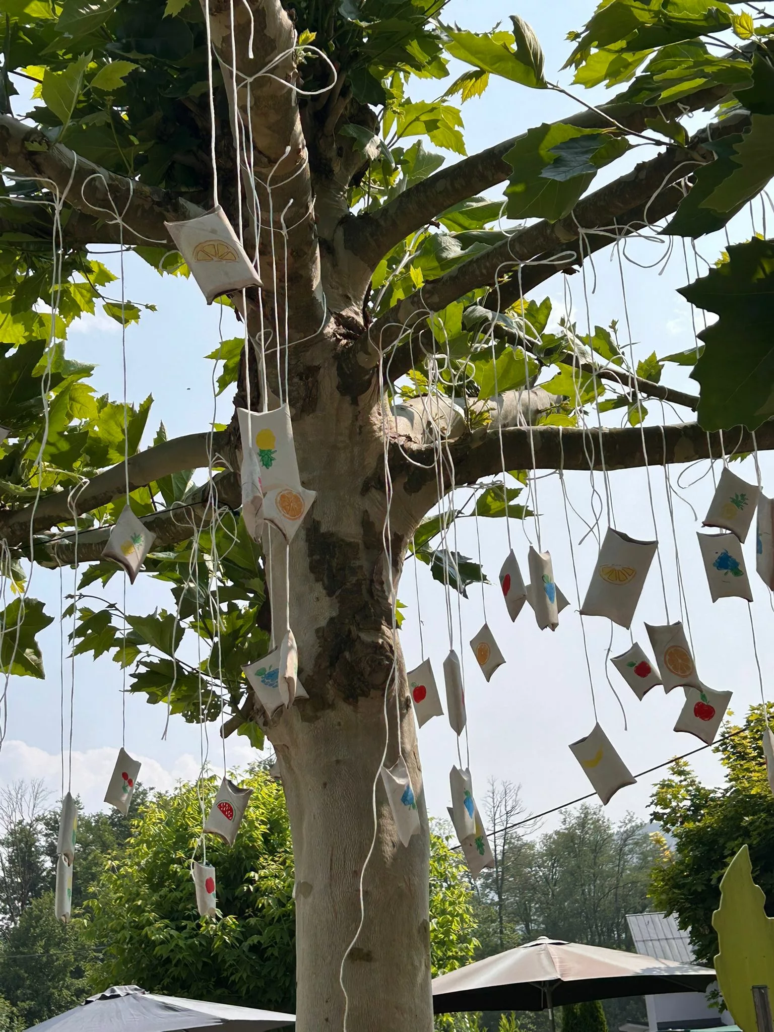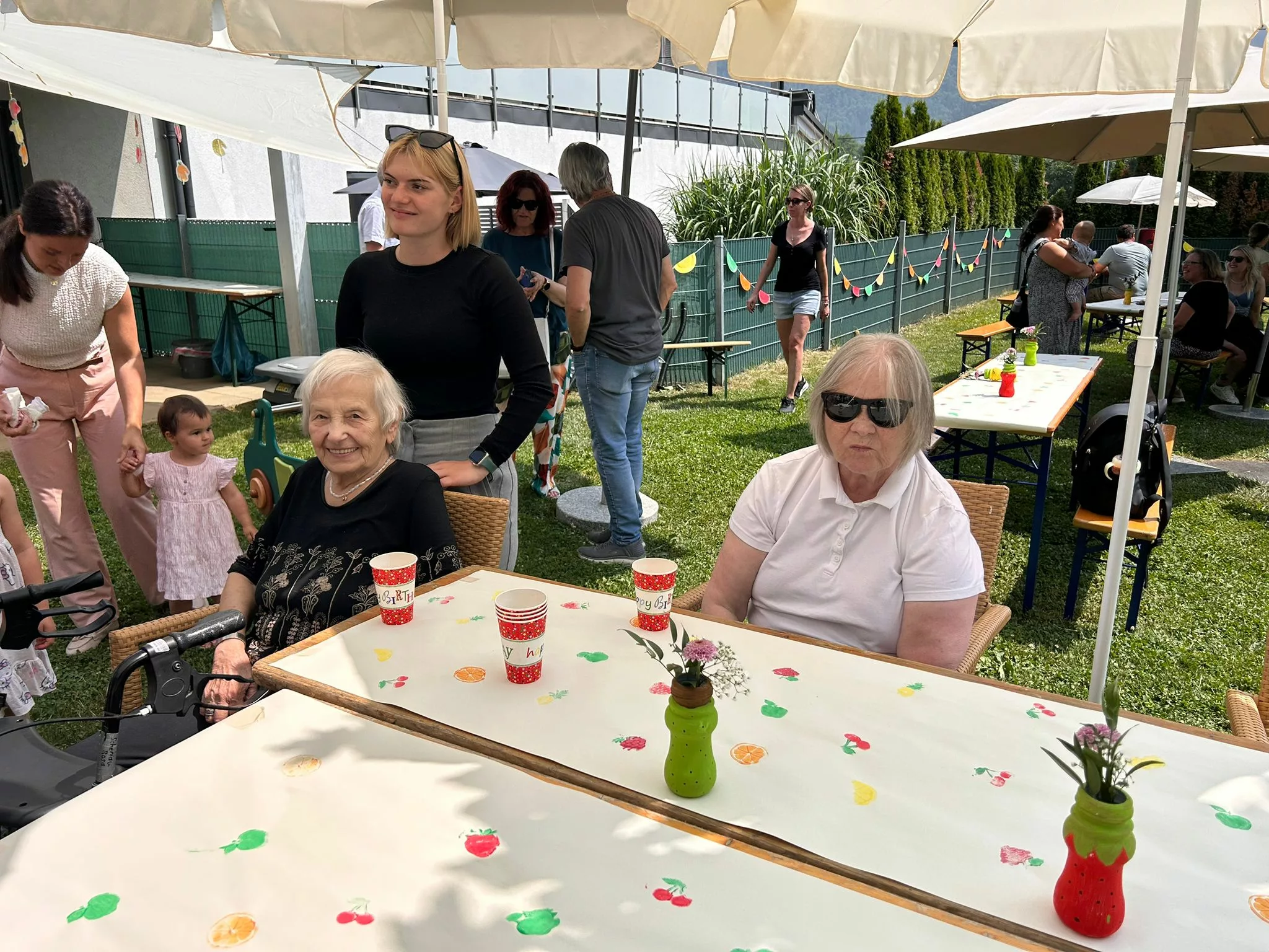 Schon bei unserer Ankunft wurden wir herzlich empfangen. Für uns war ein liebevoll dekorierter Tisch vorbereitet, geschmückt ganz im Motto des Tages: „Tutti Frutti“. Überall fanden sich gestempelte Früchte, auf der Tischdecke, in kleinen Schachteln, die in den Bäumen hingen, und in vielen kleinen Details, die den Tag bunt und fröhlich machten.