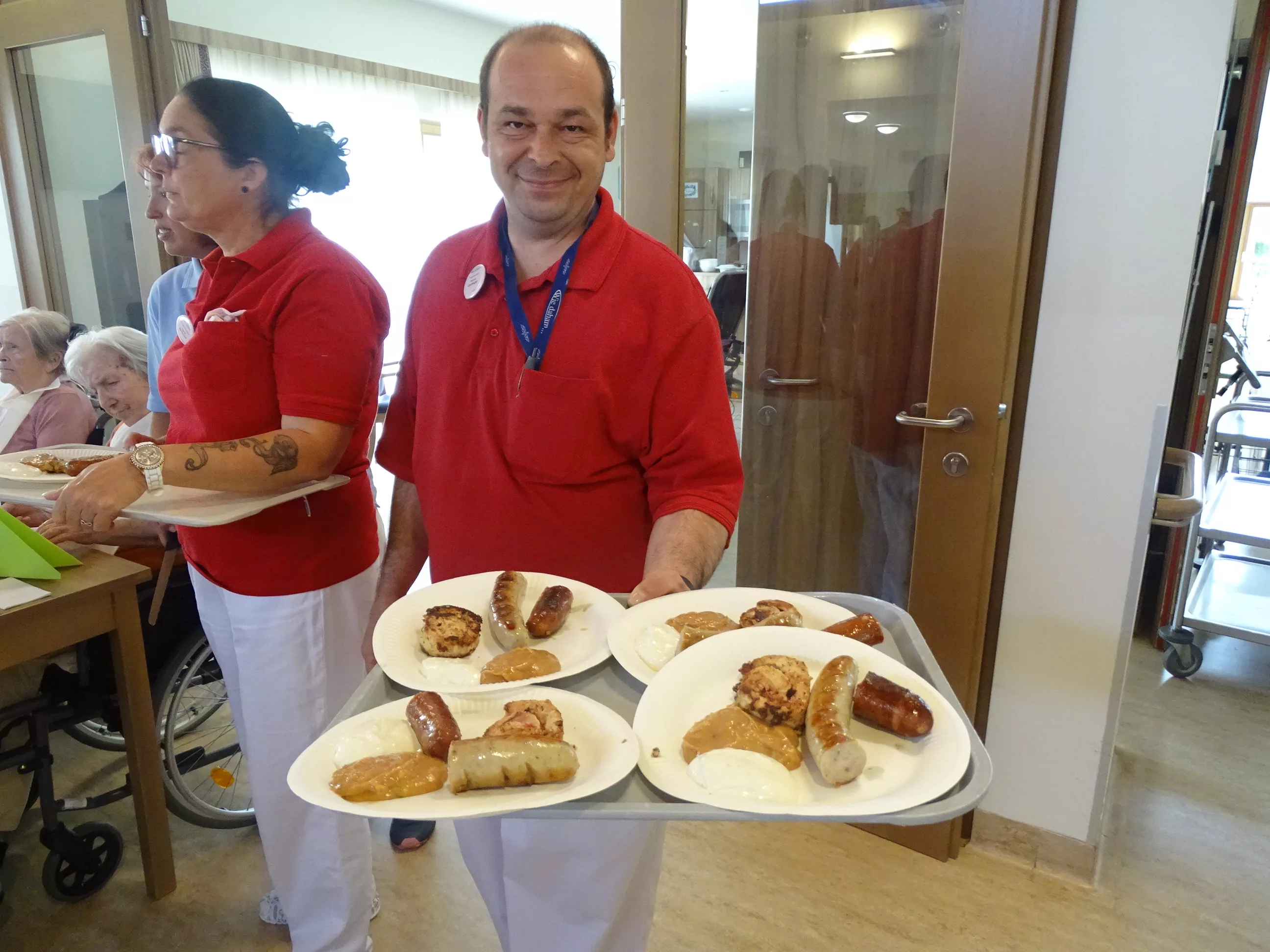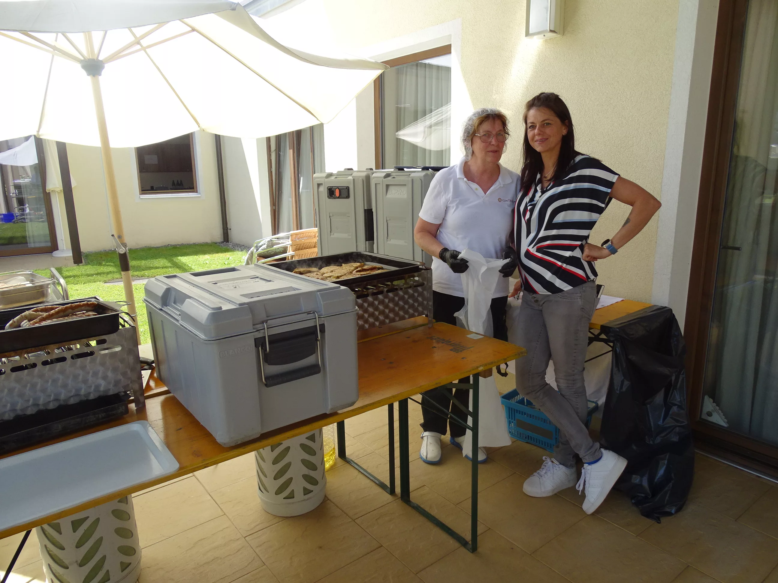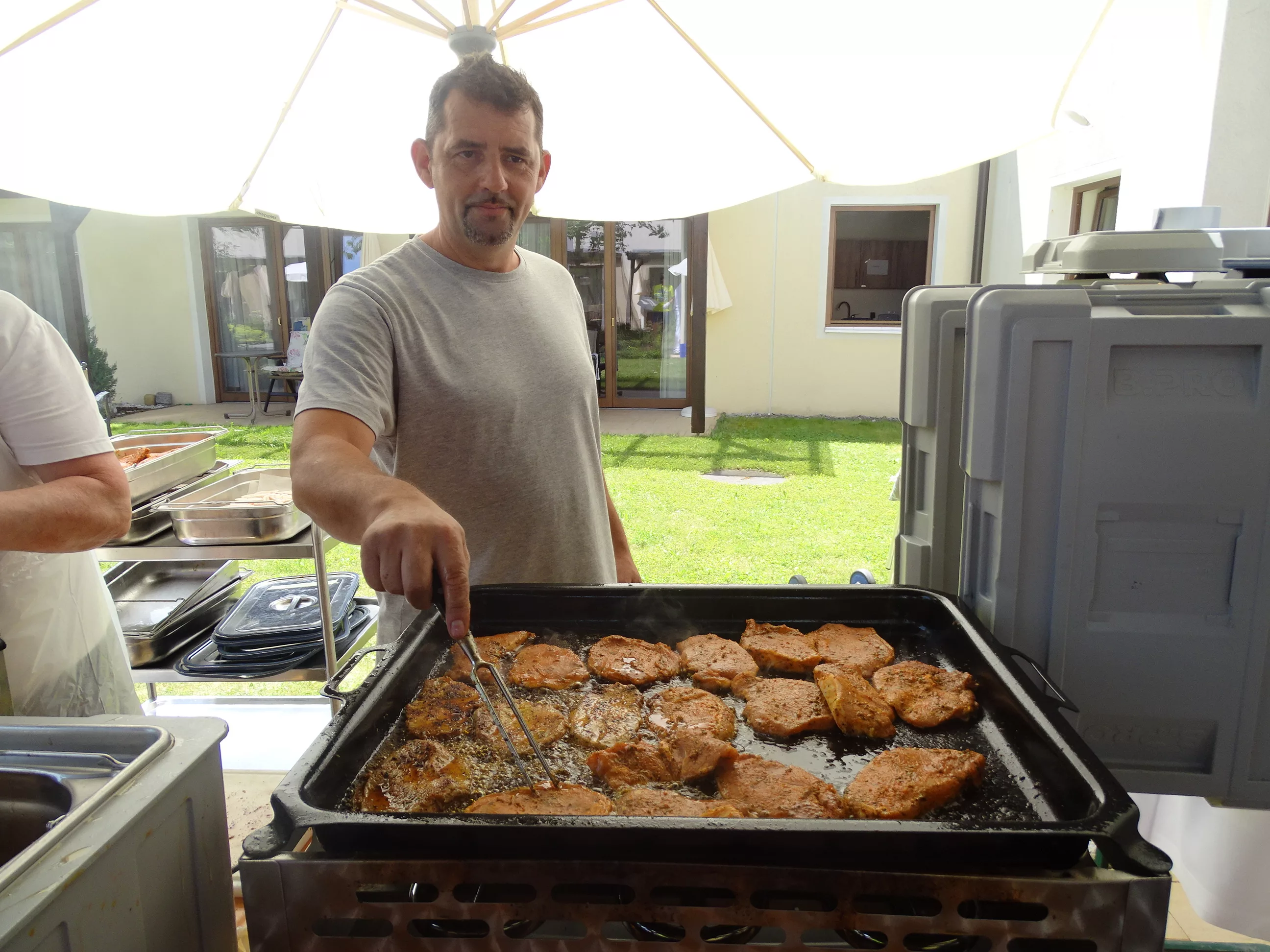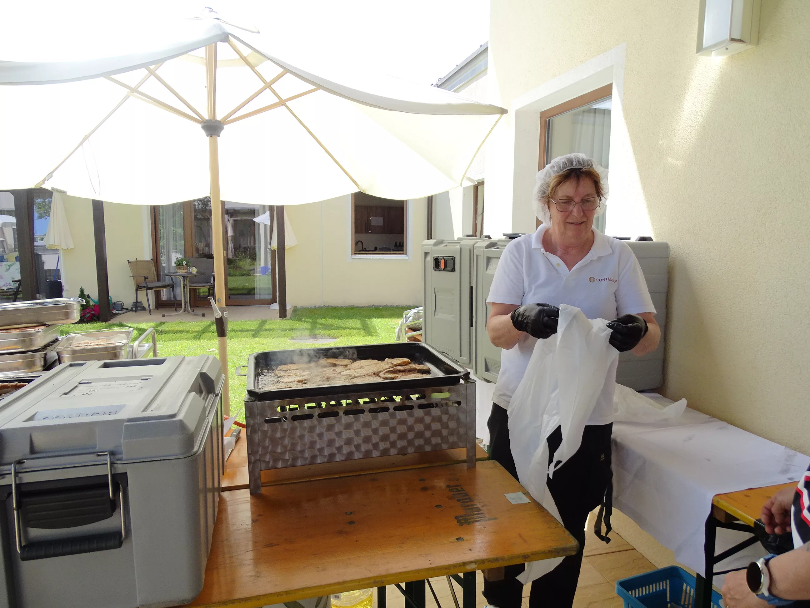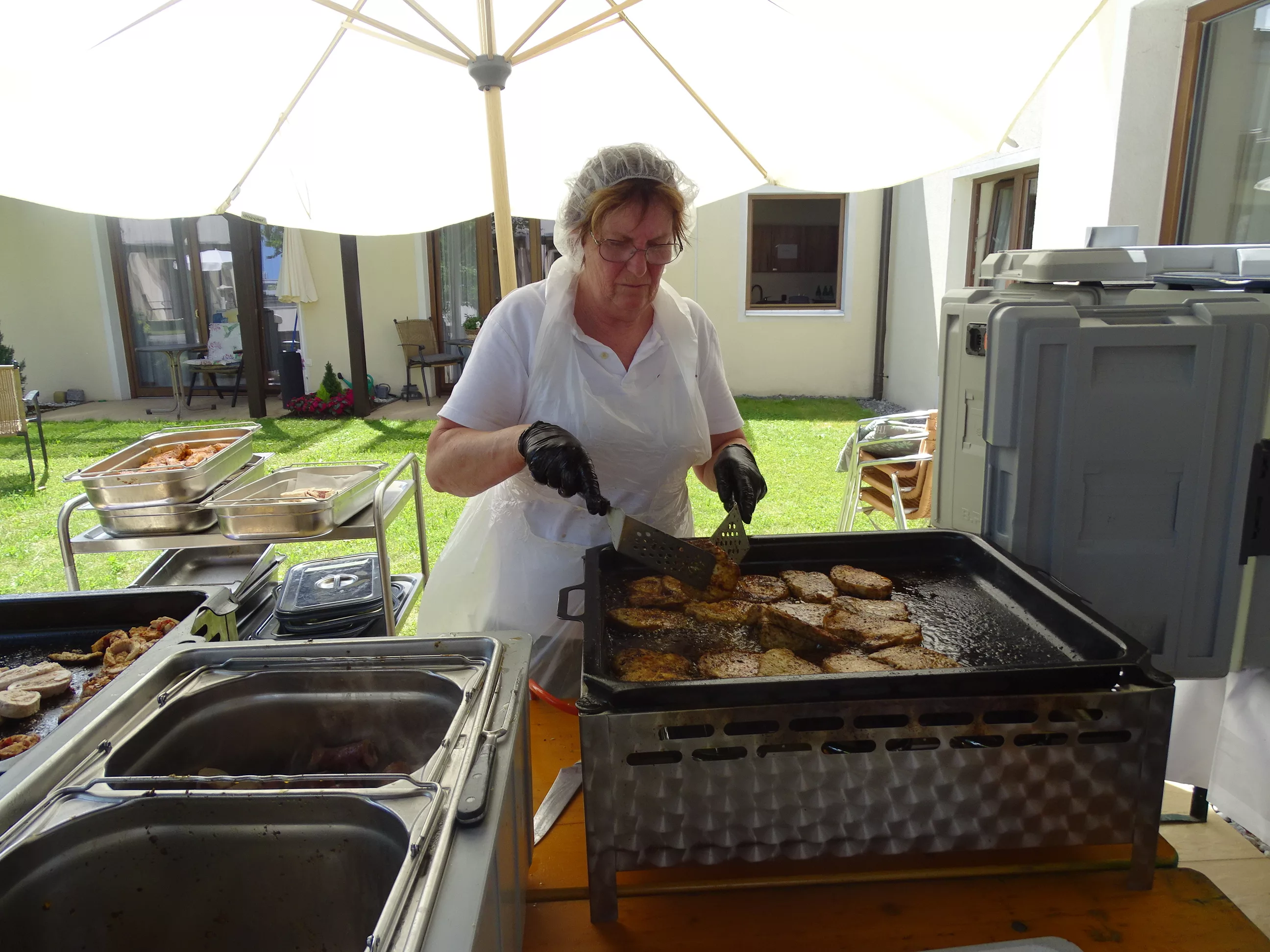 Am 17.06.2025 fand bei uns im Generationenpark Zeltweg wieder ein tolles Fest statt. Diesmal besuchte uns unsere Küchenchefin Gaby und grillte unter blitzblauem Himmel und wunderschönem Sonnenschein Bratwürste, Käsekrainer, Grillfleisch und gefüllte Rouladen, dazu schenkte unsere Heimleitung Maria Heibili gekonnt Bier vom Faß aus! Das Gegrillte und das Bier schmeckte einfach köstlich! Nach dem wunderbaren Essen umrahmten die Stohlis unser Fest mit bester Musik! Wir alle haben getanzt, geschunkelt und gelacht! Unser Haus bebte vor lauter guter Stimmung! Als Abrundung gab es eine leckere Erdbeerschnitte, die keiner ablehnen konnte!