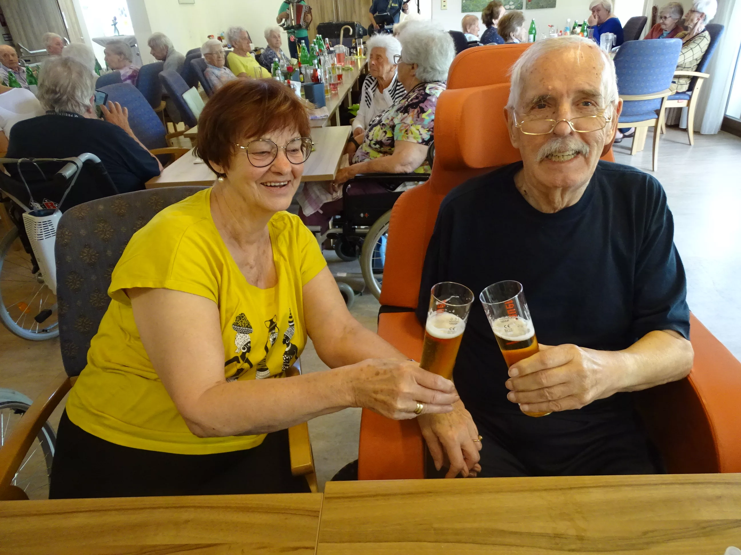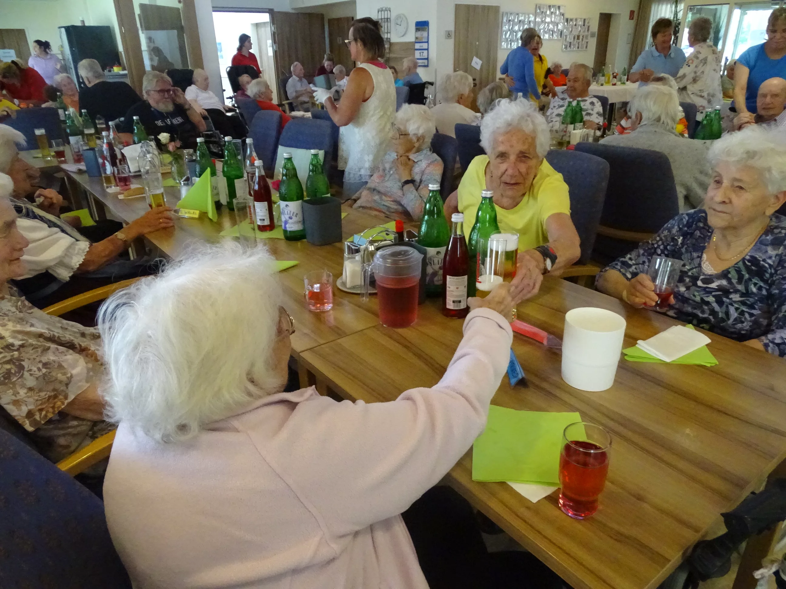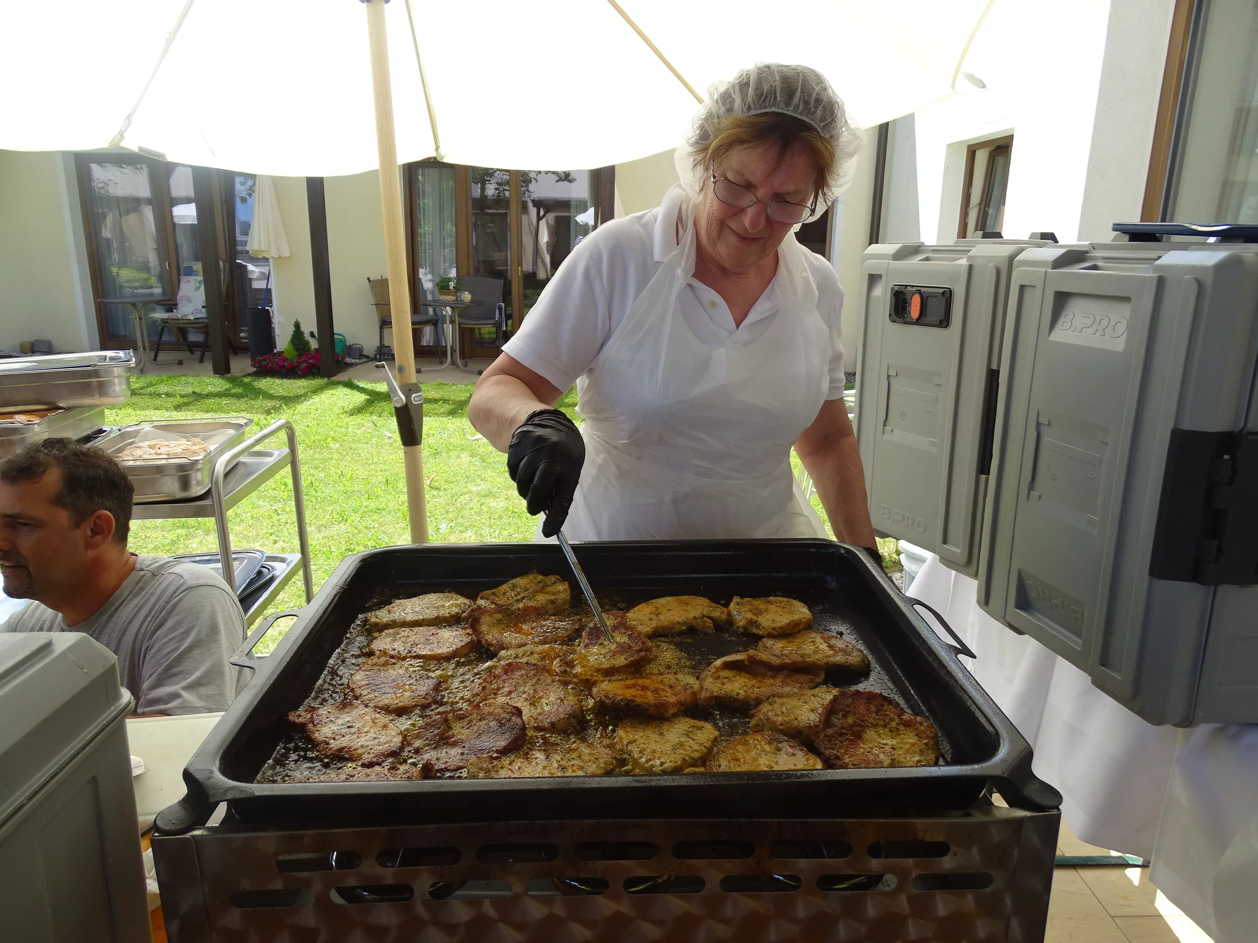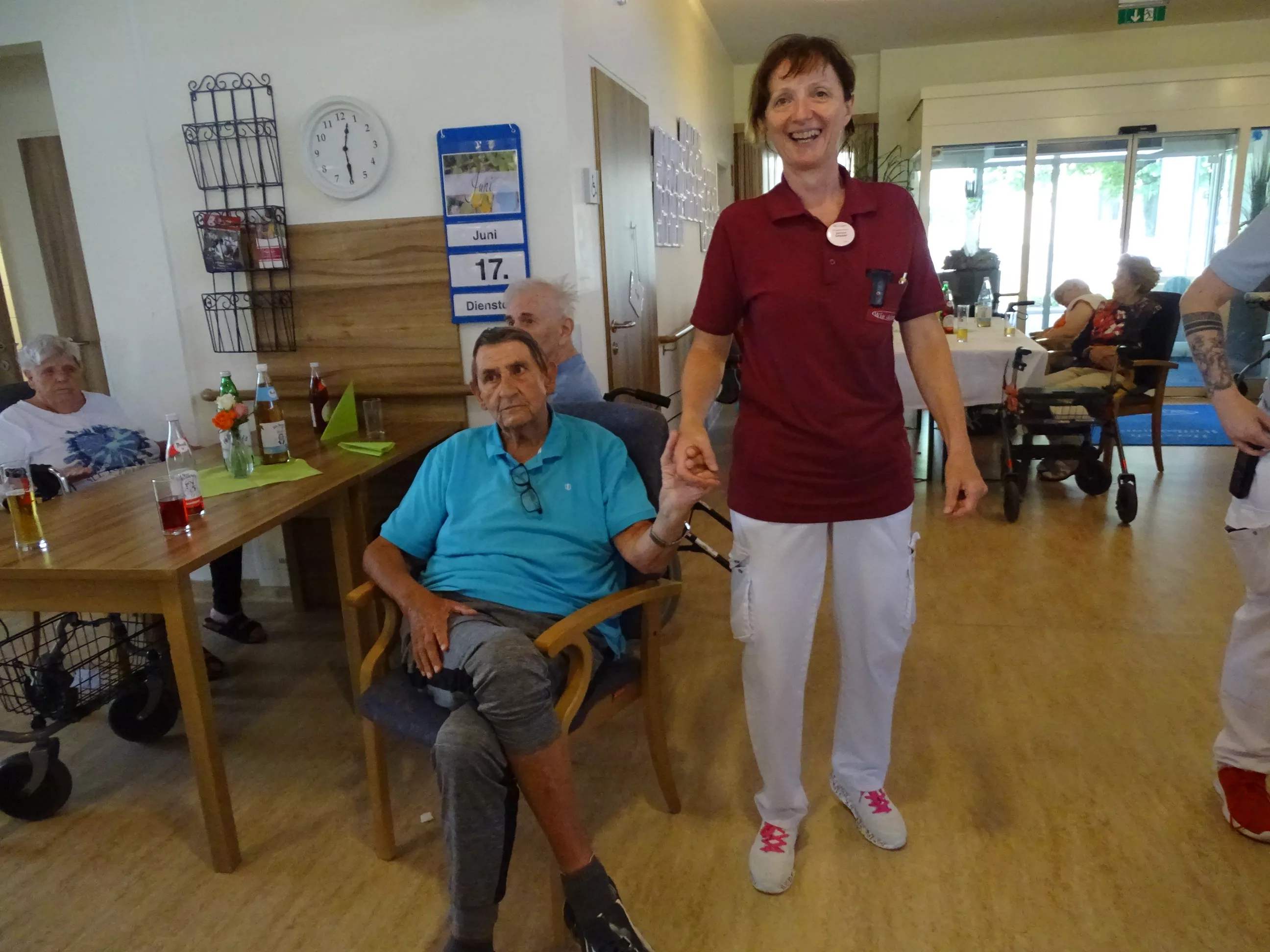 Am 17.06.2025 fand bei uns im Generationenpark Zeltweg wieder ein tolles Fest statt. Diesmal besuchte uns unsere Küchenchefin Gaby und grillte unter blitzblauem Himmel und wunderschönem Sonnenschein Bratwürste, Käsekrainer, Grillfleisch und gefüllte Rouladen, dazu schenkte unsere Heimleitung Maria Heibili gekonnt Bier vom Faß aus! Das Gegrillte und das Bier schmeckte einfach köstlich! Nach dem wunderbaren Essen umrahmten die Stohlis unser Fest mit bester Musik! Wir alle haben getanzt, geschunkelt und gelacht! Unser Haus bebte vor lauter guter Stimmung! Als Abrundung gab es eine leckere Erdbeerschnitte, die keiner ablehnen konnte!