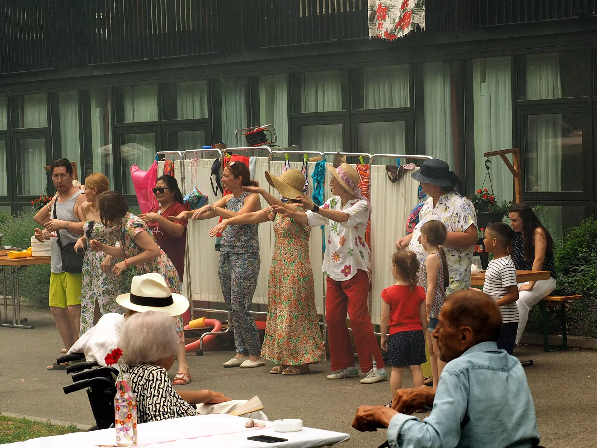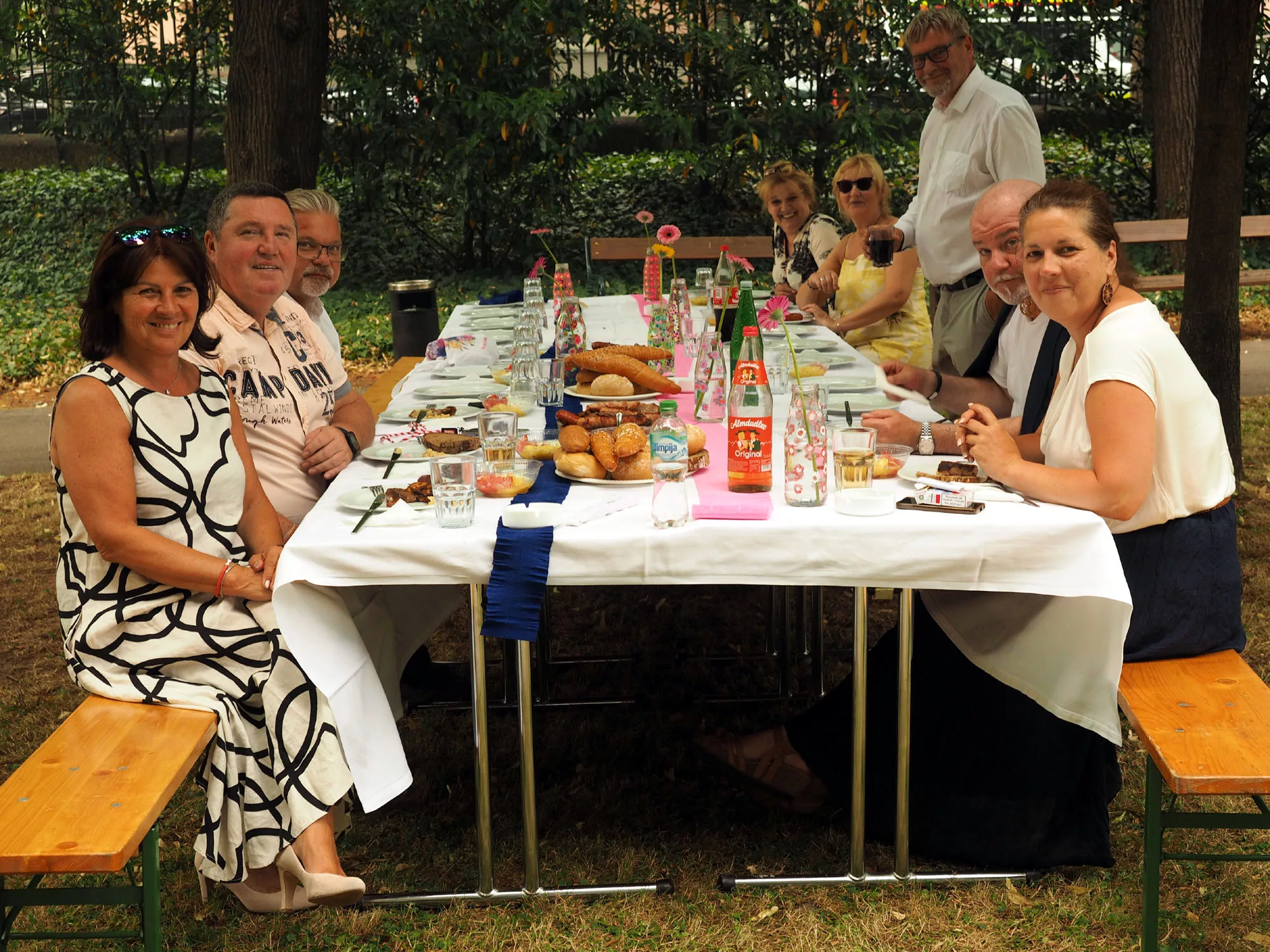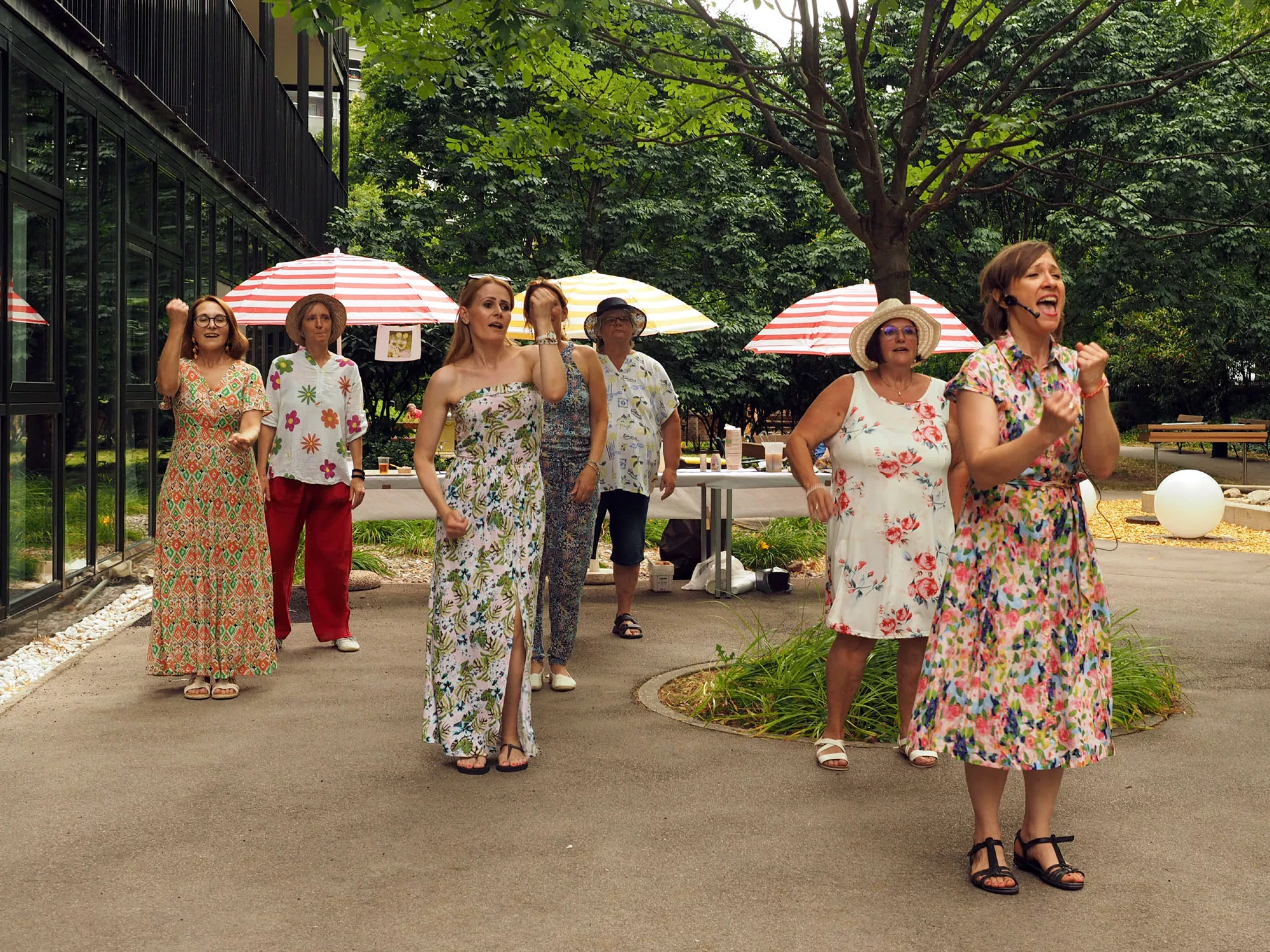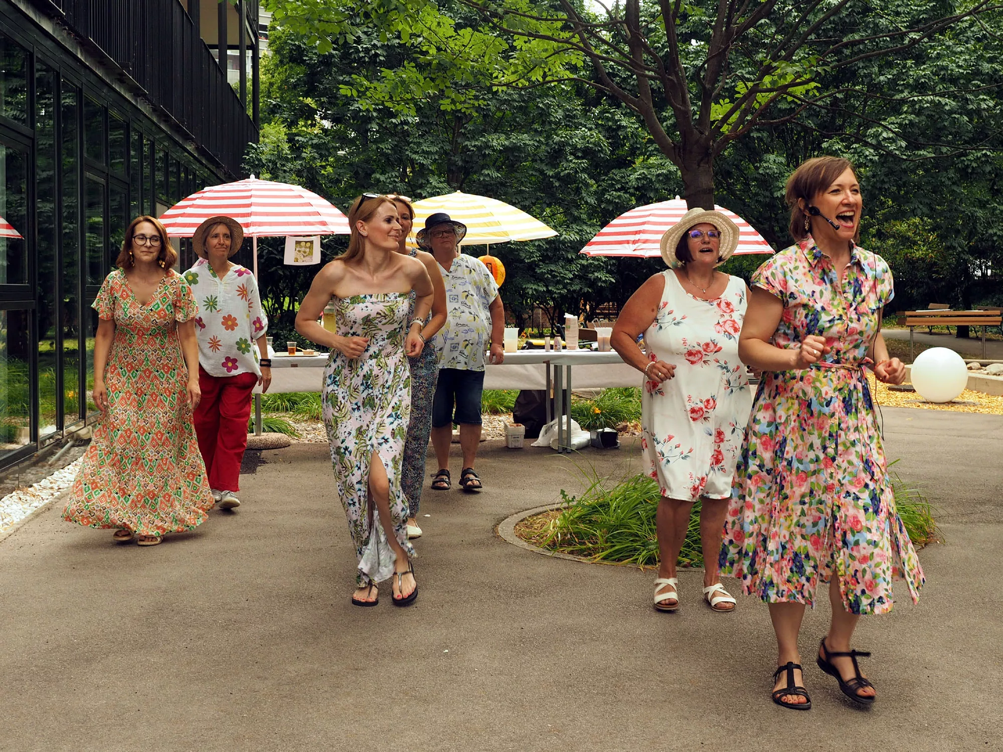 Ein Sommerfest wie man es sich nicht besser vorstellen kann, ging am 26. Juni im wahrsten Sinne des Wortes über die Bühne. Nach feierlicher Eröffnung und Begrüßung der Ehrengäste, unter anderem Frau Bezirksvorsteherin Christine Dubravac-Widholm, sowie die Präsidentin der Wiener Arbeiterkammer, Frau Renate Anderl, startete das Animationsteam mit dem Showprogramm. Die Festbesucher durften sich über eine Persiflage auf Reinhard Fendrichs „Strada del Sole“ amüsieren, gefolgt von einer Abwandlung von Frank Sinatras „New York, New York“ als Homage an Wien. Die Darbietungen des Animationsteams mit Frontfrau Pia überzeugten das Publikum mit semiprofessioneller Qualität, dass sogar die Frage aufgekommen ist, ob man des Ensemble für private Feiern buchen kann.