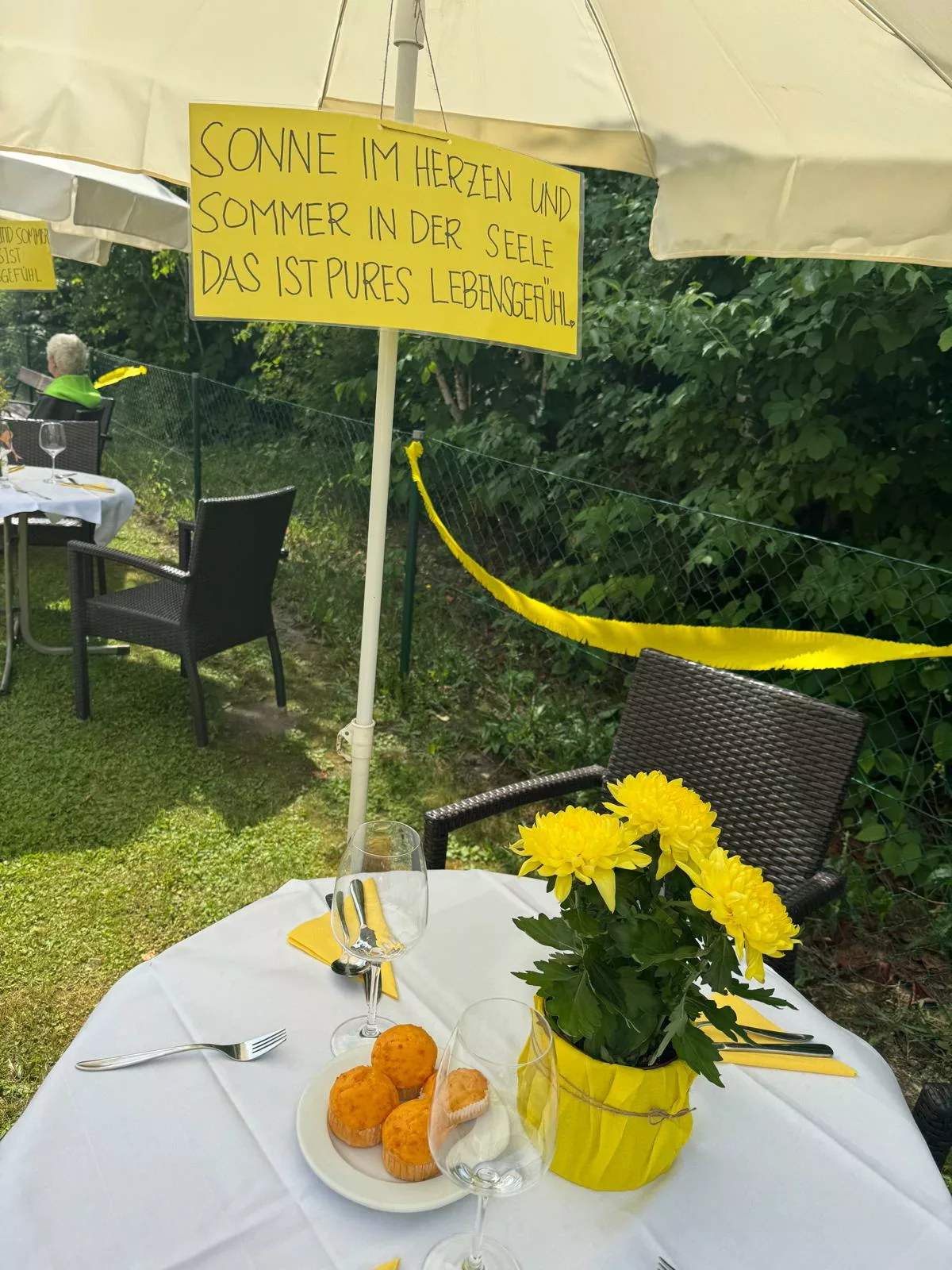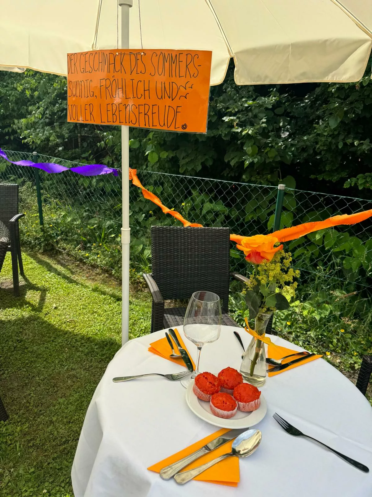 Zahlreiche Bewohner*innen sowie deren Angehörige folgten der Einladung und erlebten einen unvergesslichen Tag voller Musik, Kulinarik und Gemeinschaft. Jeder Tisch stand für eine Farbe – ob Rot, Grün, Gelb, Violett oder Orange und war passend dazu mit natürlichen Duftträgern wie Kräutern oder Blumen liebevoll dekoriert. Farblich abgestimmte Muffins und selbstgemachte Säfte ergänzten nicht nur die Tischdekoration, sondern auch das kulinarische Angebot. Für die musikalische Umrahmung sorgte der beliebte Alleinunterhalter „KRAWALLHANSL“. Es wurde getanzt, gesungen und gelacht – die Freude war allen Beteiligten deutlich anzusehen.