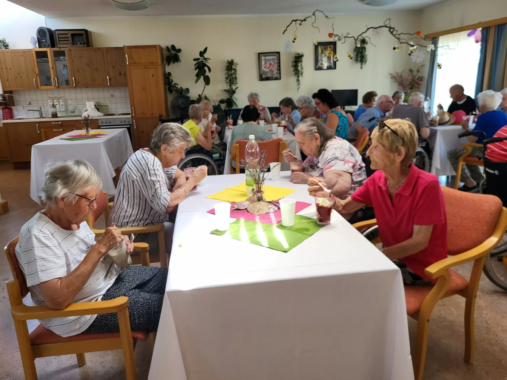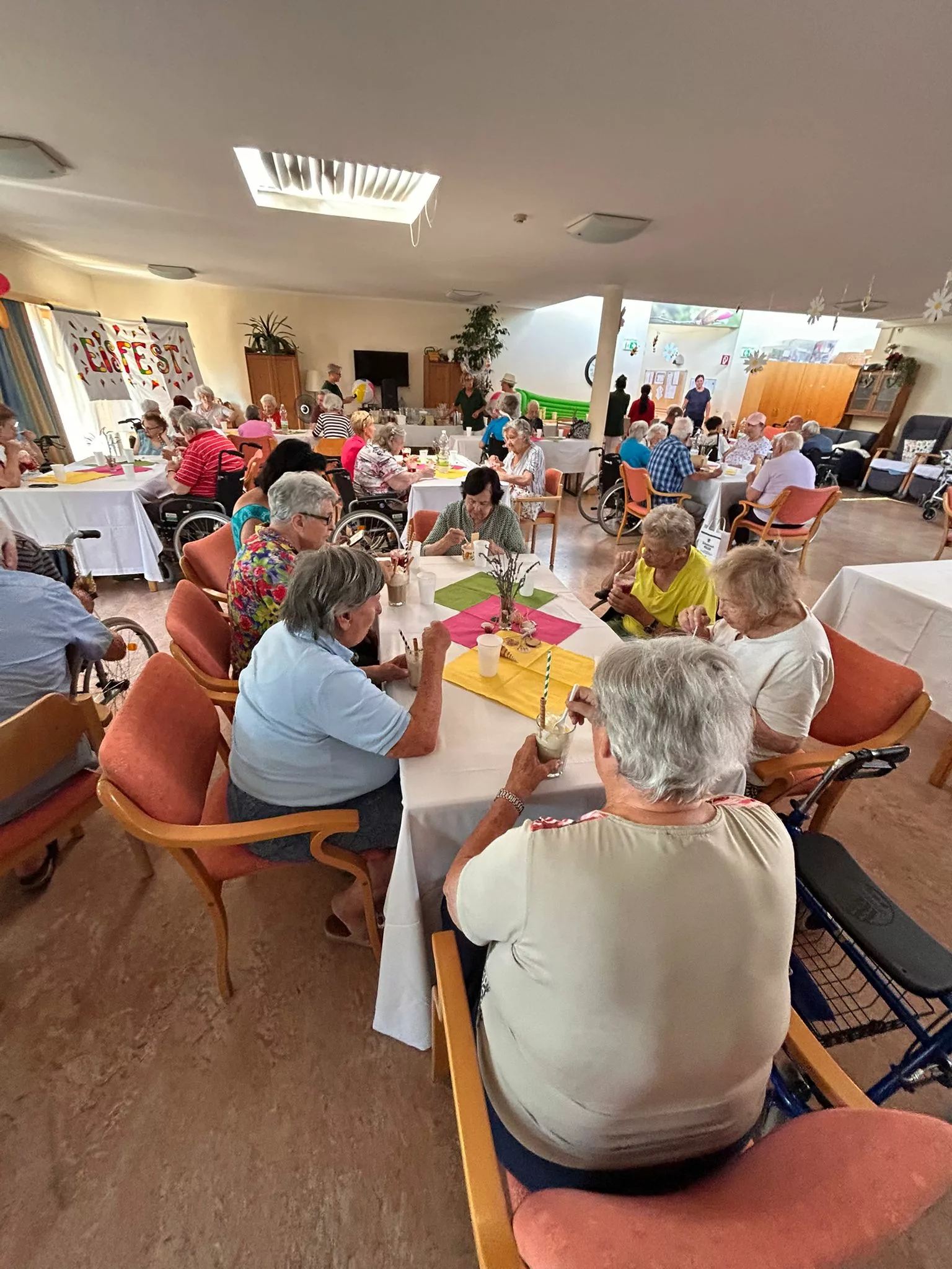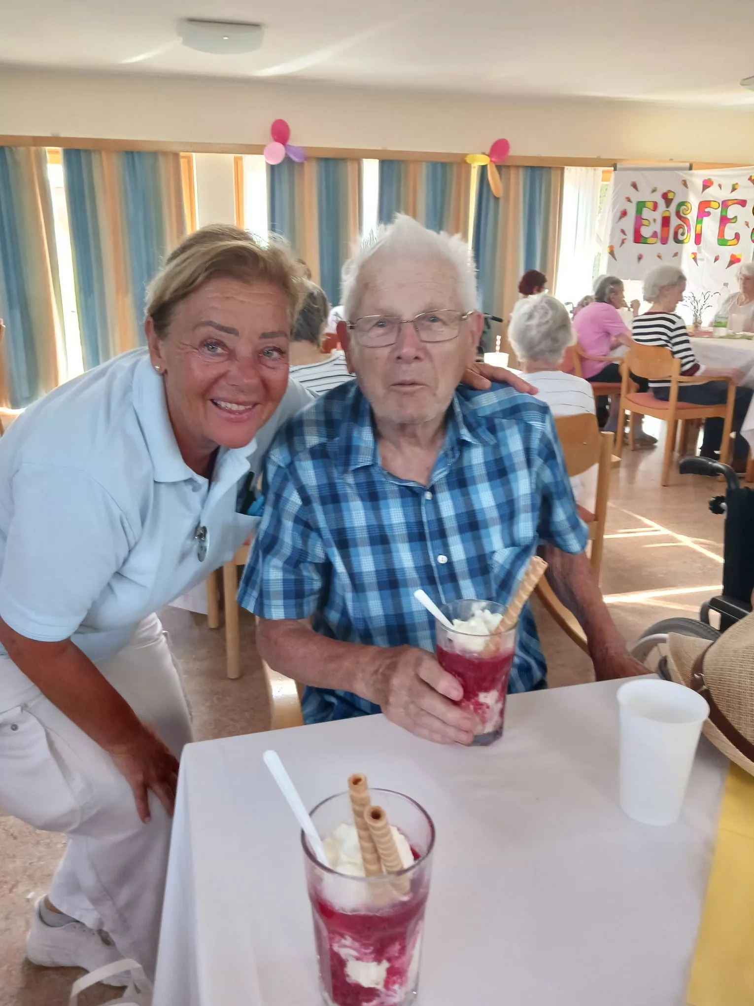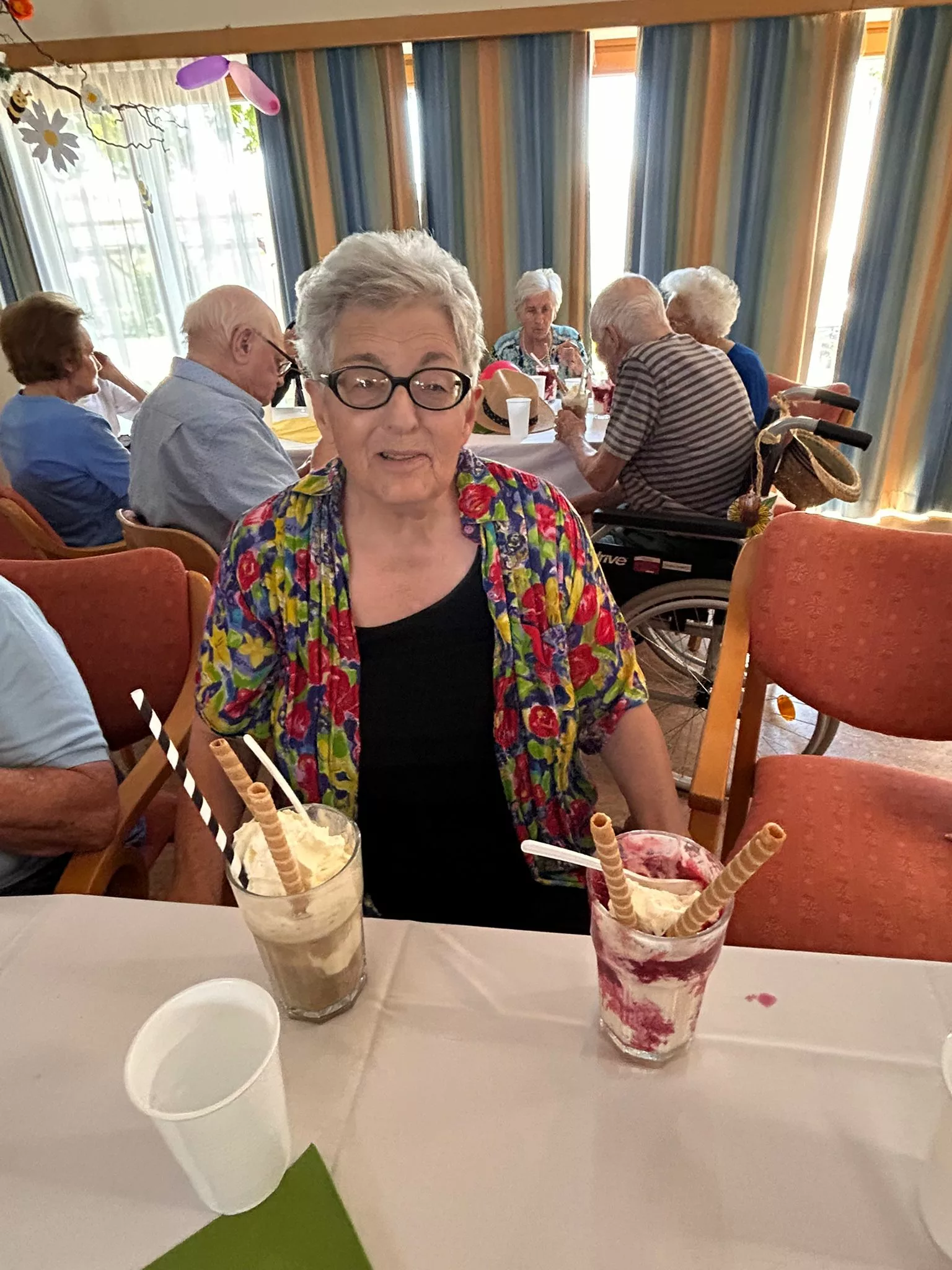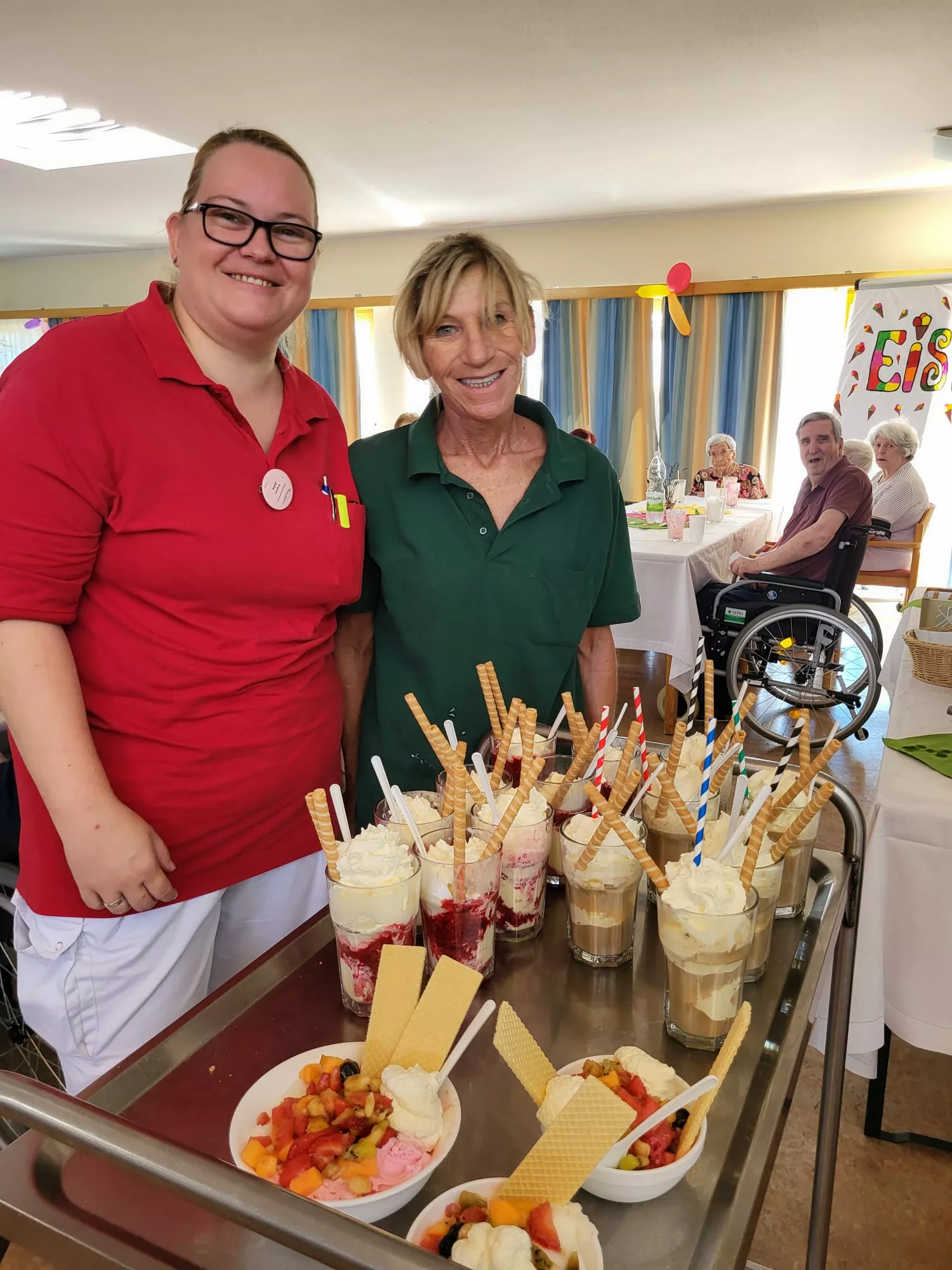 Für unsere Bewohner und Bewohnerinnen wurden liebevoll leckere Eisbecher zubereitet, ob Eiskaffee oder bunte Früchtebecher, für jeden Geschmack war etwas dabei.