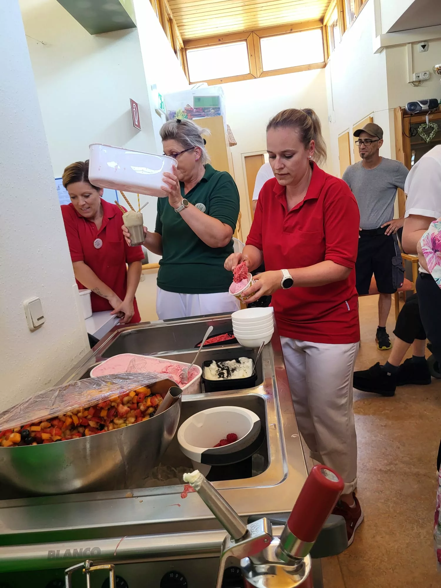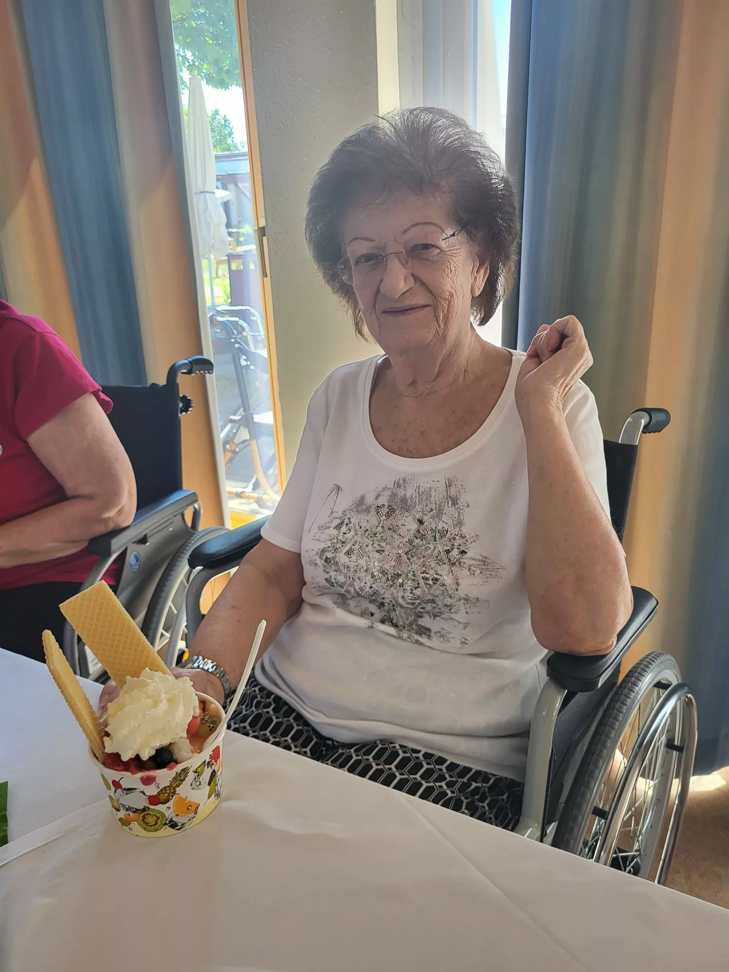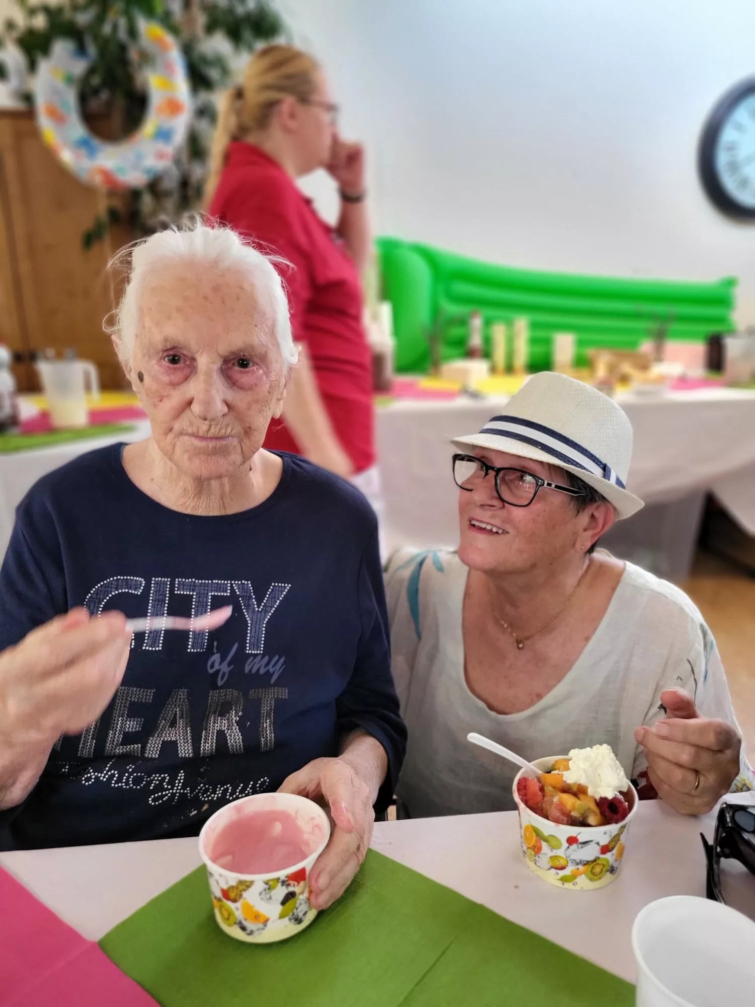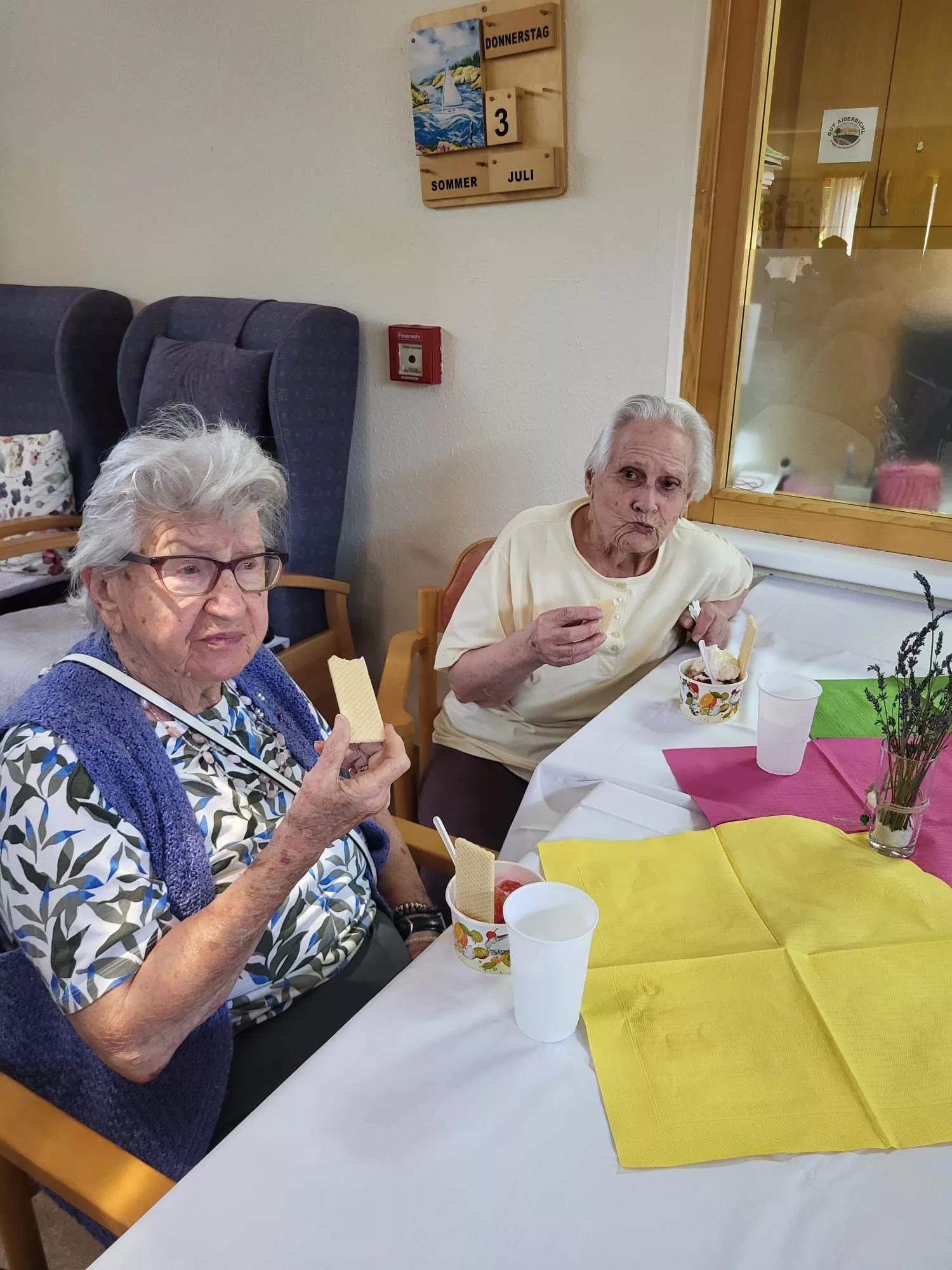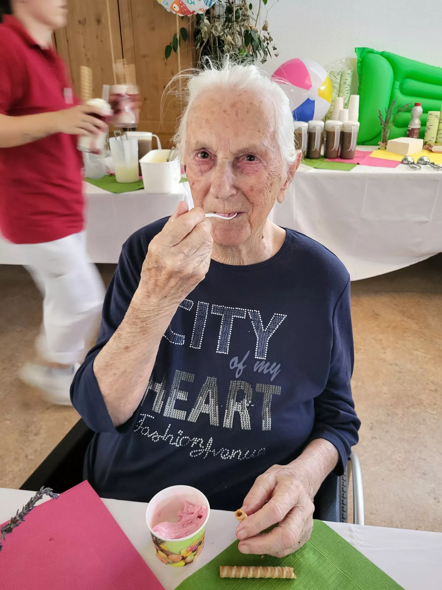 Für unsere Bewohner und Bewohnerinnen wurden liebevoll leckere Eisbecher zubereitet, ob Eiskaffee oder bunte Früchtebecher, für jeden Geschmack war etwas dabei.