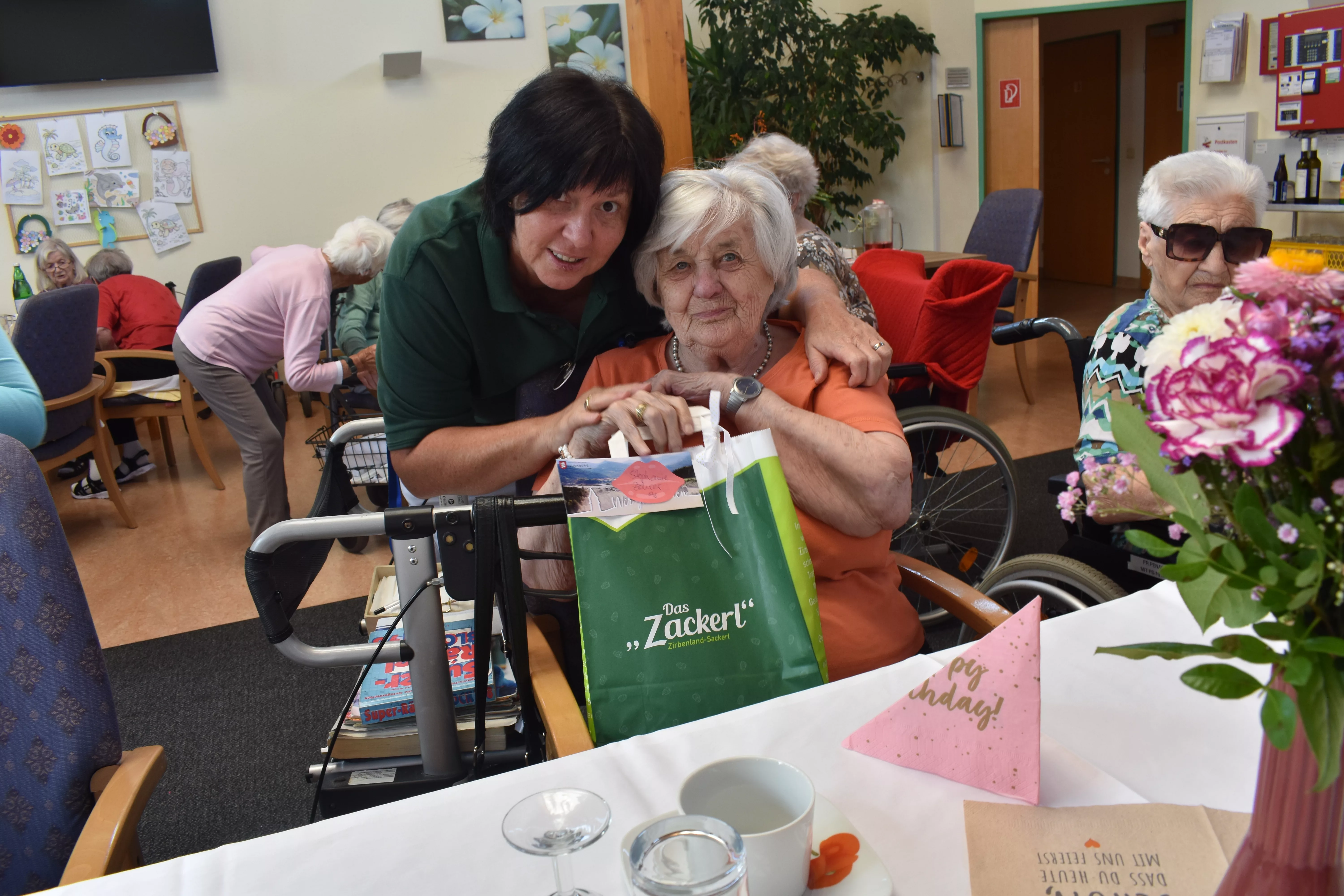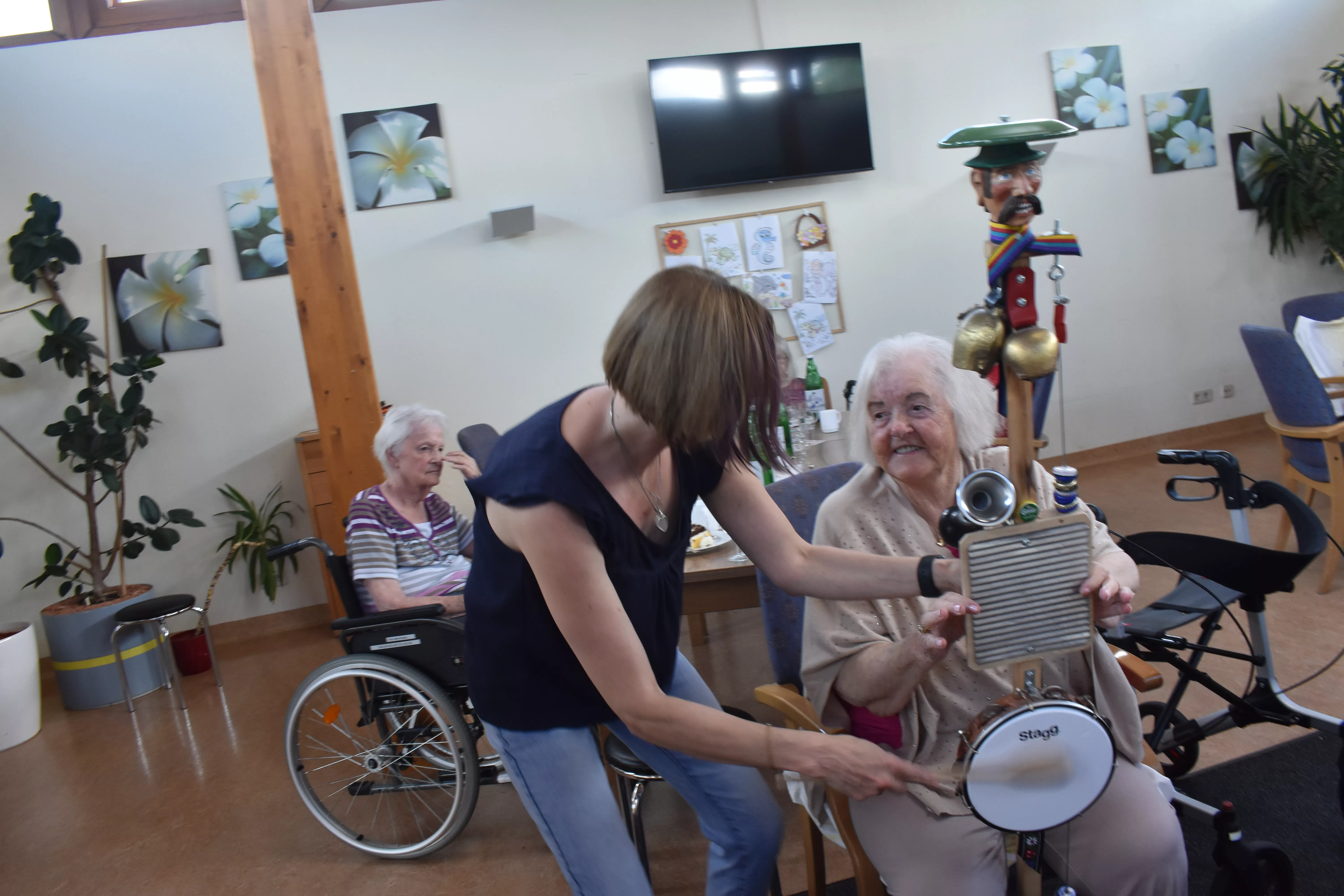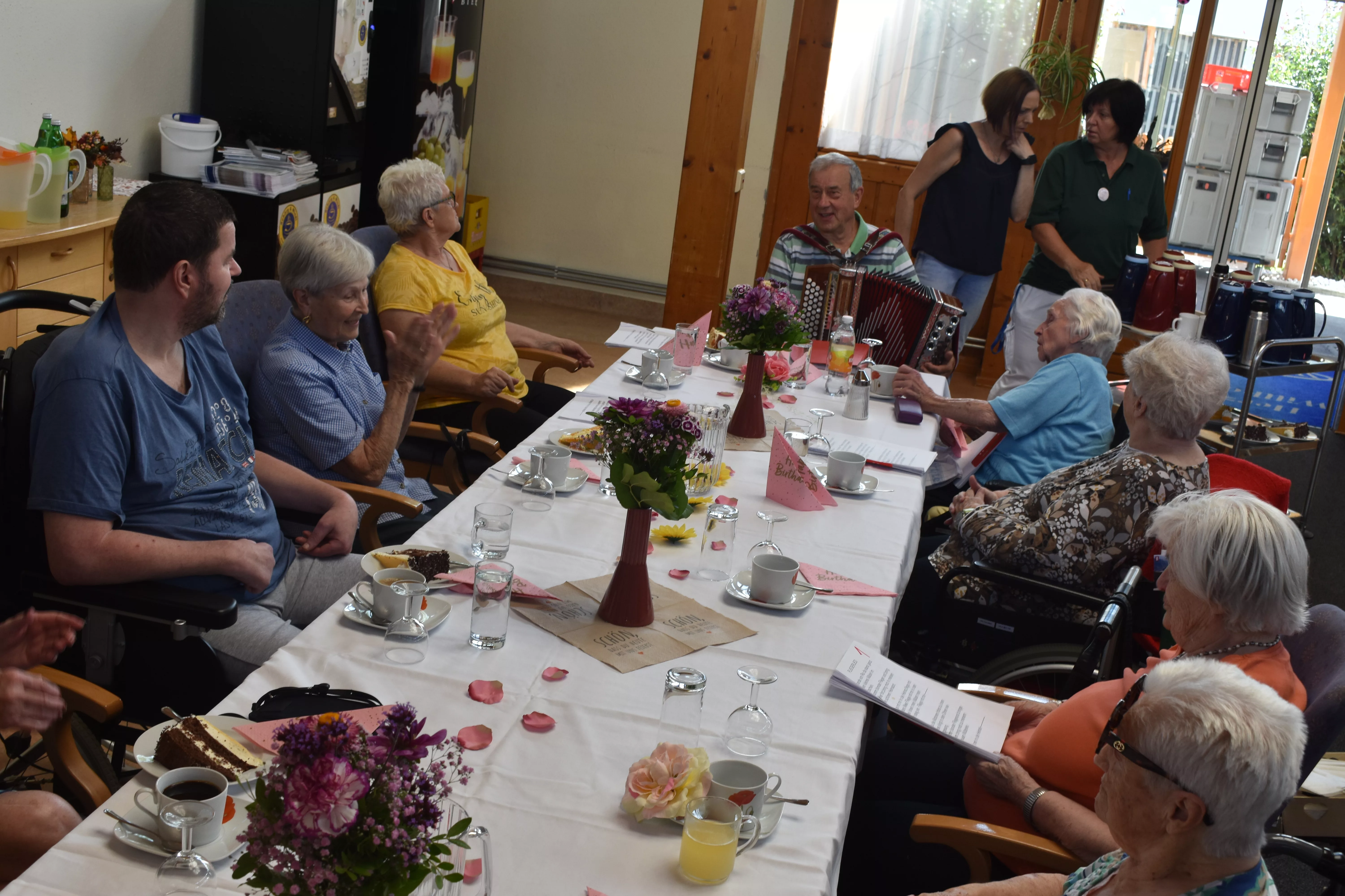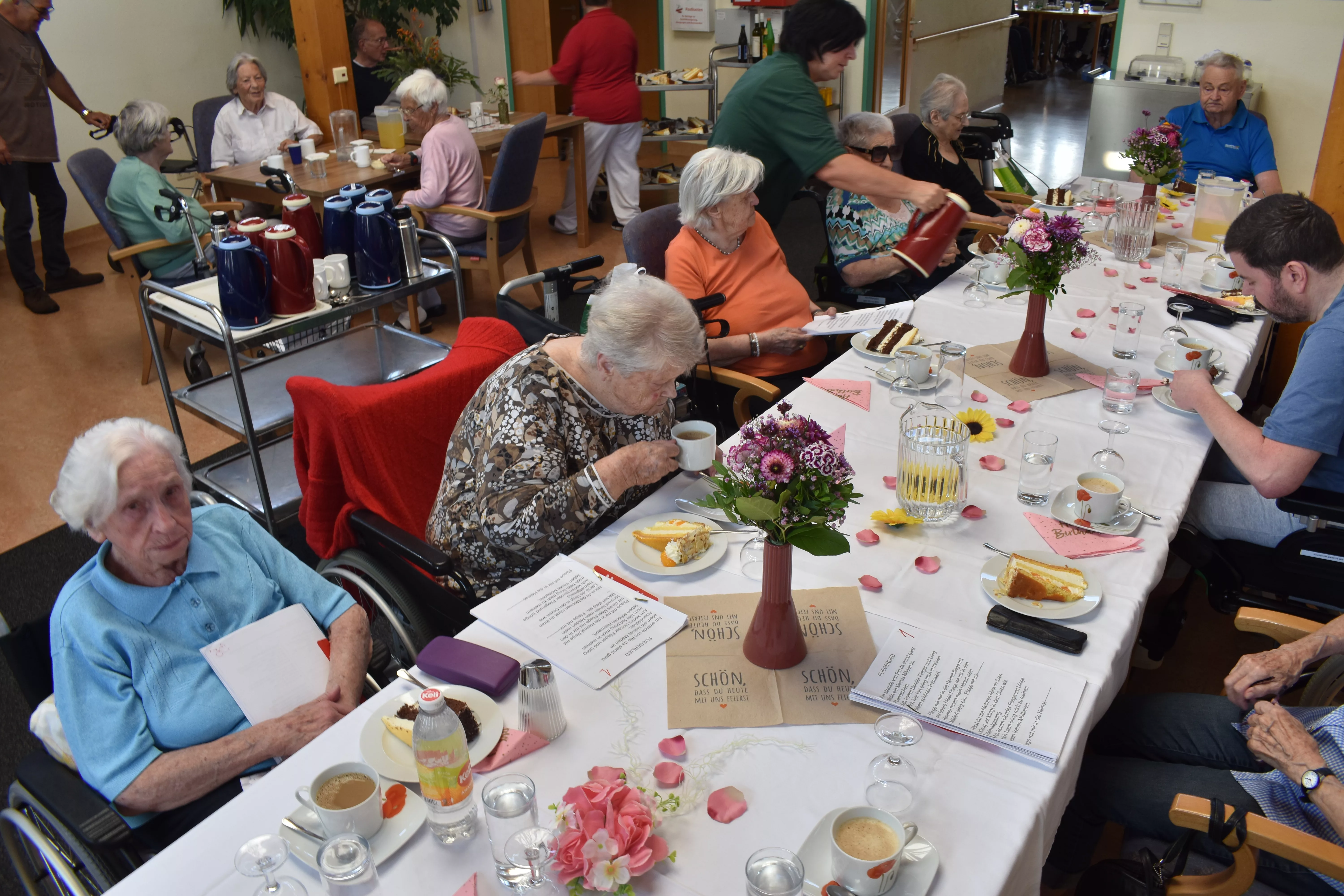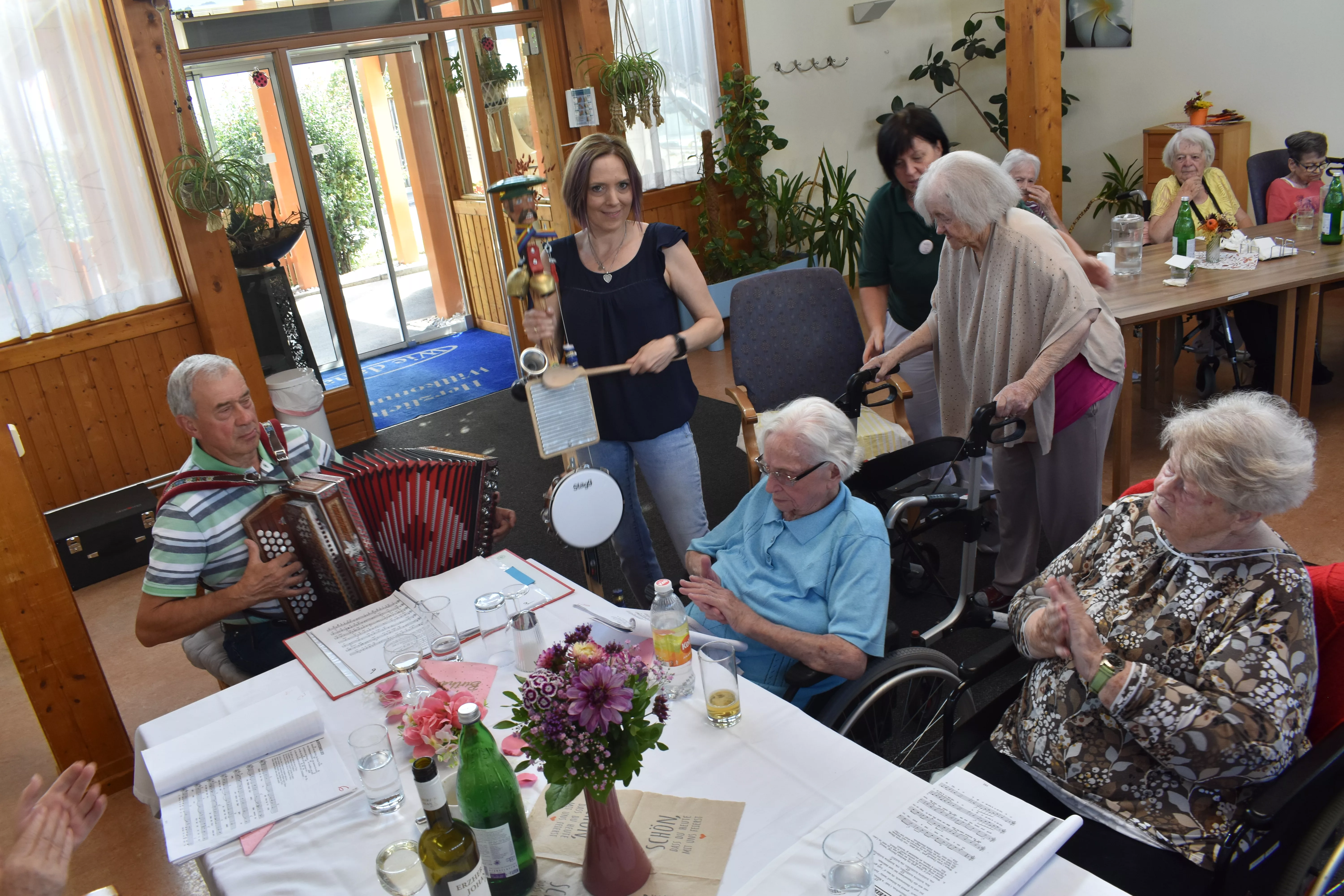 Bei einer Tasse Kaffee, einem köstlichen Stück Torte und einem Gläschen Wein lässt es sich wunderbar plaudern, genießen und feiern. Für die Bombenstimmung sorgt wie immer unsere „Meli“ mit ihrer Teufelsgeige. Auch mancher Bewohner versucht sein Können auf diesem Instrument, andere wiederum schwingen voller Freude das Tanzbein.
