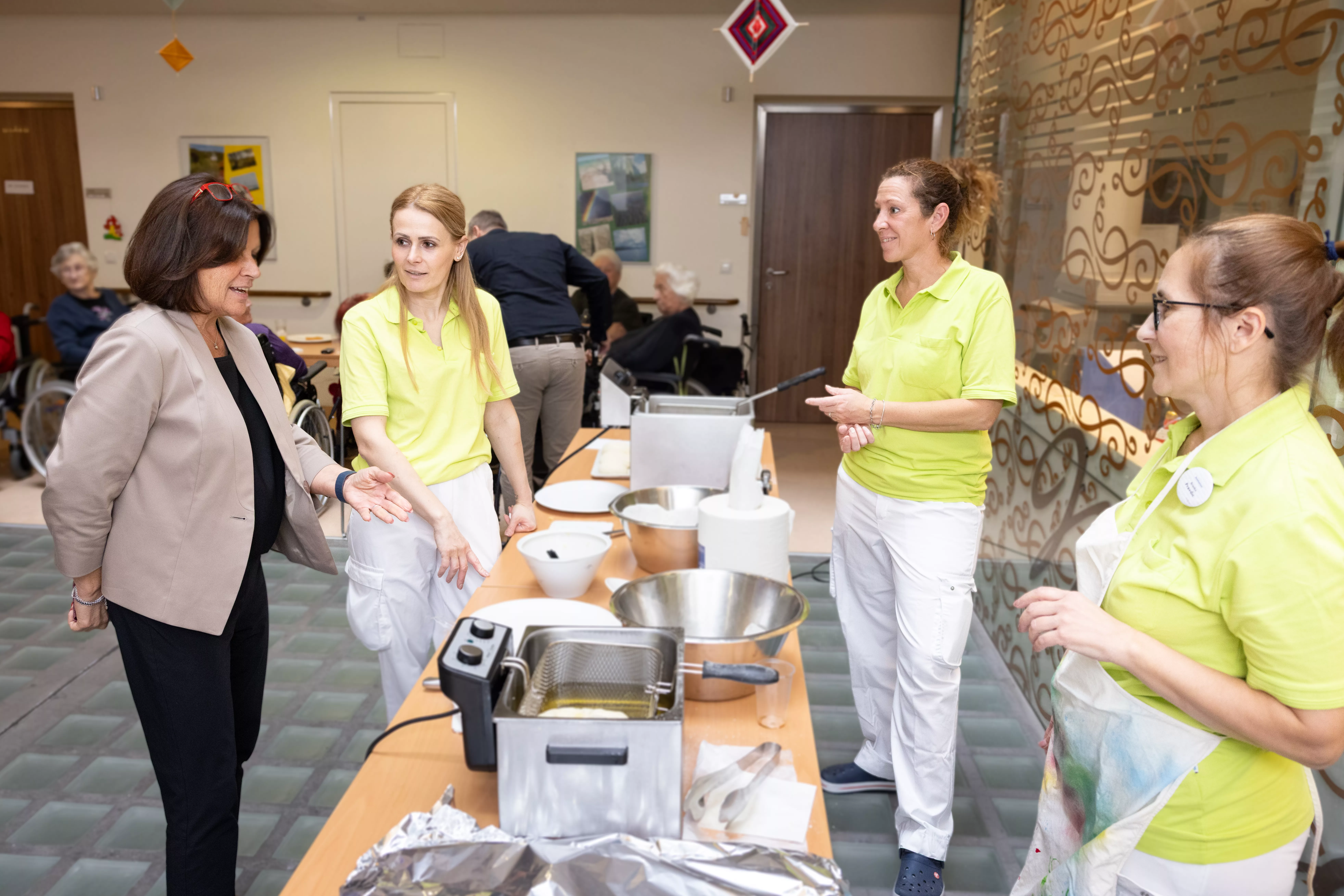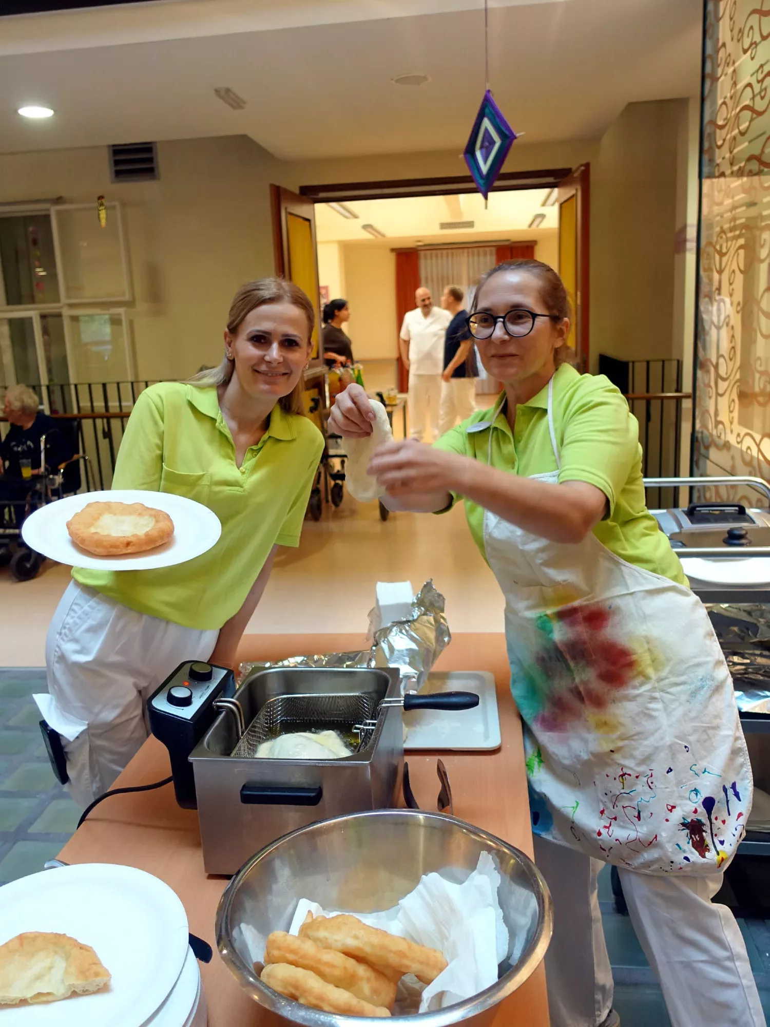 Wenn es selbst gemachte Langos gibt füllt sich der Aufenthaltsbereich im Mezzanin binnen weniger Minuten. Nicht nur die Bewohner erfreuten sich an der feinen Köstlichkeit, auch die zufällig im Rahmen einer Betriebsbesichtigung anwesende Präsidentin der Wiener Arbeiterkammer, Frau Renate Anderl, konnte sich von der Qualität unserer Langos überzeugen.