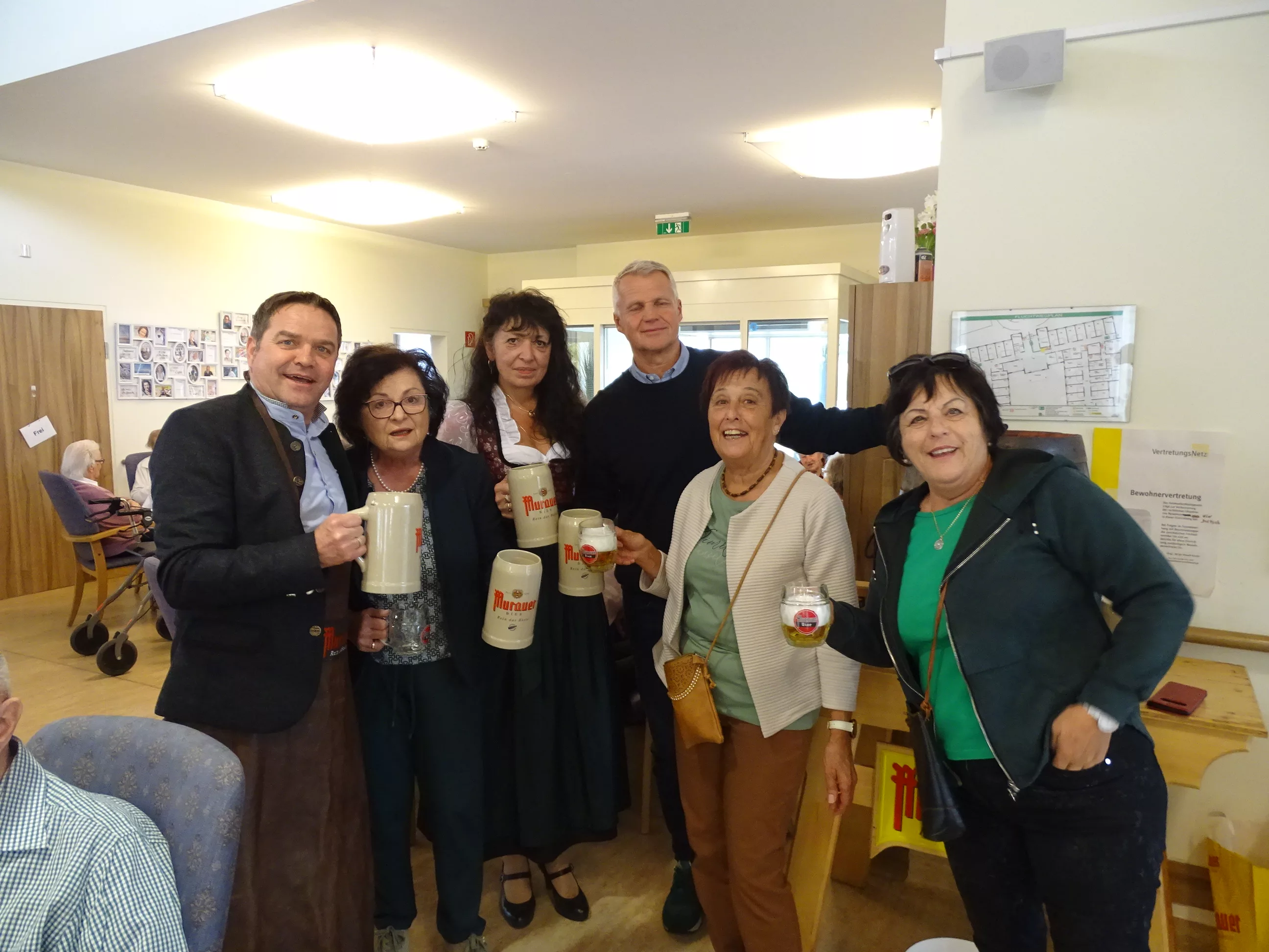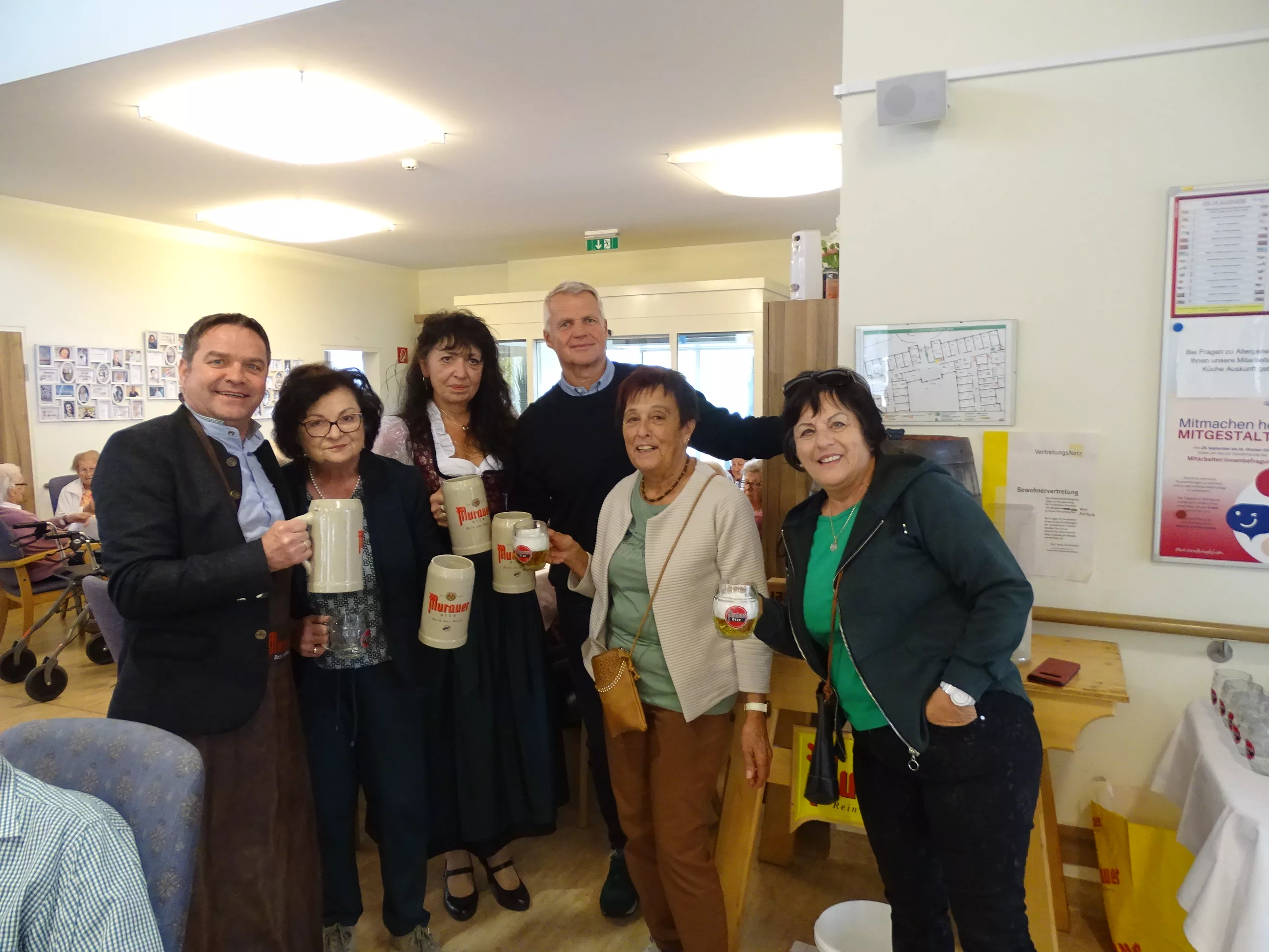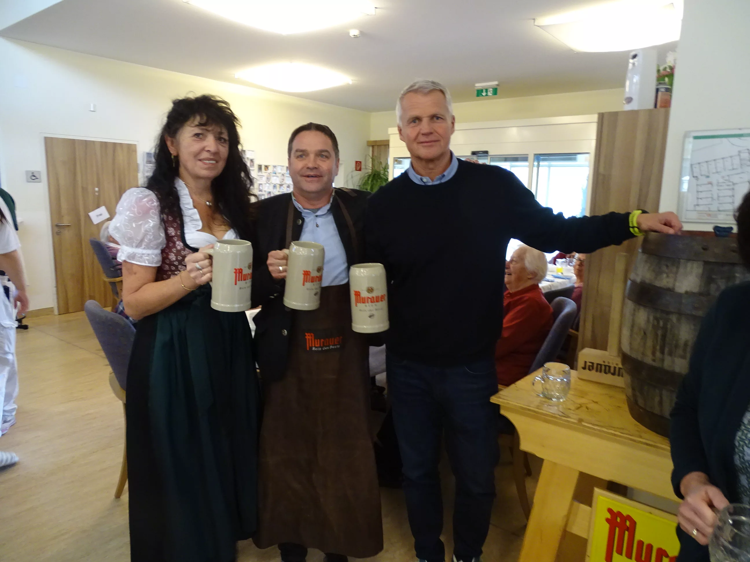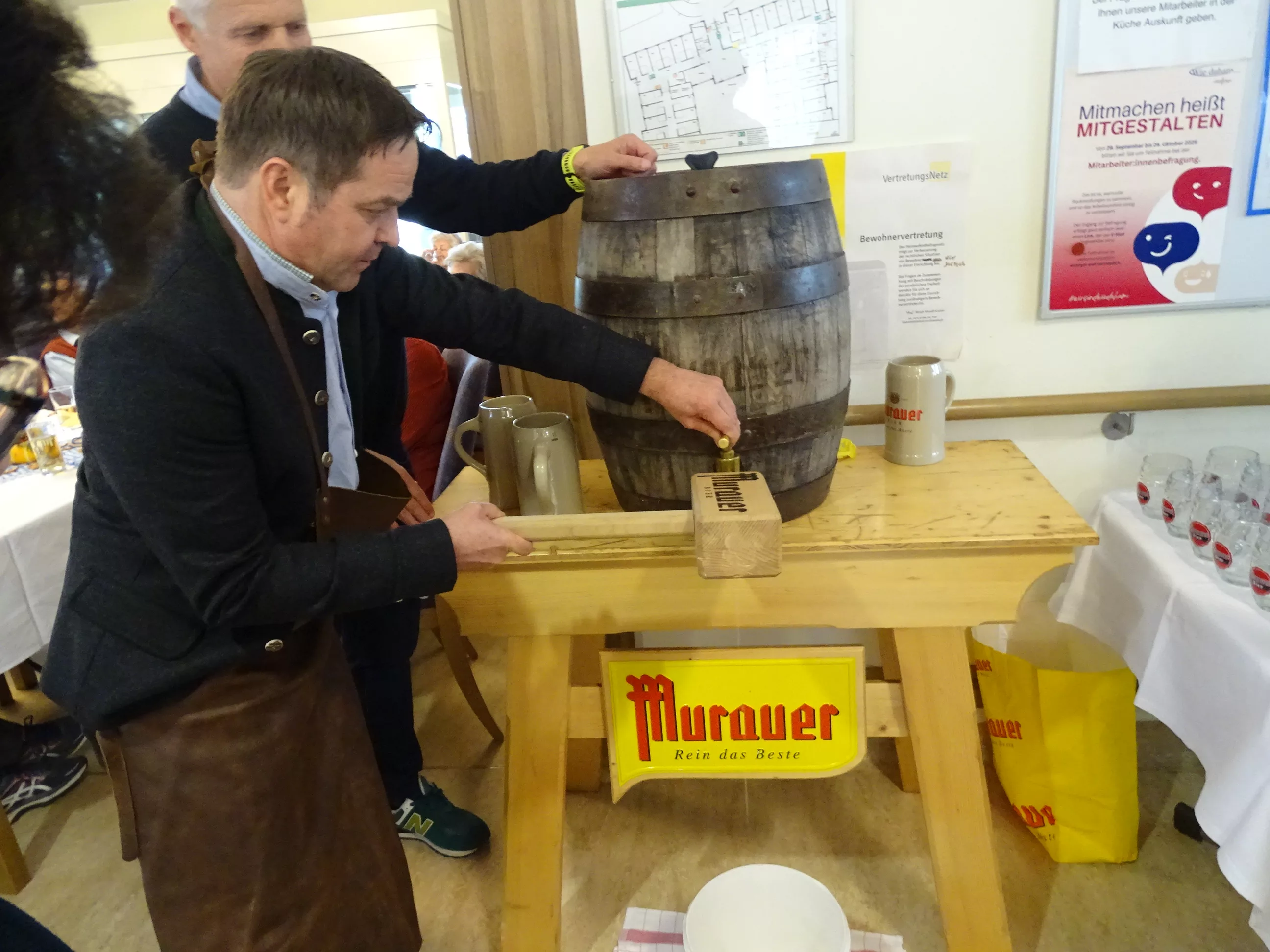 „Aonzapft is“ im Generationenpark Zeltweg! Der Bieranstich am 15. Oktober 2025 war wieder ein großes Ereignis in unserem Haus! Unsere BewohnerInnen freuten sich schon sehr auf unser diesjähriges Oktoberfest. Die „Breitenegger“ gaben ihre Musik wieder zum Besten, von Oldies bis Schlager war alles dabei. Unsere BewohnerInnen und MitarbeiterInnen konnten die Füße kaum still halten, es wurde getanzt, gesungen und gelacht! Der absolulte Höhepunkt war an diesem Tag der Besuch des Bürgermeisters Herrn Ing. Günter Reichhold und die Gemeinderätinnen Frau Rita Hartner und Frau Anneliese Steinkellner, sowie die Stadträtin Frau Brigitte Konrad. Absolut souverän wurde der Bieranstich von unserem Herrn Bürgermeister Reichhold, unter der Aufsicht des „Murauer Bier“ Dipl. Biersommelier Herrn Robert Jäger durchgeführt. Die Gemeinde- und Stadträtinnen servierten die Biere unseren BewohnerInnen und es wurde mit Lachen angestossen und das köstliche Murauer Bier genossen! Nach dem Genuß des Murauer Biers wurden unsere BewohnerInnen mit einer deftigen Weißwurst überrascht!