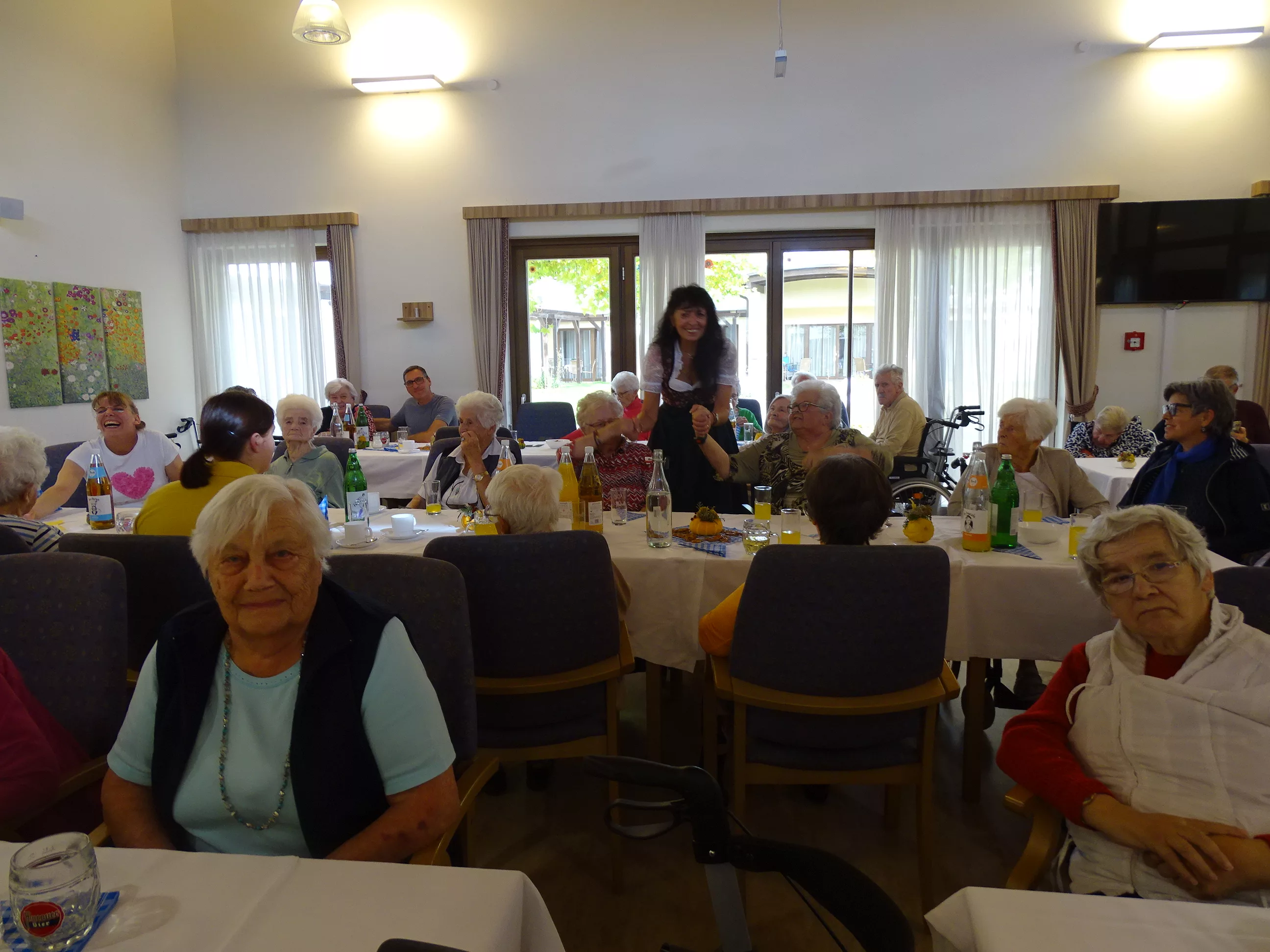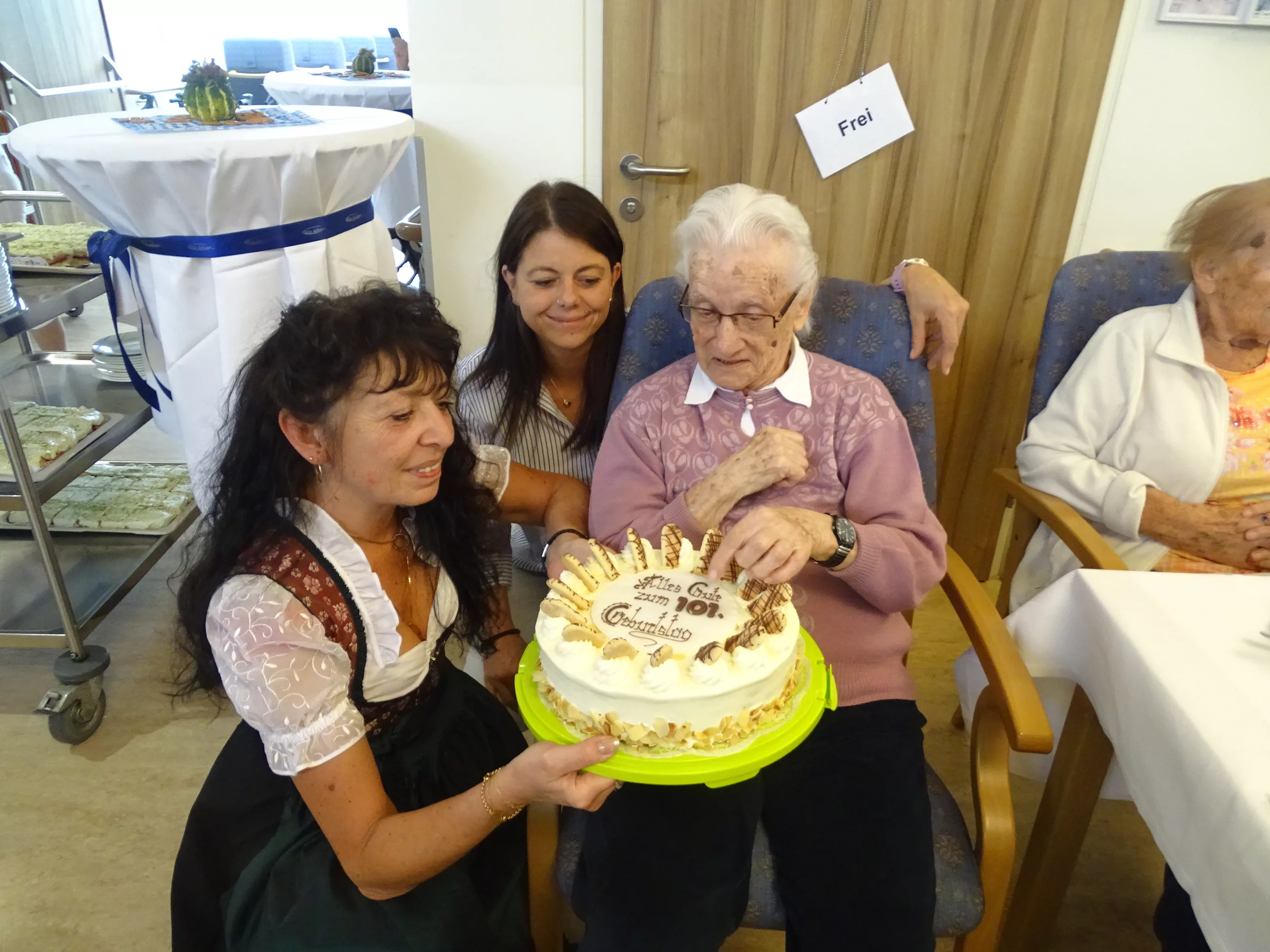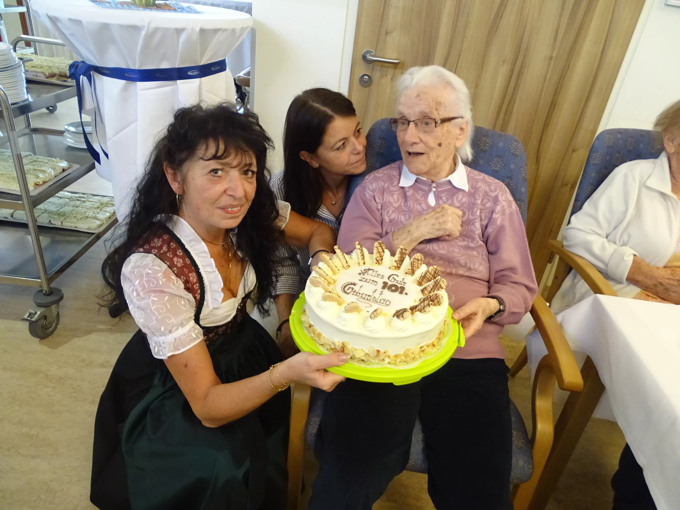 Ein weiterer Höhepunkt dieses Tages war der 101. Geburtstag von unserer Bewohnerin Frau Maria Mitteregger, Unsere Heimleiterin Frau Maria Heibili und unsere Pflegedienstleitung Frau Christine Klingsbigl-Reif überraschten sie mit einer Malakofftorte, welche sie sofort mit ihren Tischnachbarn verspeiste.