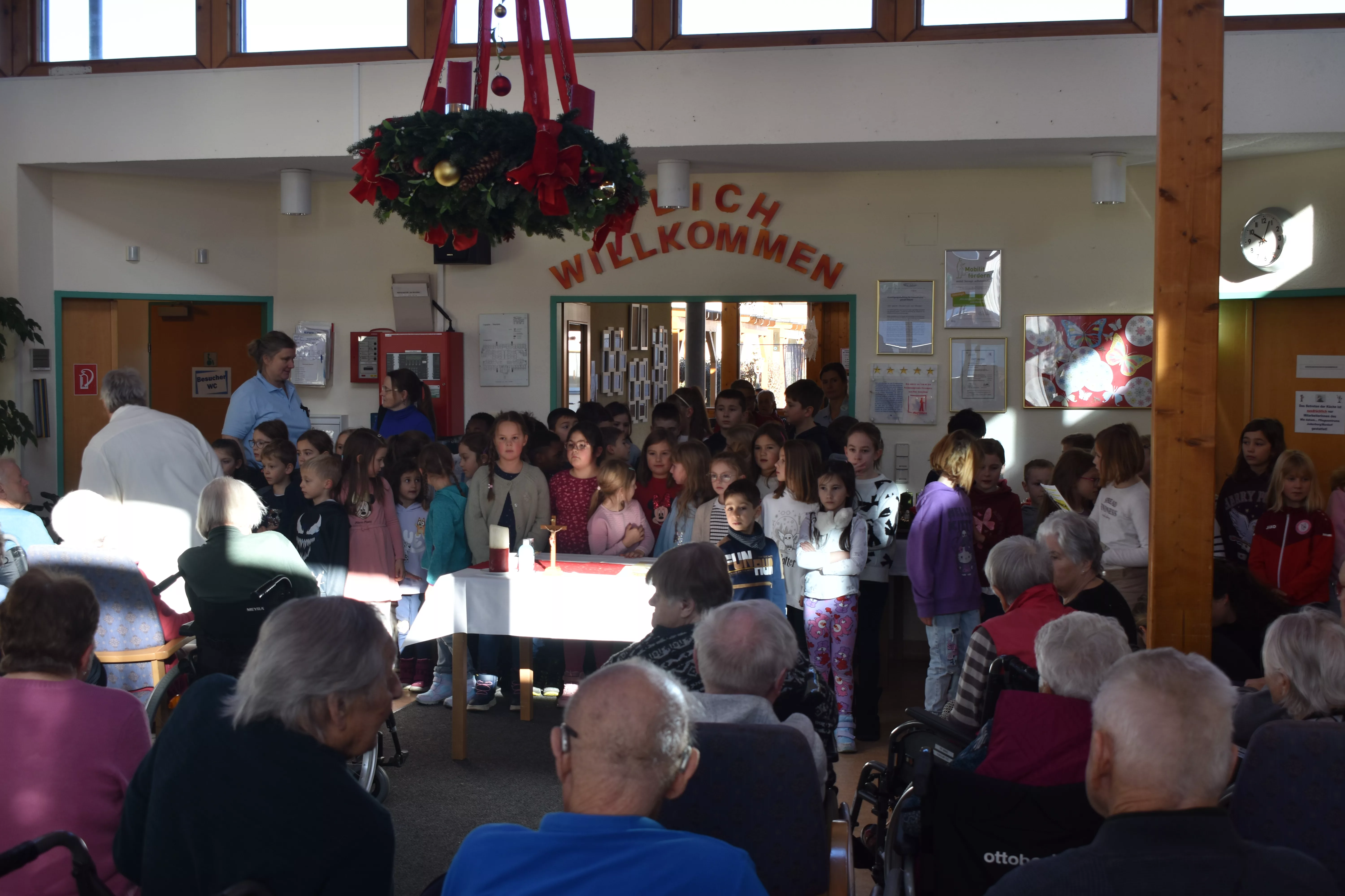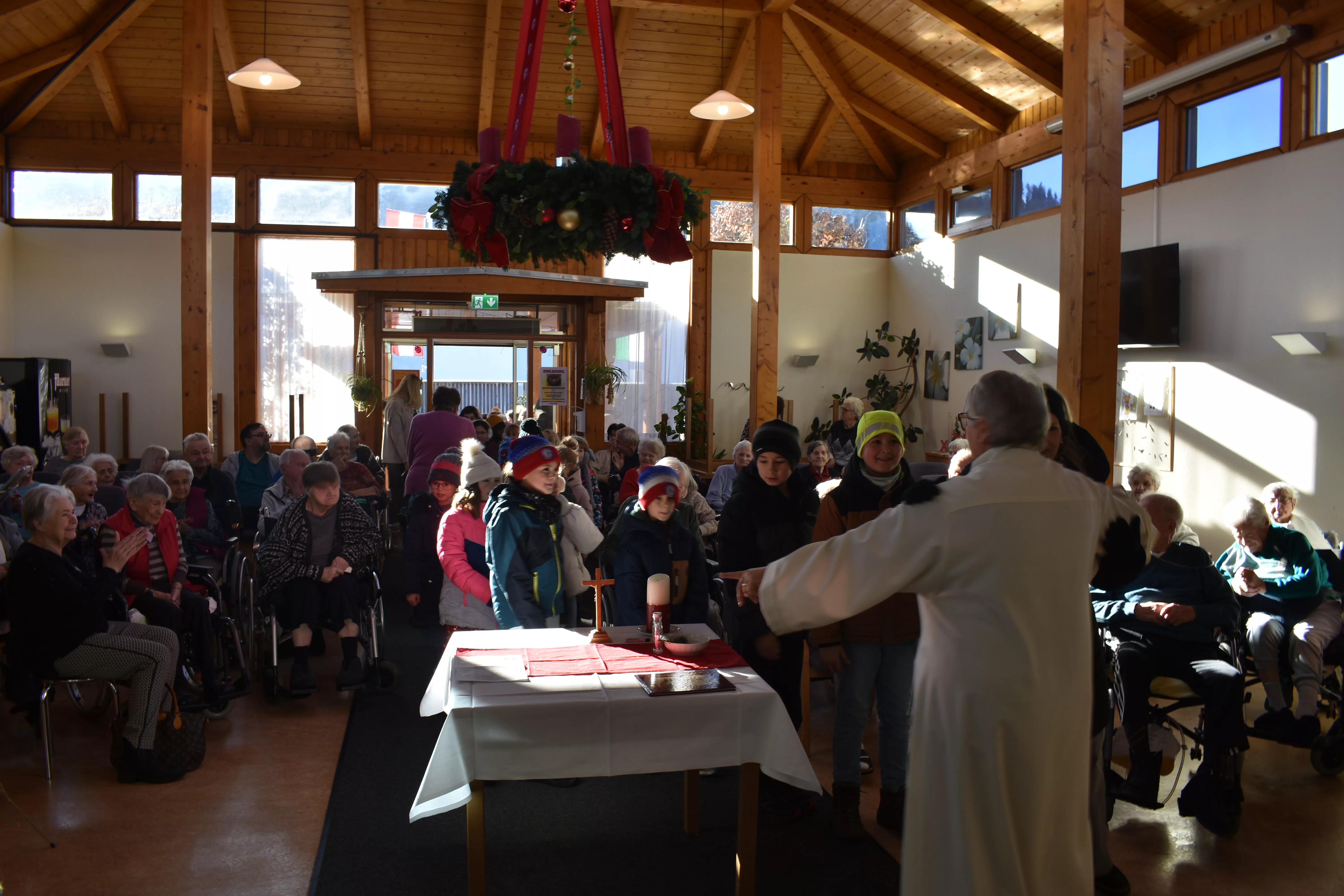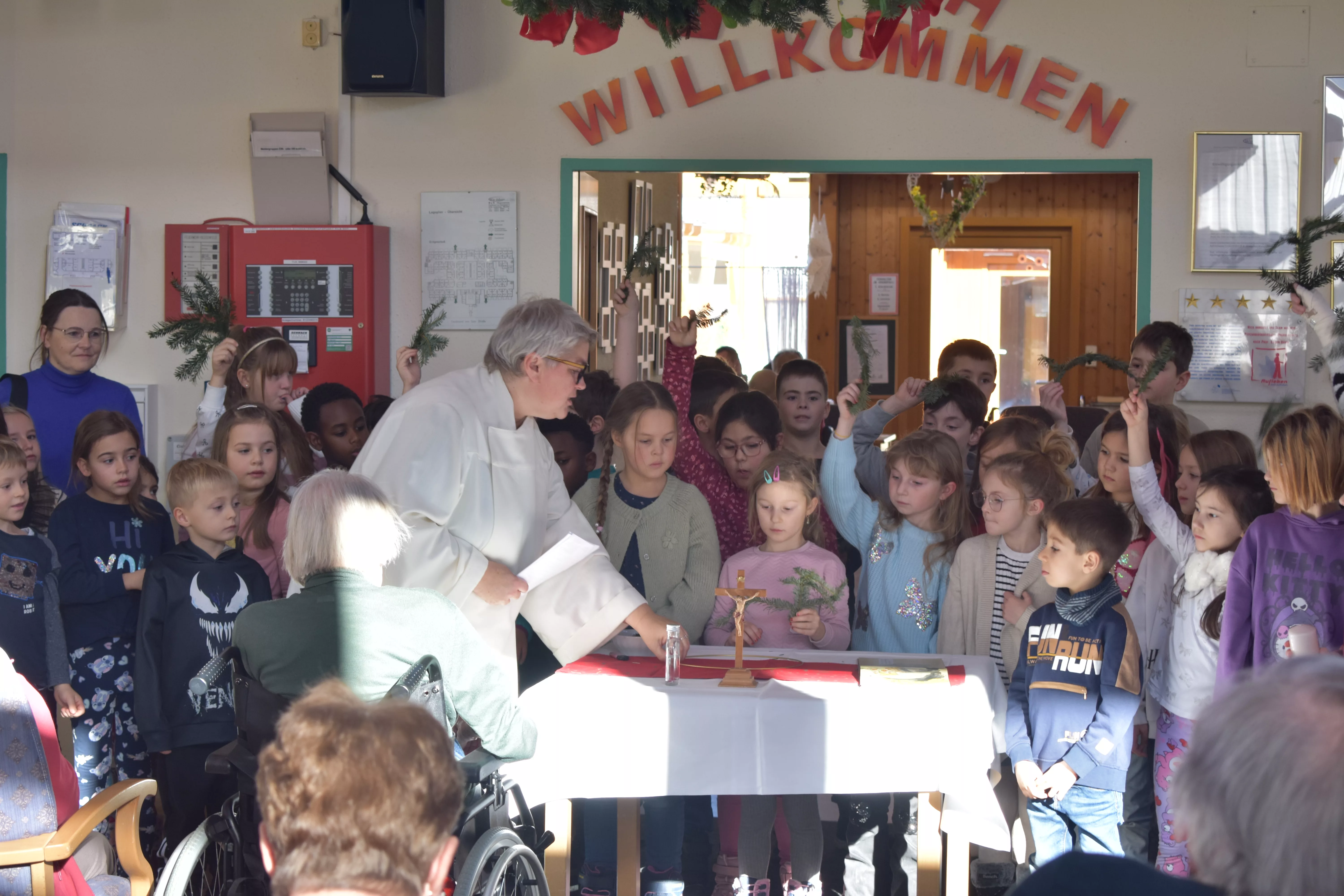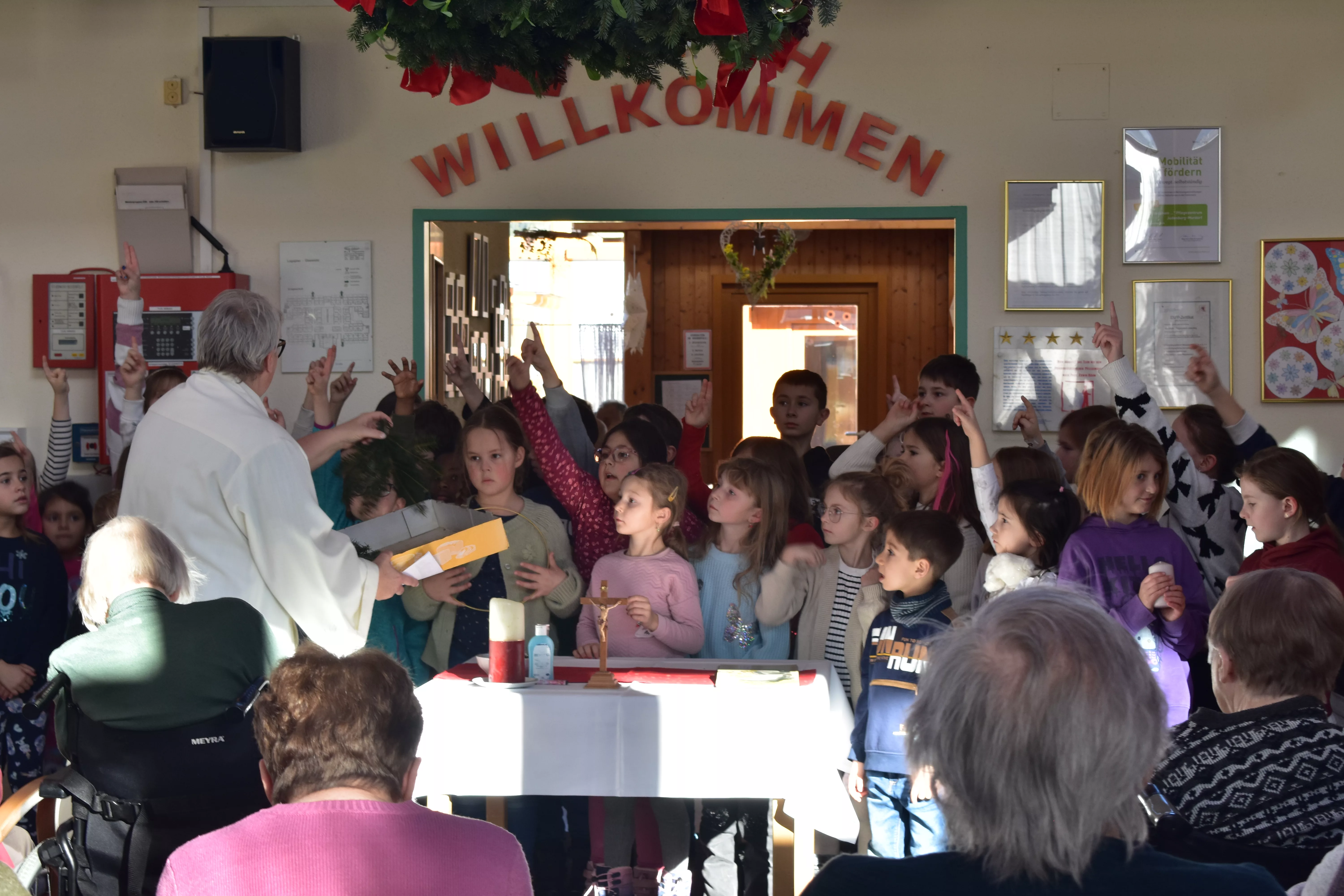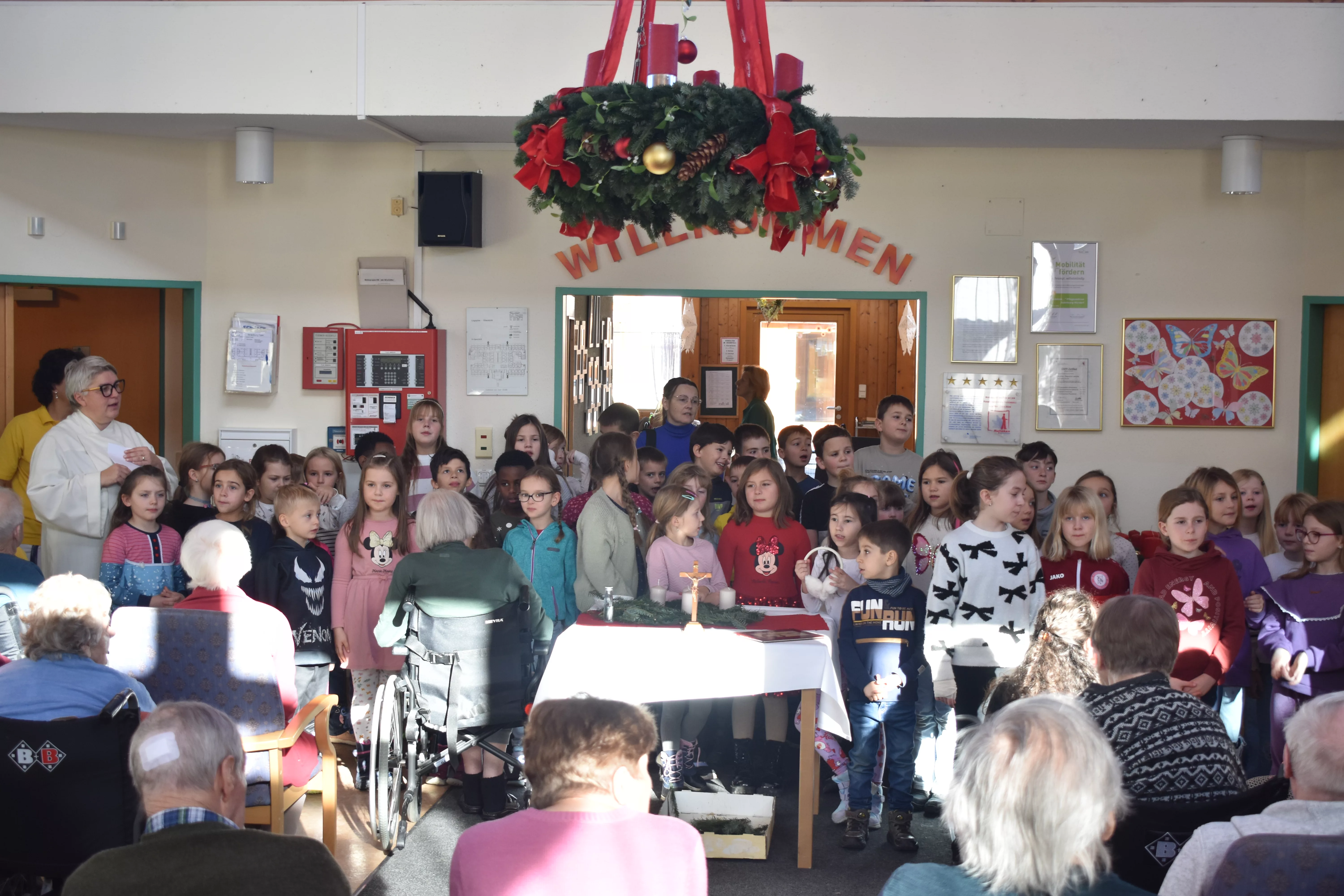 Unsere Pflegeheimseelsorgerin Frau Michaela Horn-Perner gestaltete mit den SchülerInnen der Voksschule Lindfeld einen eigenen Adventkranz und weihte danach mit Mathias die von unserer Seniorenanimateurin Frau Anita Paratusic und den BewohnerInnen selbst gebundenen und dekorierten Tannenzweige.