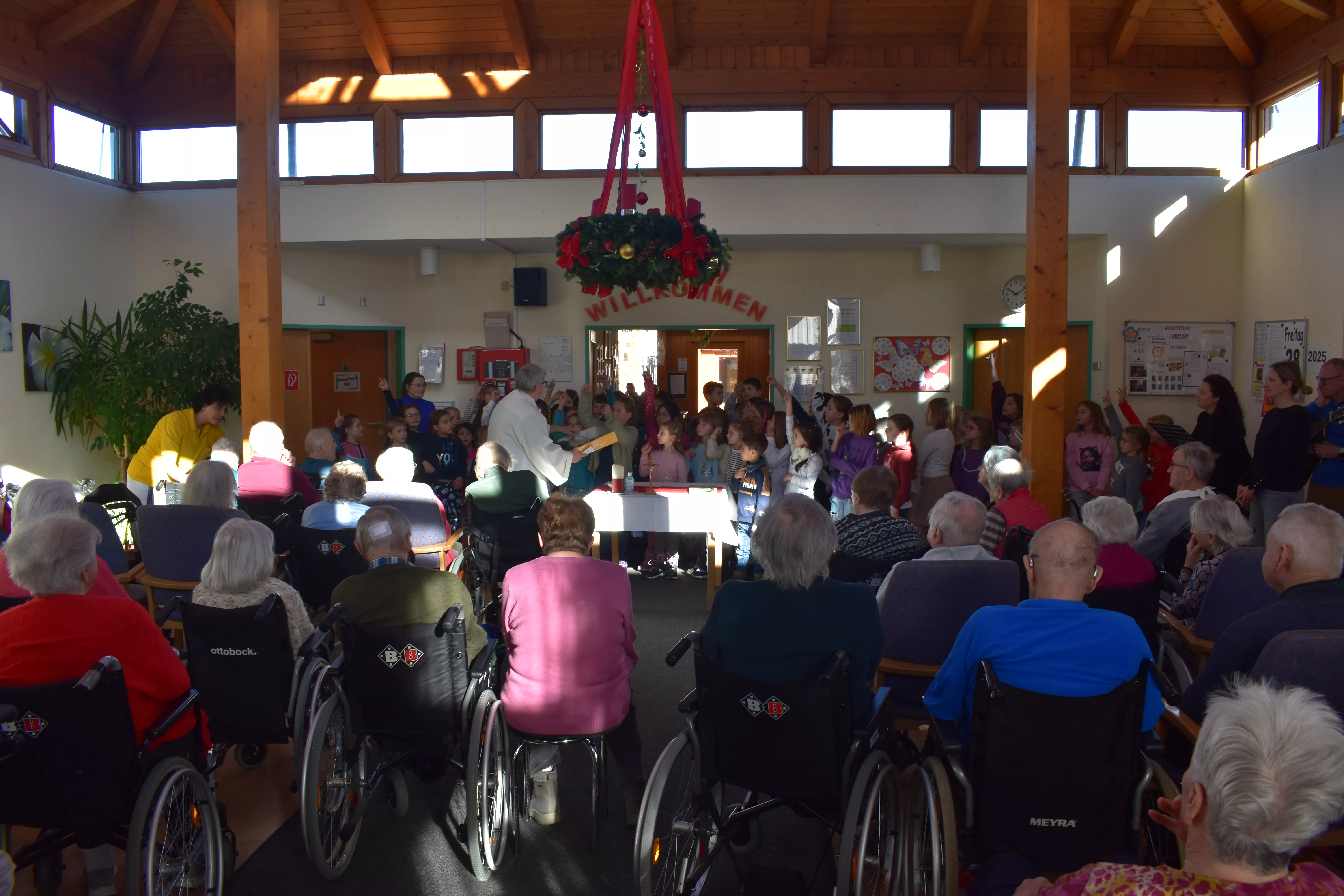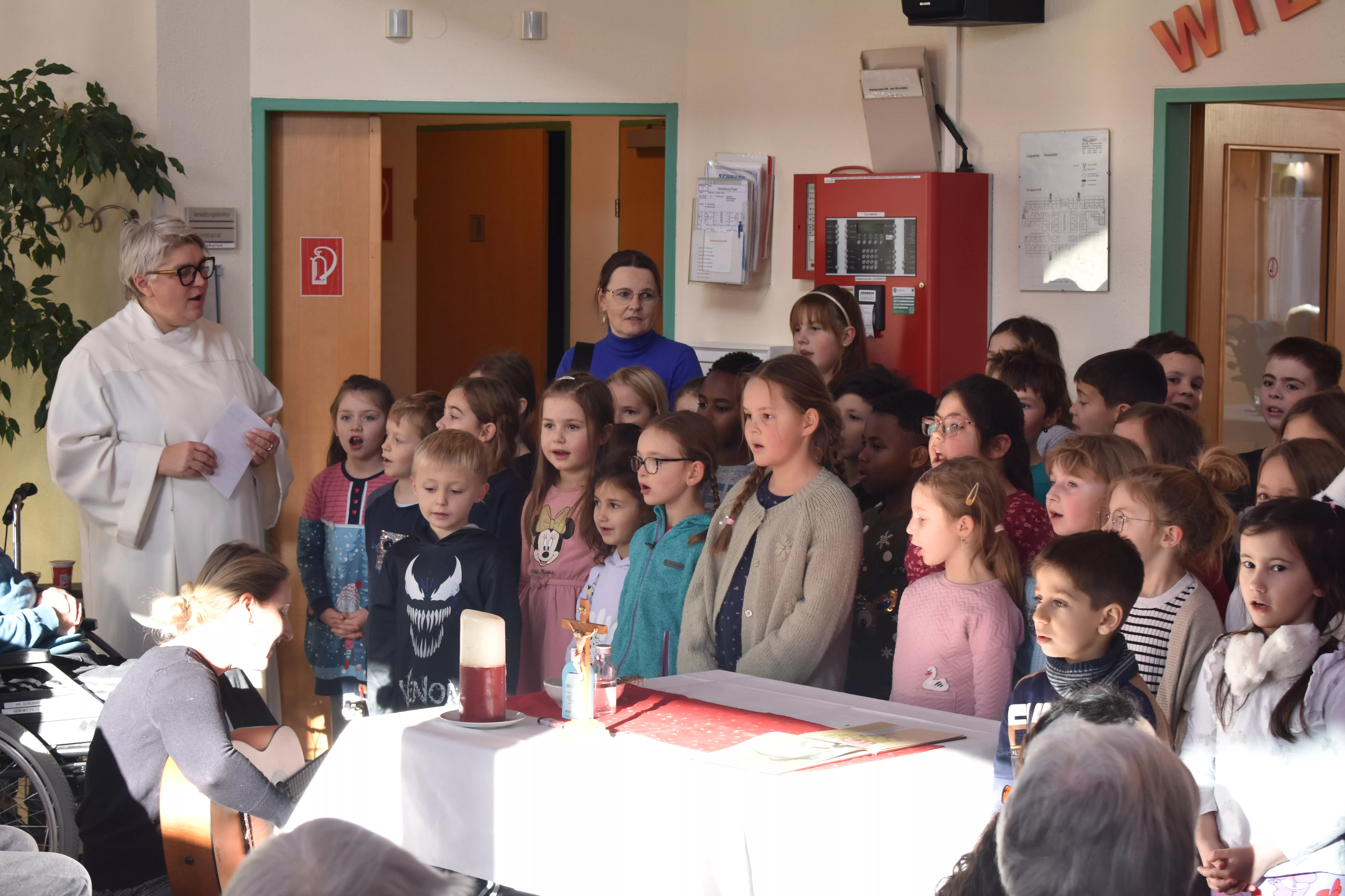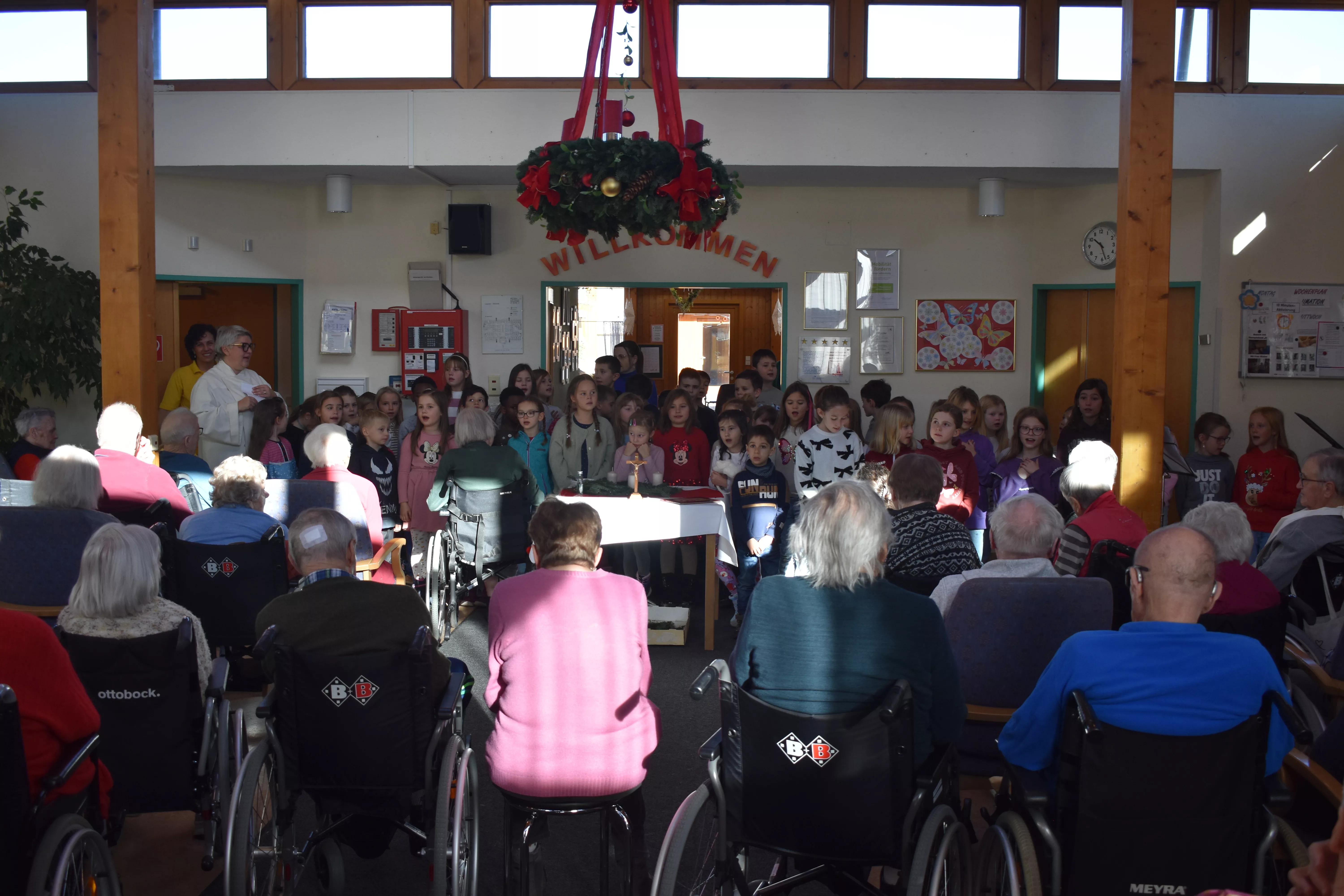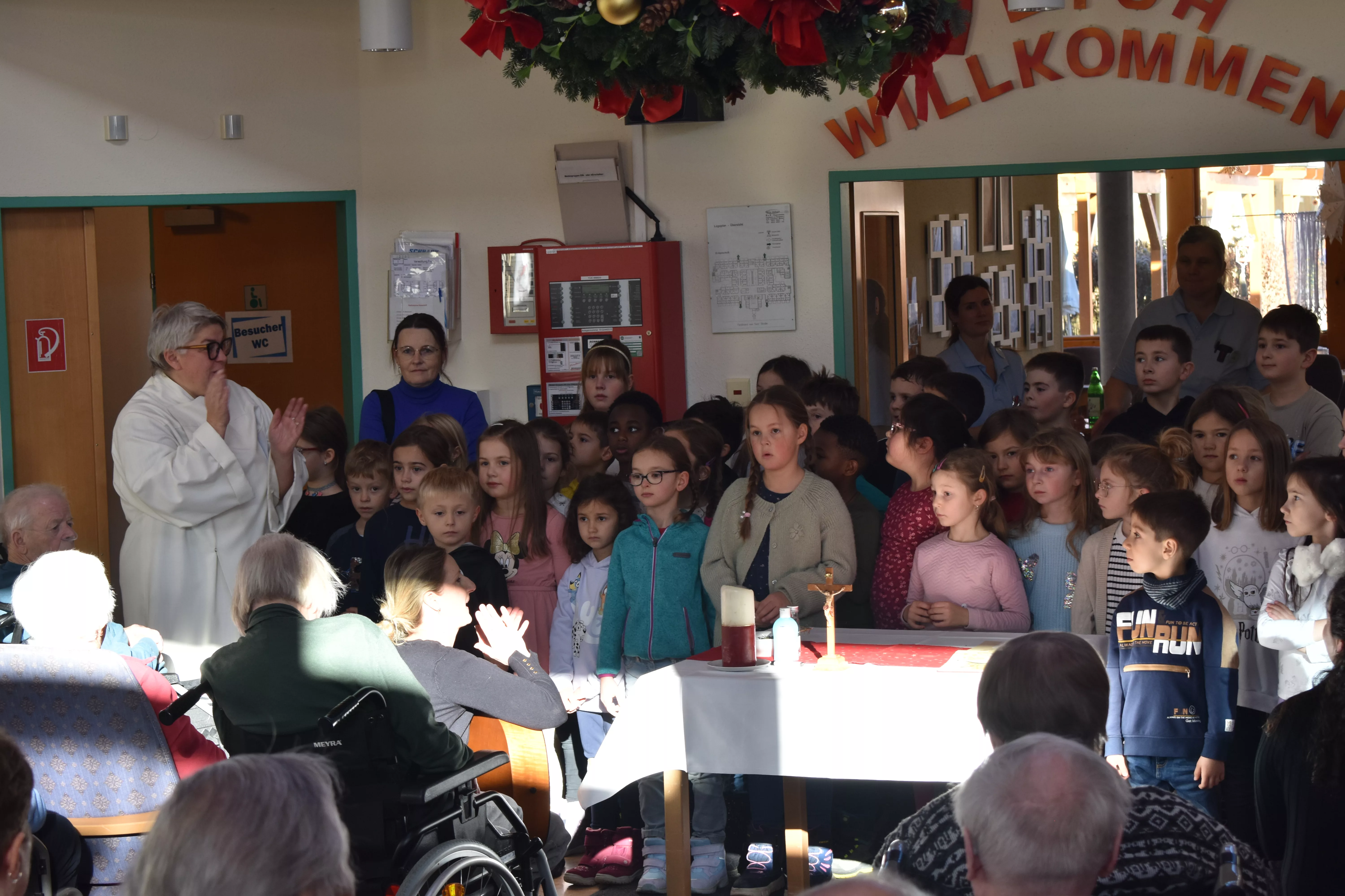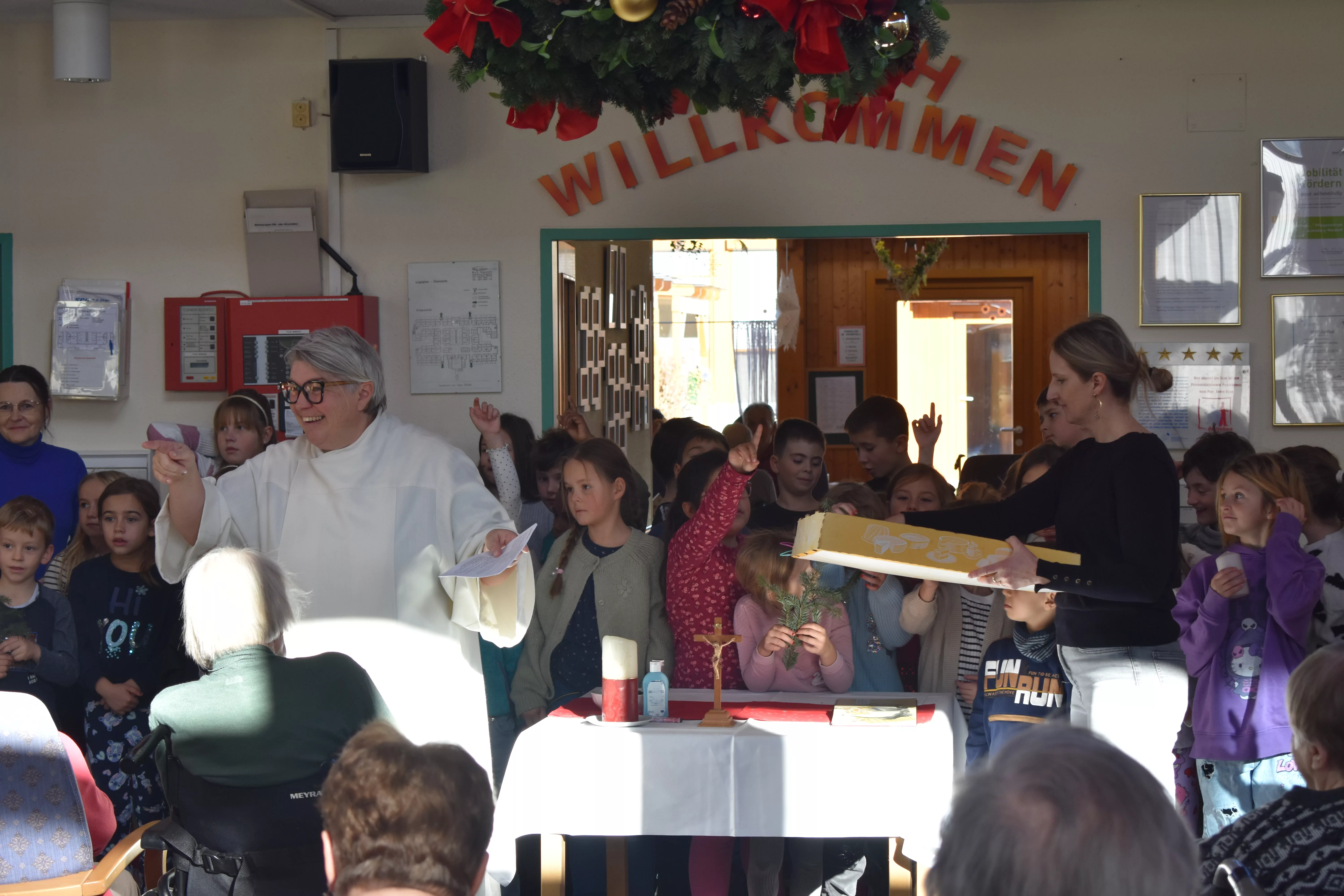 Unsere Pflegeheimseelsorgerin Frau Michaela Horn-Perner gestaltete mit den SchülerInnen der Voksschule Lindfeld einen eigenen Adventkranz und weihte danach mit Mathias die von unserer Seniorenanimateurin Frau Anita Paratusic und den BewohnerInnen selbst gebundenen und dekorierten Tannenzweige.