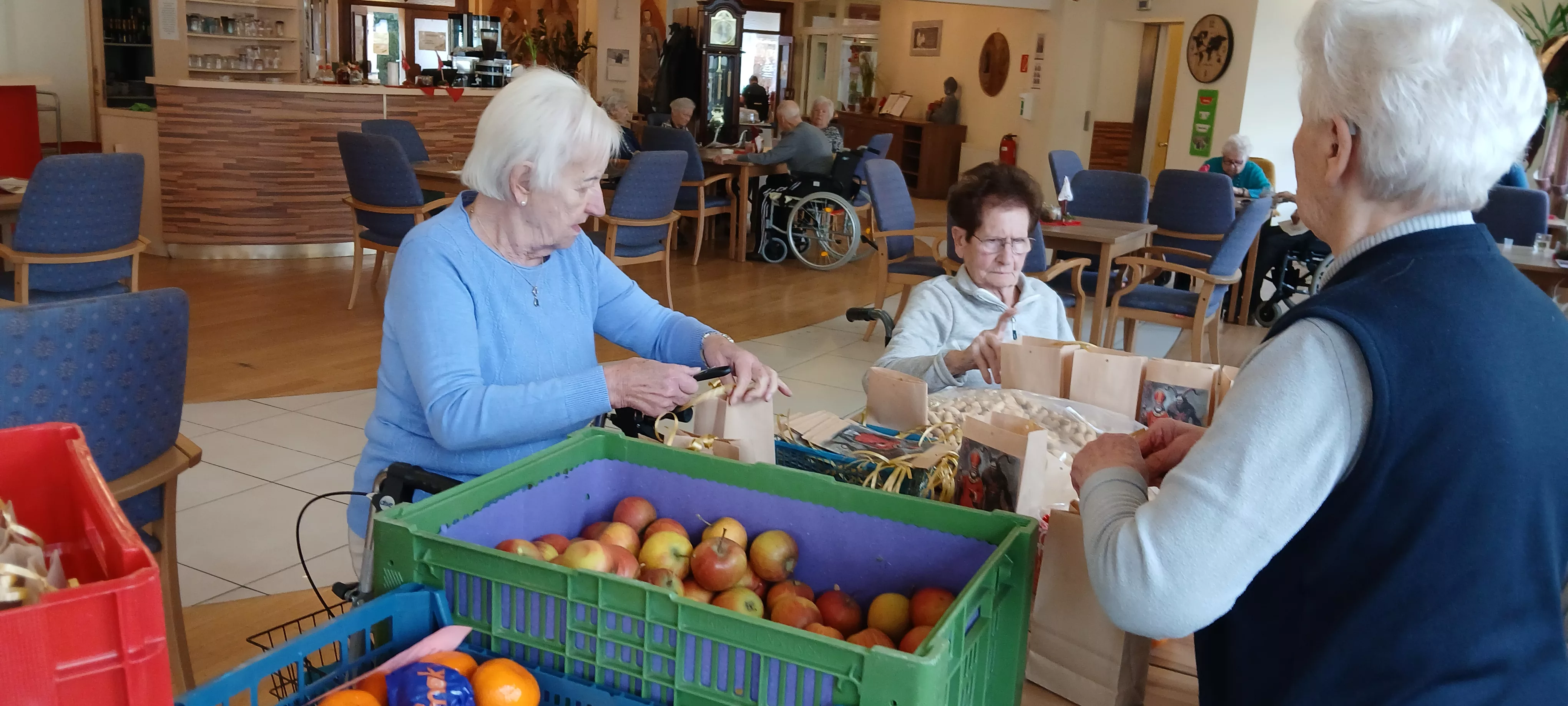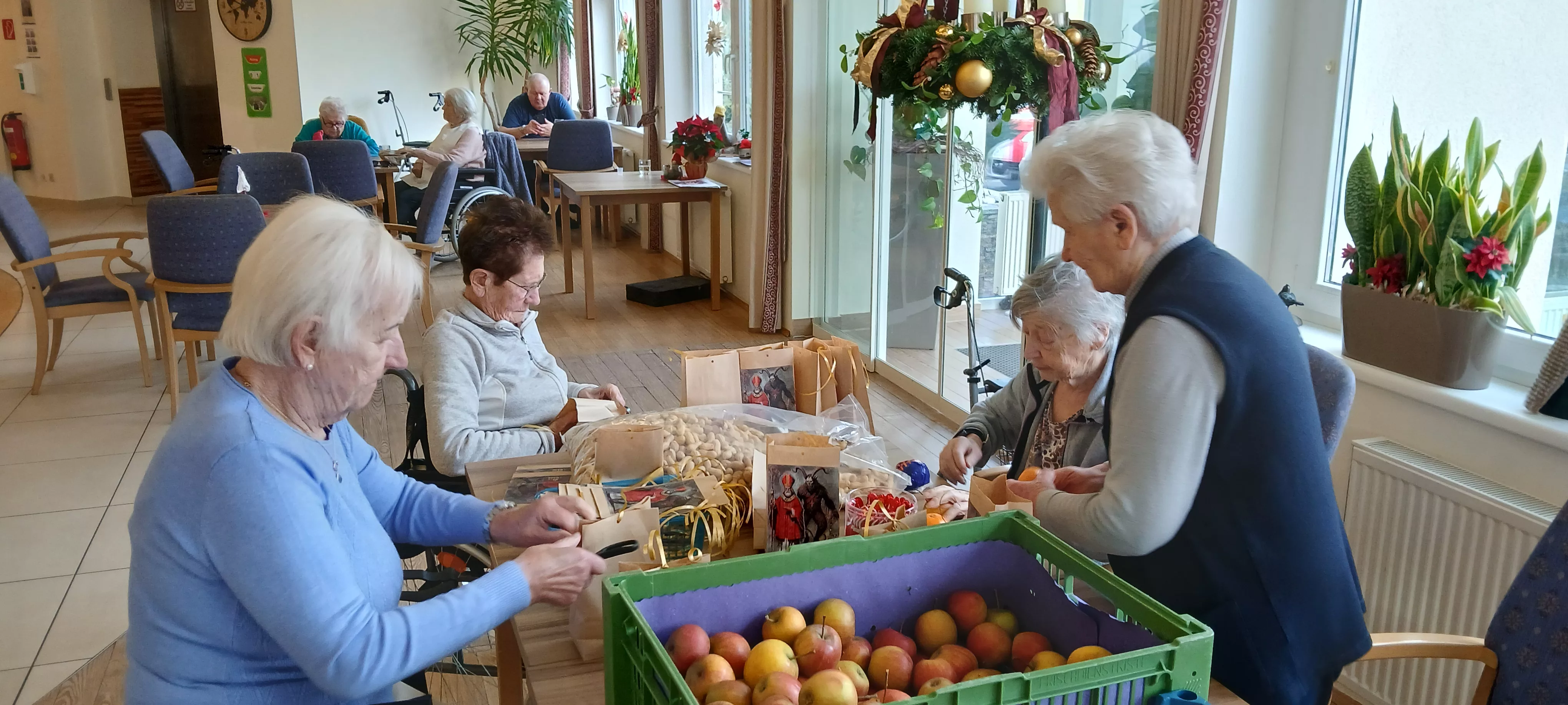 Während Süßigkeiten, Mandarinen und Nüsse ihren Platz in den Sackerln fanden, entstand eine angenehme und gemeinschaftliche Atmosphäre. Die Bewohner:innen waren mit Freude dabei und tauschten Erinnerungen an frühere Nikolaustage aus.