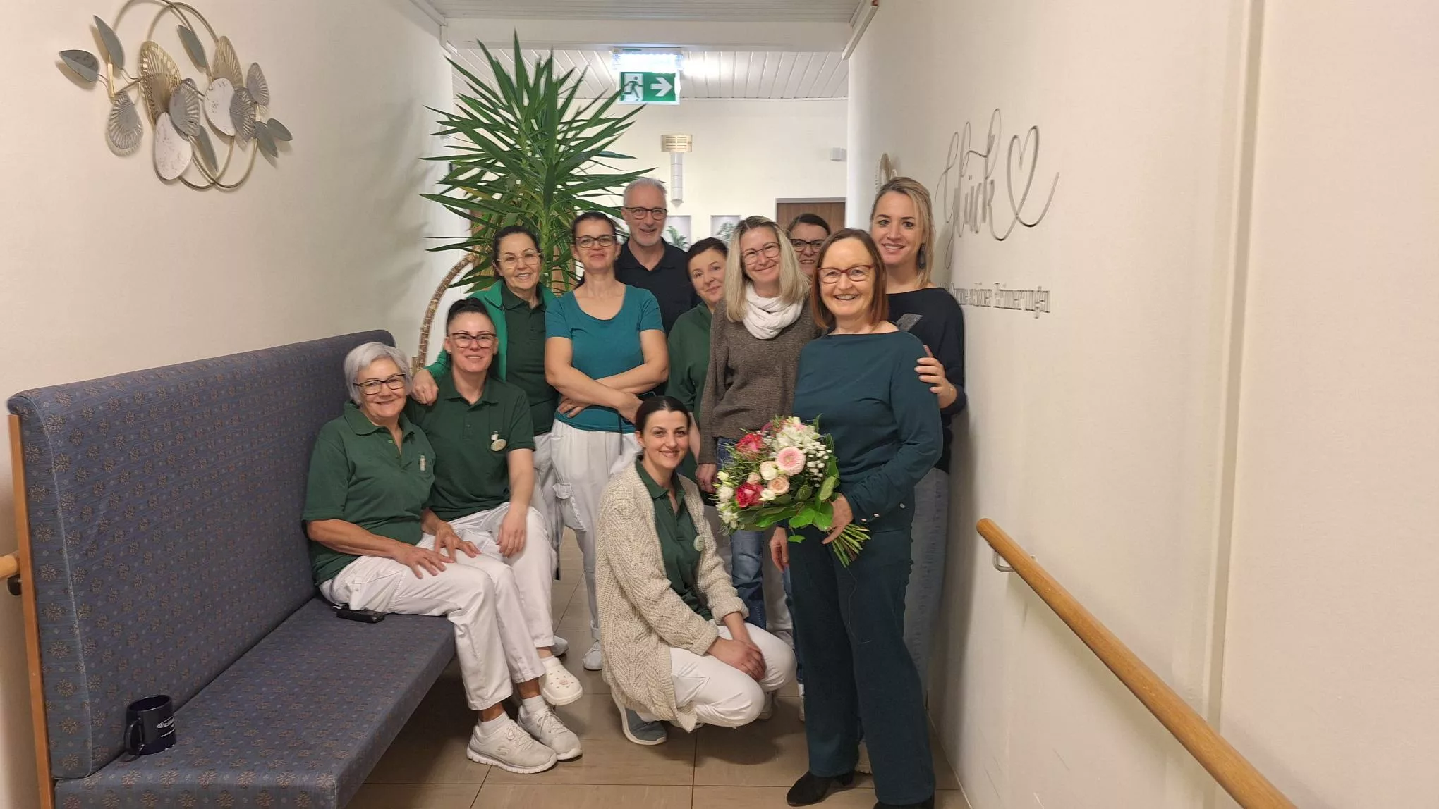 Im „Wie daham…“ Senioren-Stadthaus Judenburg standen heute besondere Anlässe im Mittelpunkt. Frau Irmgard Dohr absolvierte ihren letzten Arbeitstag und verabschiedete sich in den Vorruhestand. Als Zeichen der Anerkennung wurde ein Jubiläumsordner überreicht, ergänzt durch ein gemeinsames Erinnerungsfoto.