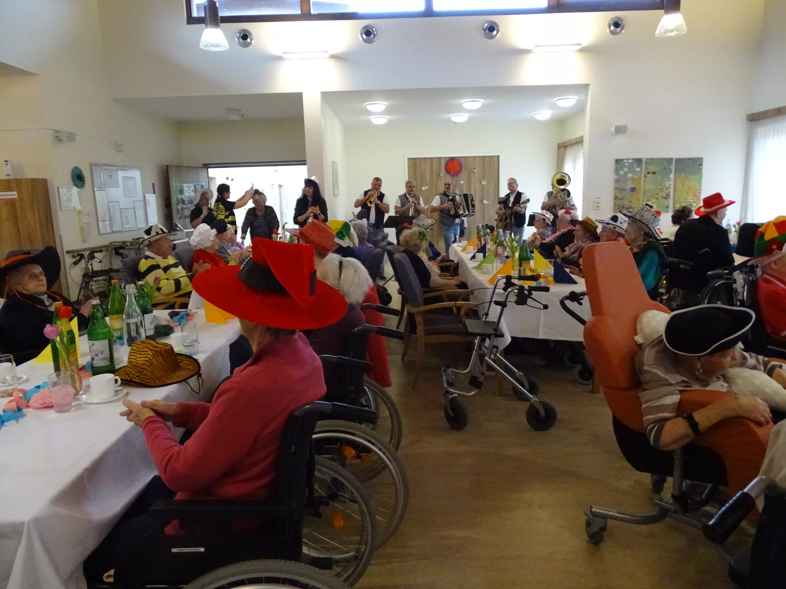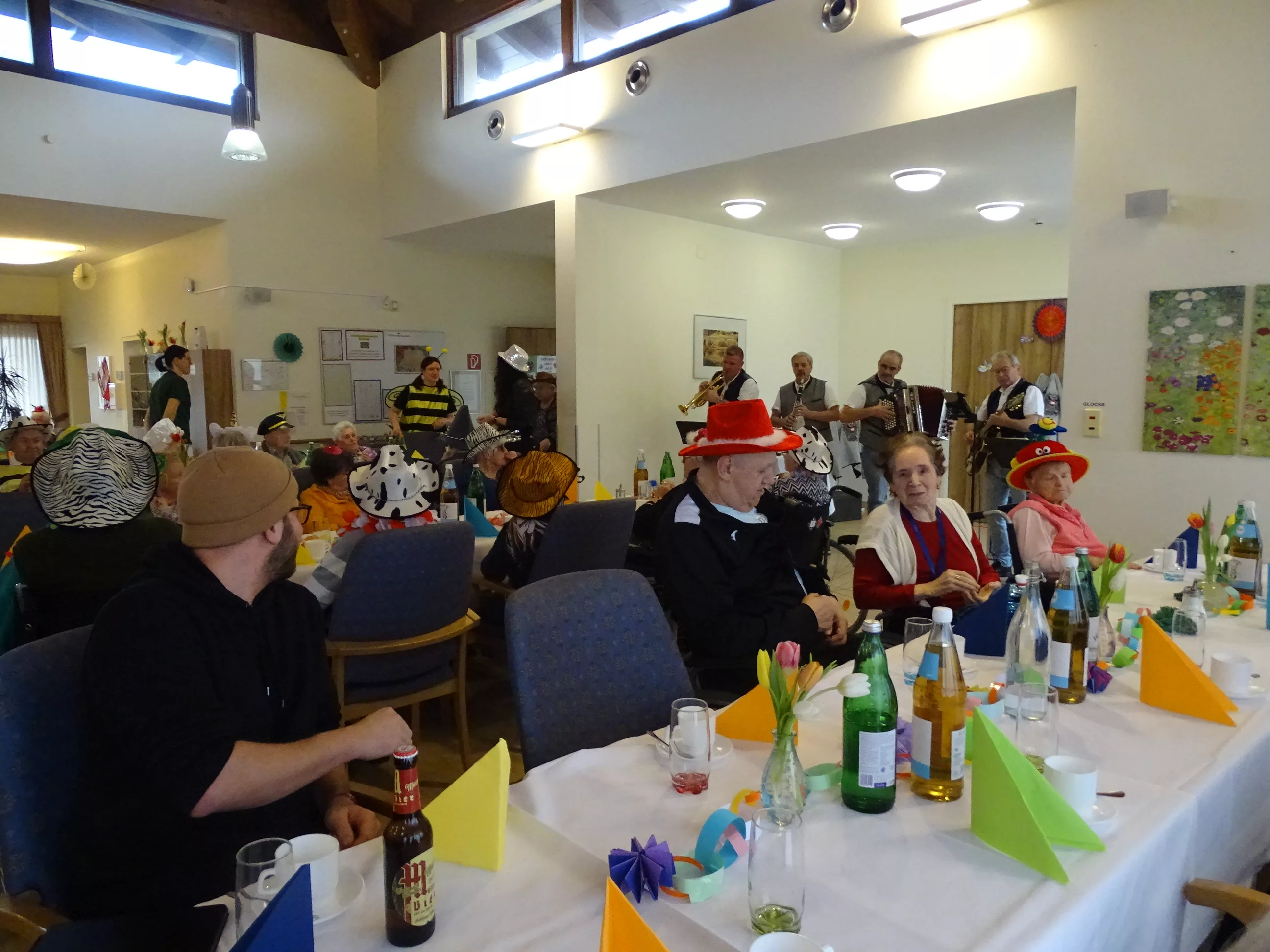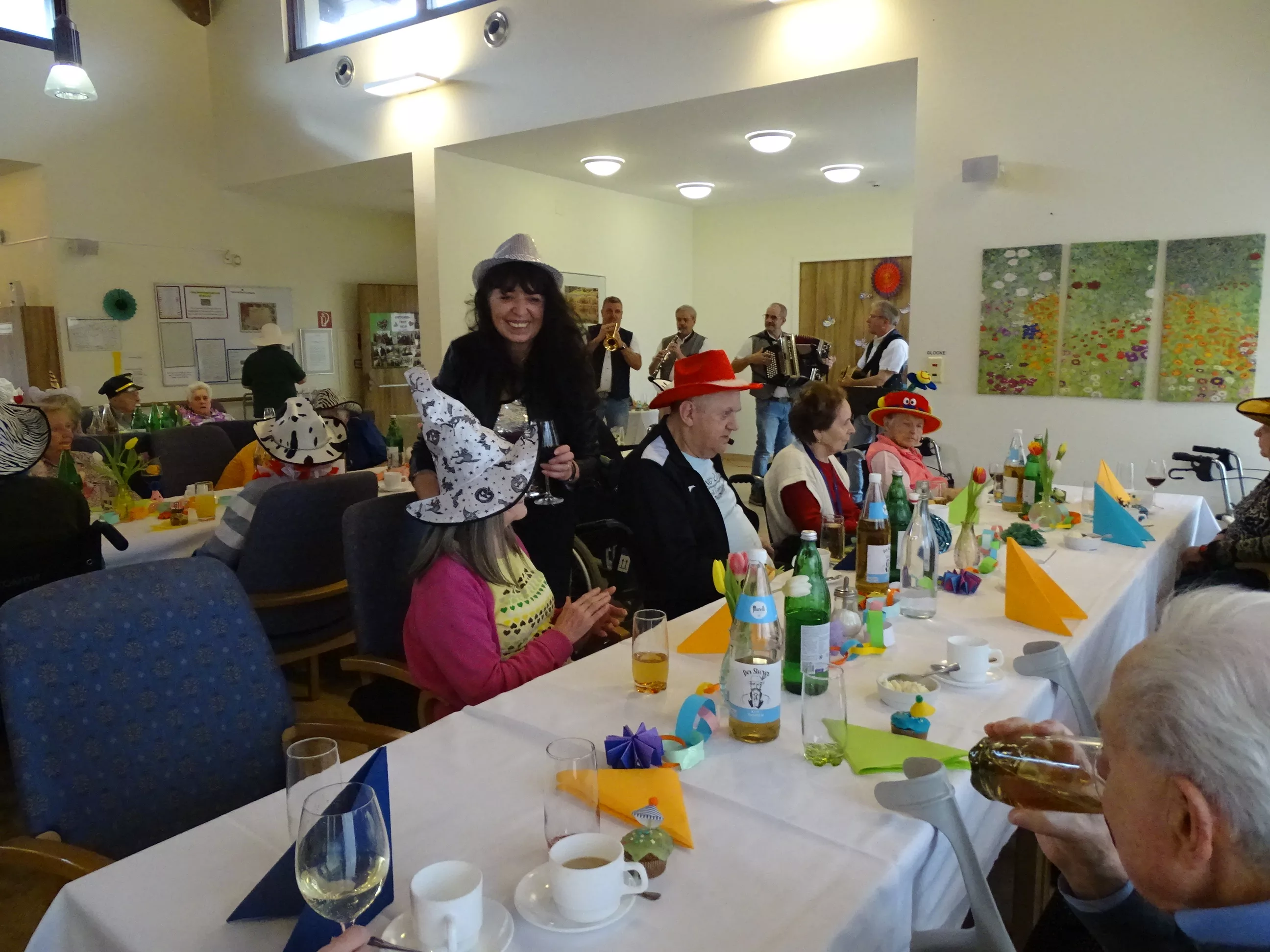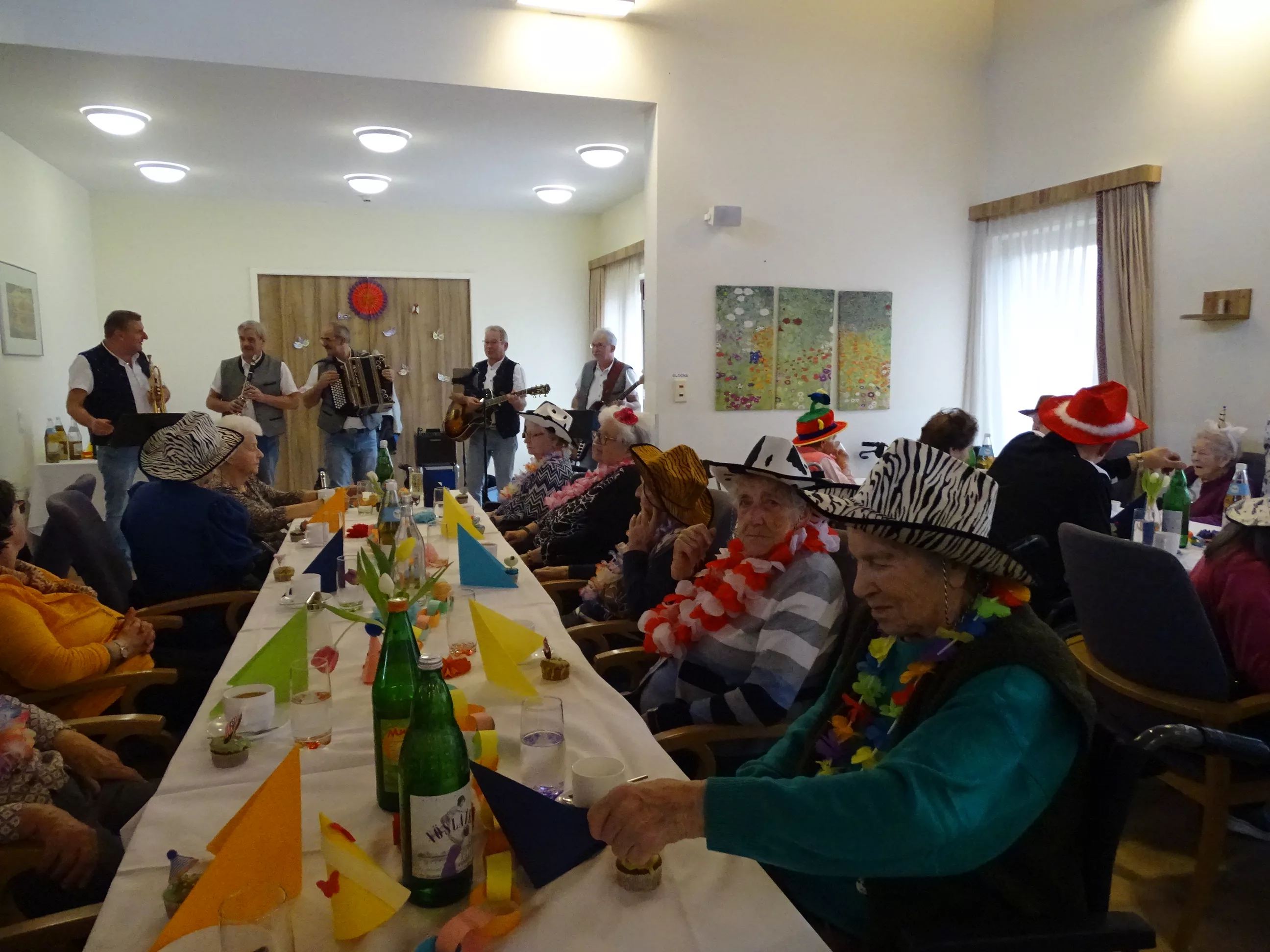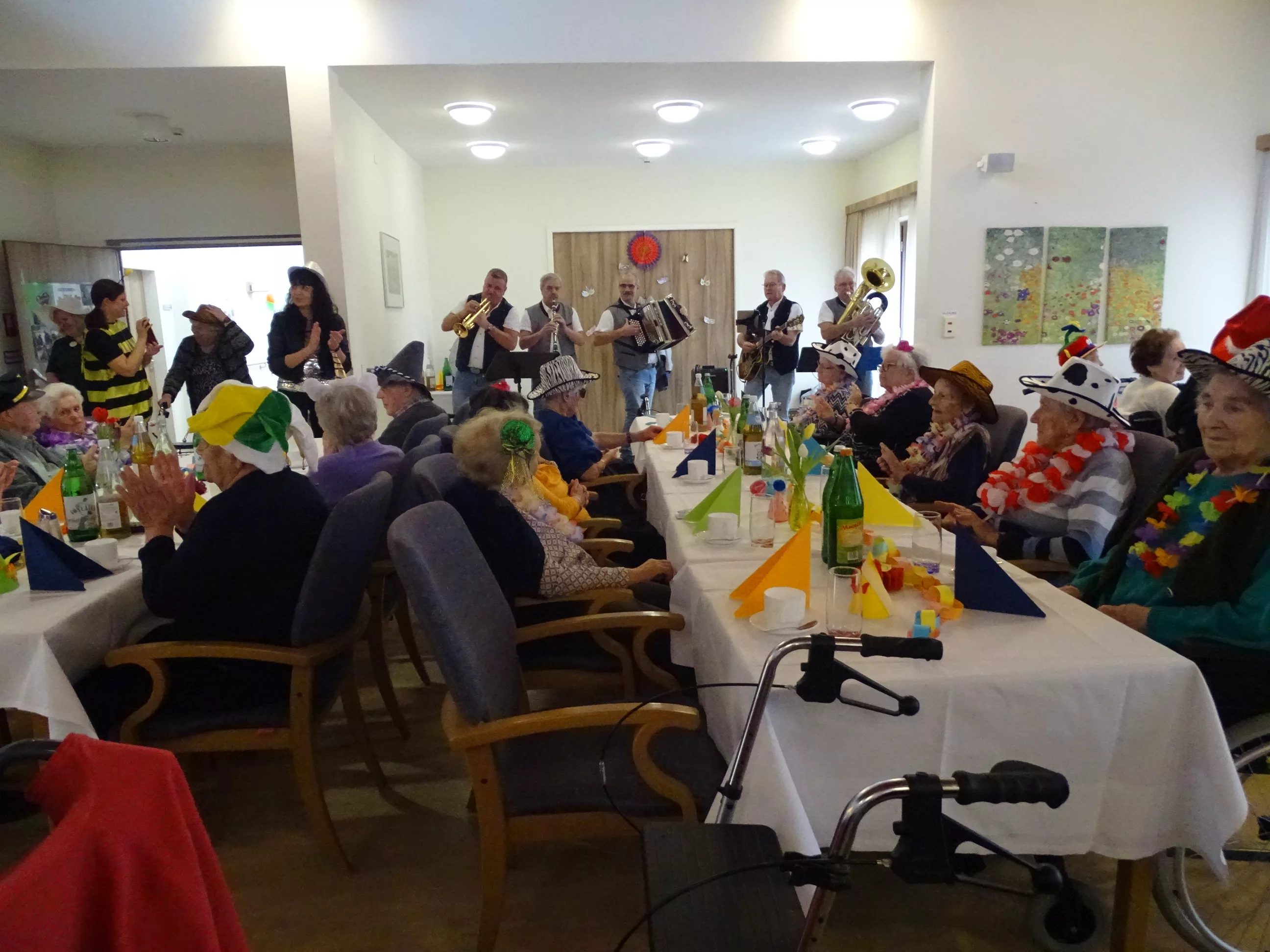 Auch im Generationenpark Zeltweg hat der Fasching Einzug gehalten! Am 11. Feber feierten unsere Bewohner:innen und unsere Mitarbeiter:innen Fasching. Wir wurden besucht von der Biene Maya und von Obelix! Unsere BewohnerInnen haben sich mit tollen Hütten geschmückt! Die musikalische Umrahmung gestalteten die Breitenegger, sie brachten viel Schwung in unser Haus! Bei Musik, Gesang und Wein feierten wir den ganzen Nachmittag, es wurde getanzt, geschunkelt und viel gelacht! Es war wieder ein tolles und lustiges Fest im Generationenpark Zeltweg!