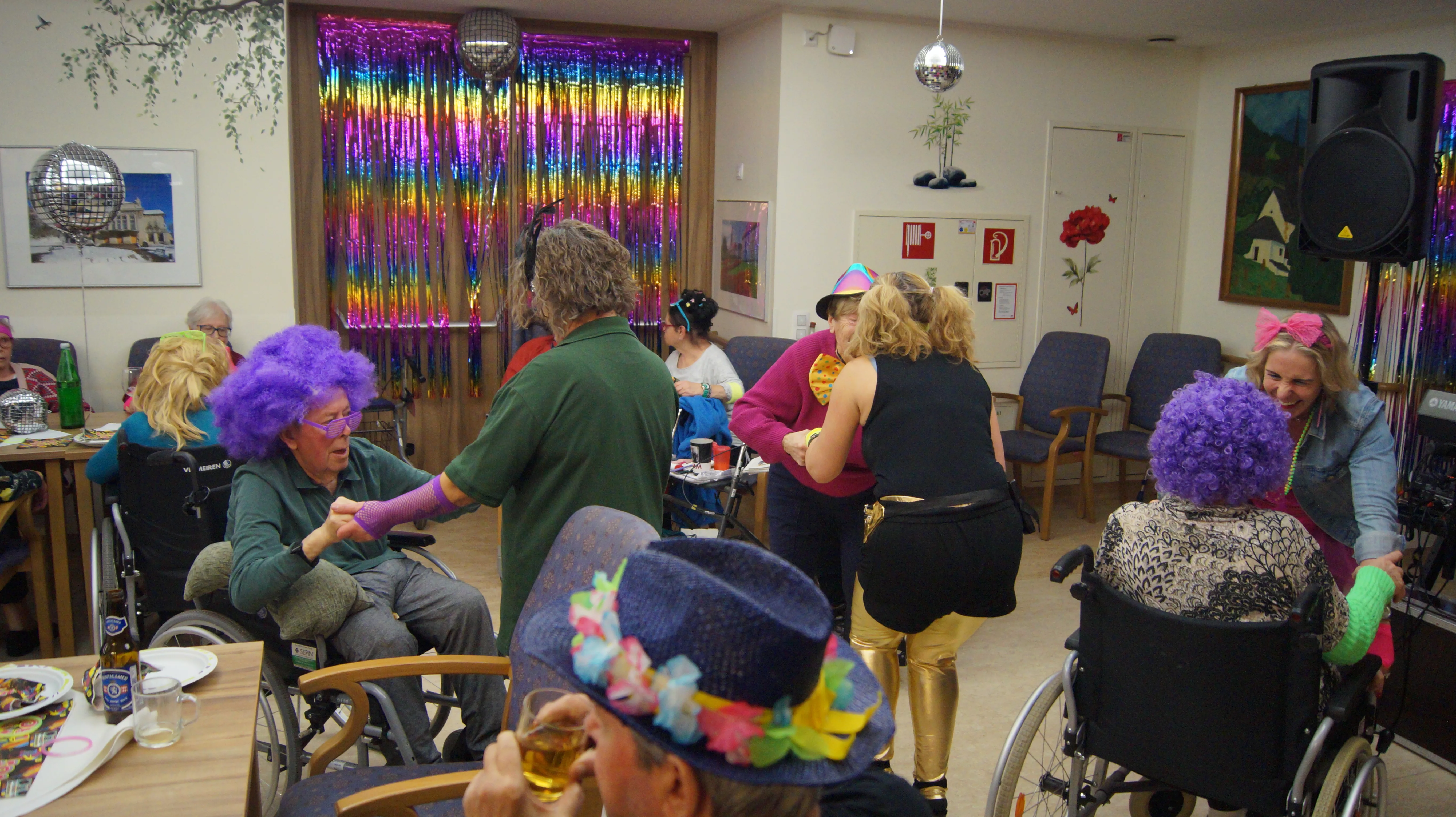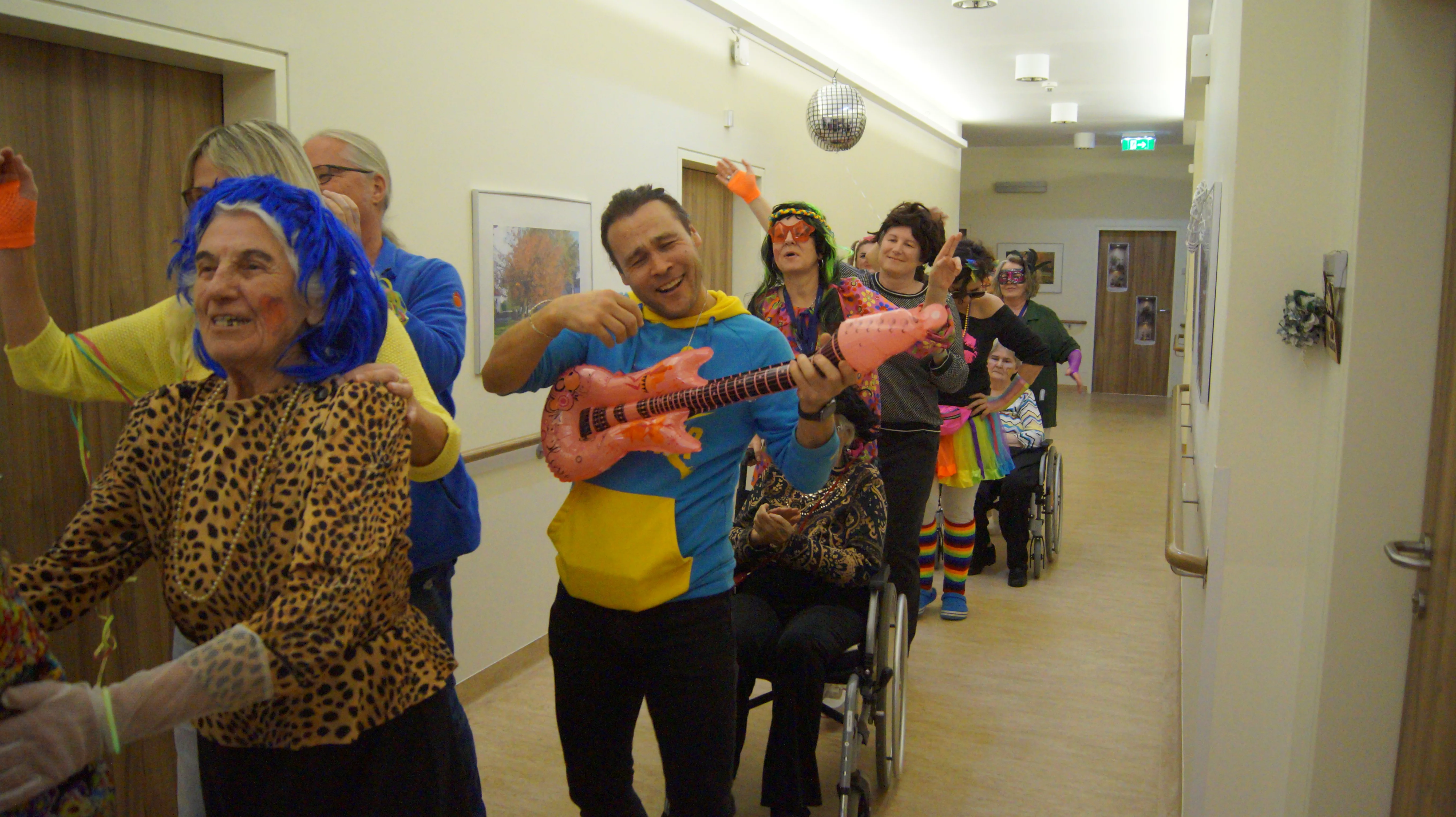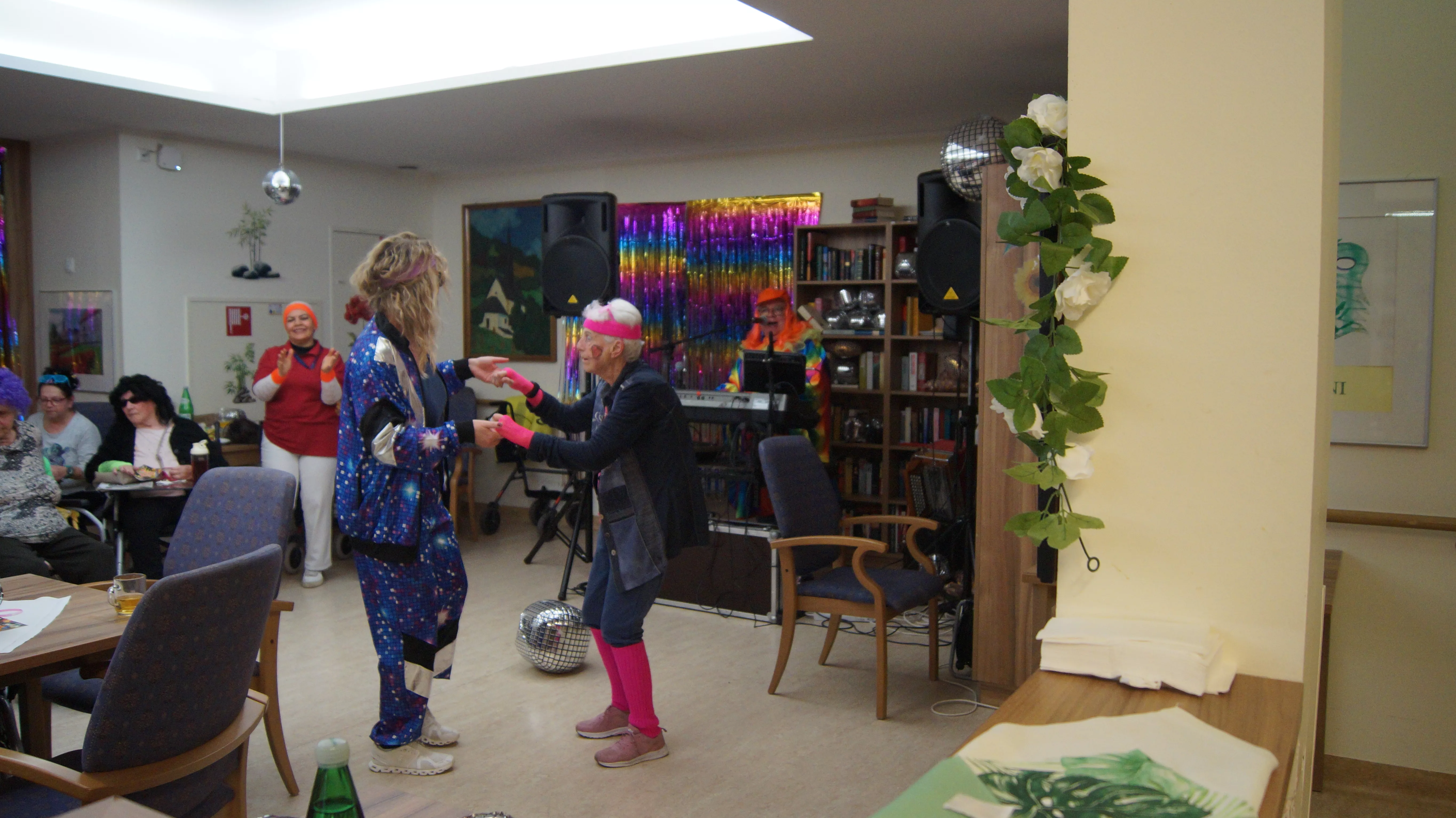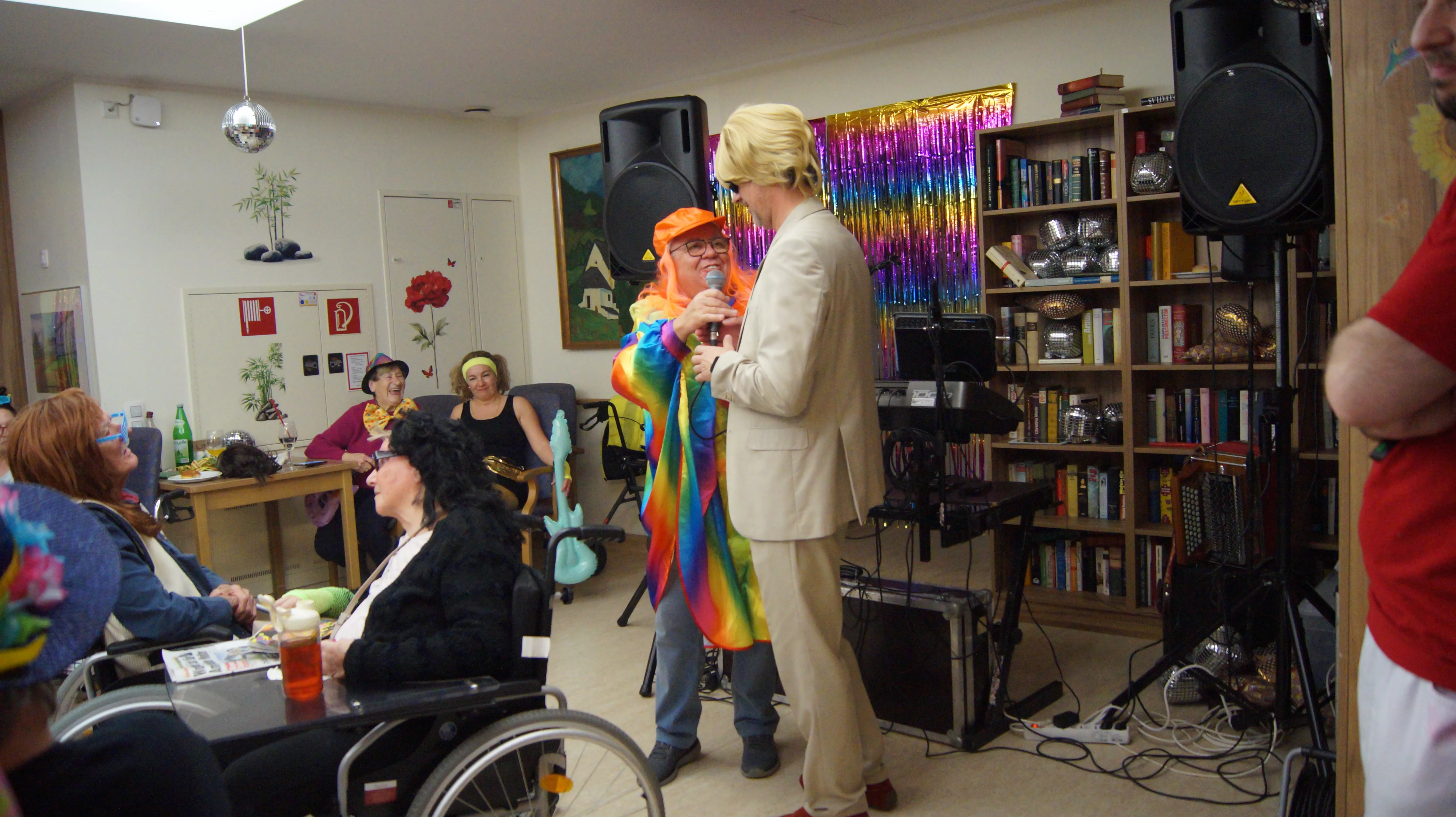 Nach Lust und Laune, verkleidet oder nicht, kamen zahlreiche Bewohner:innen aller Wohnbereiche wie auch Mieter:innen unserer Pflegewohnungen zum gemeinsamen, lustigen Feiern, Plaudern und Tanzen zusammen. Für beste und stimmungsvolle Partylaune sorgte mit vollem Einsatz und Engagement unser allseits bekannter Unterhalter „Krawallhansl“. Ebenso gab es eine Gesangdarbietung im Duett mit „Krawallhansl“ und unserer Wohnbereichsleitung DGKP – zu einem „Gassenhauer“ der legendären Tina Turner – „Rolling on the River“