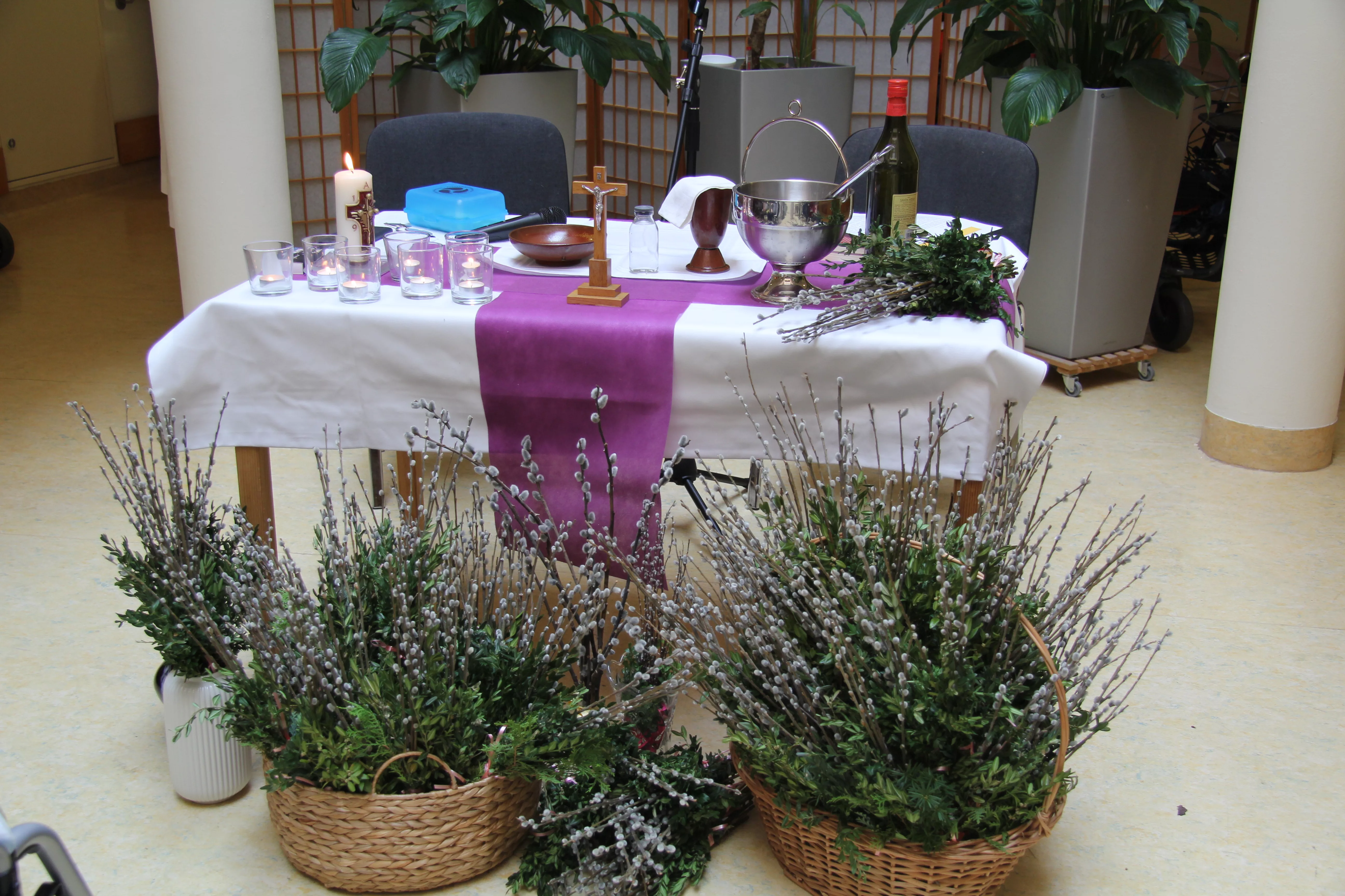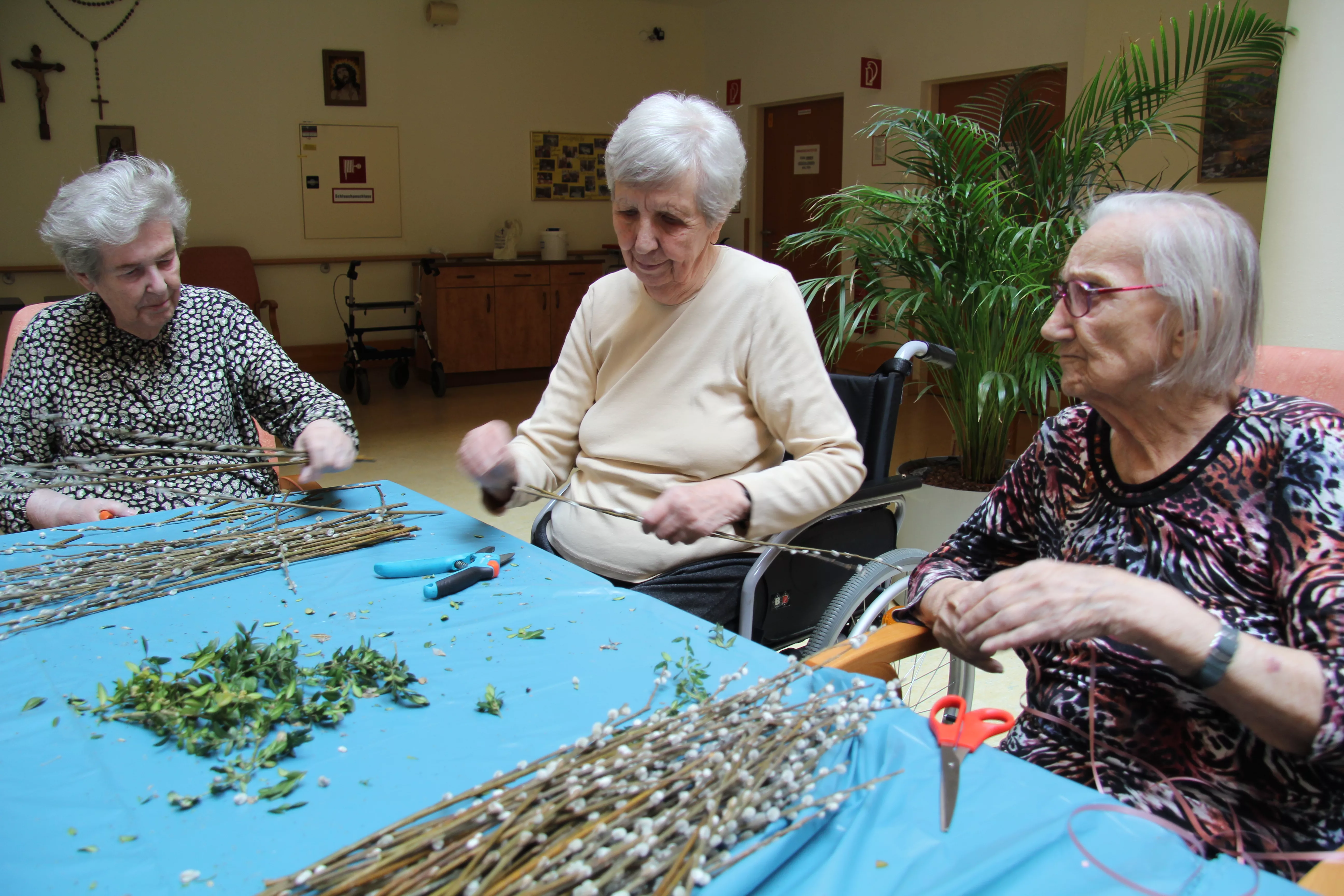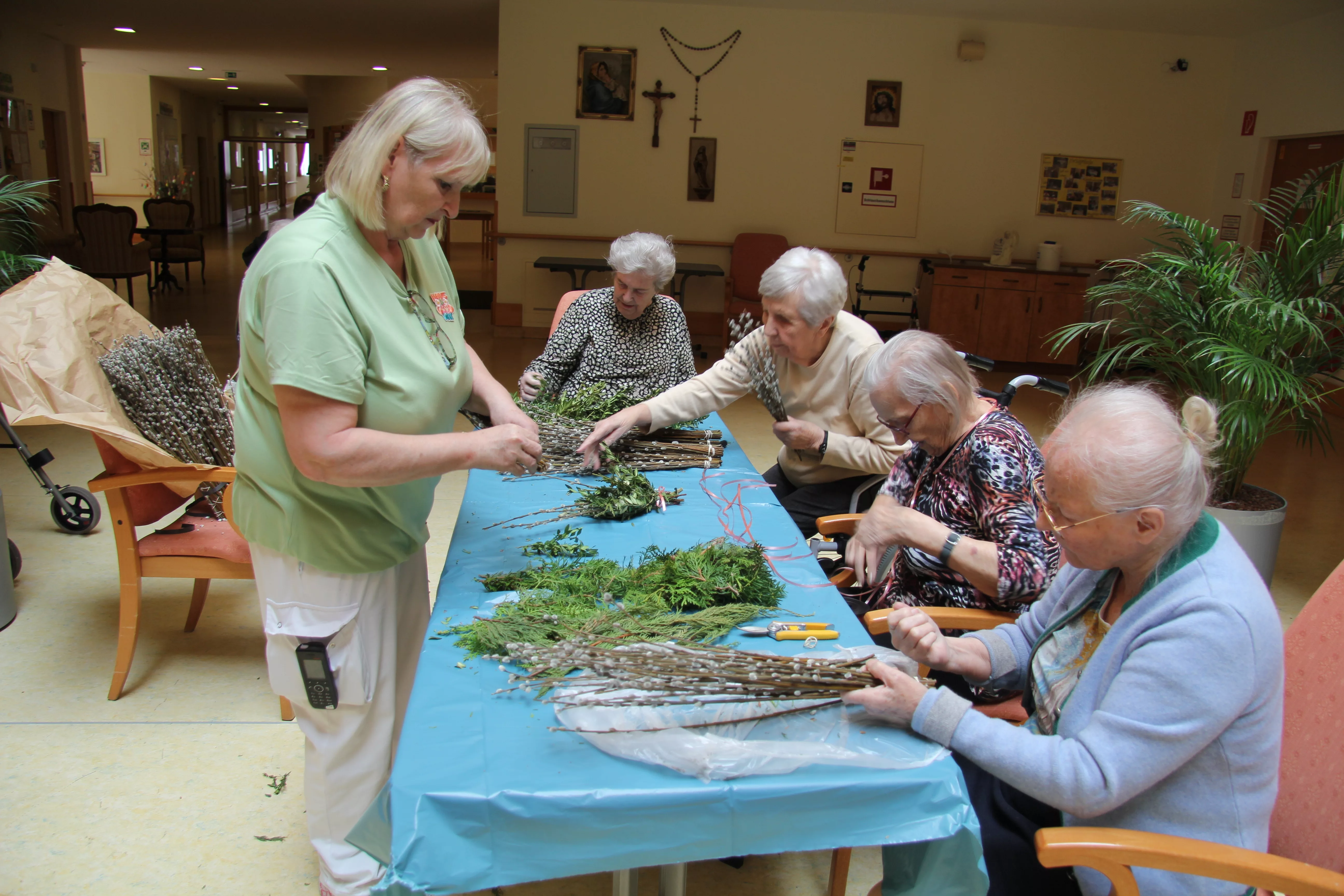 Palmkatzerl binden - Ostermesse Traditionell werden die Palmbuschen von unseren BewohnerInnen selbst gebunden – dann geht es zur Palm-Weihe.